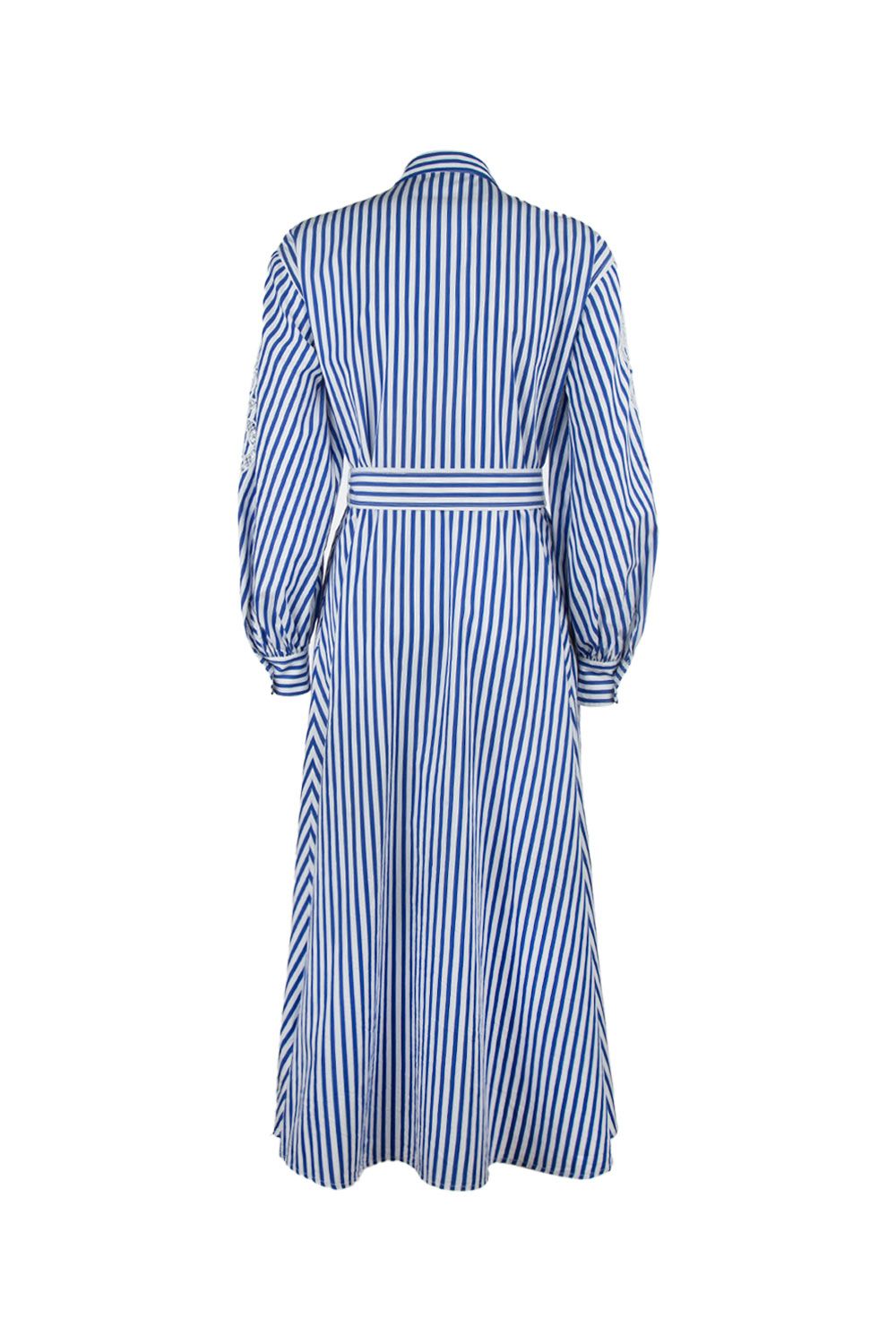 Abito lungo a chemisier in popeline di cotone bianco a righe blu con inserto in sangallo sulle maniche, vita segnata, tasche laterali e cintura removibile