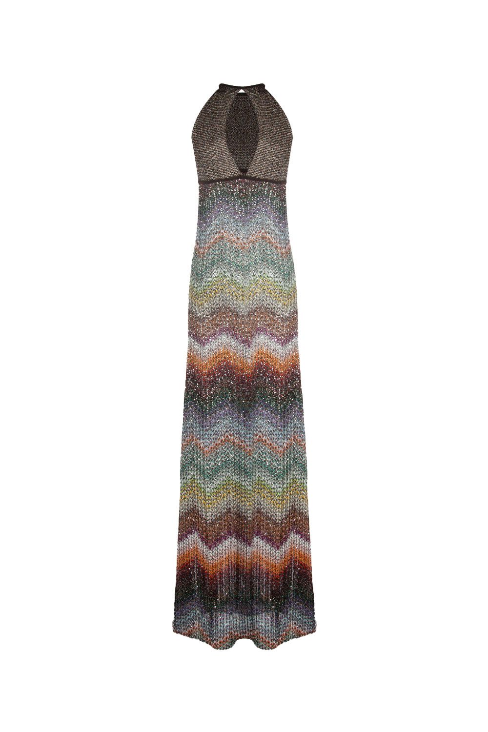 Abito lungo con scollo all’americana in maglia zig zag con paillettes