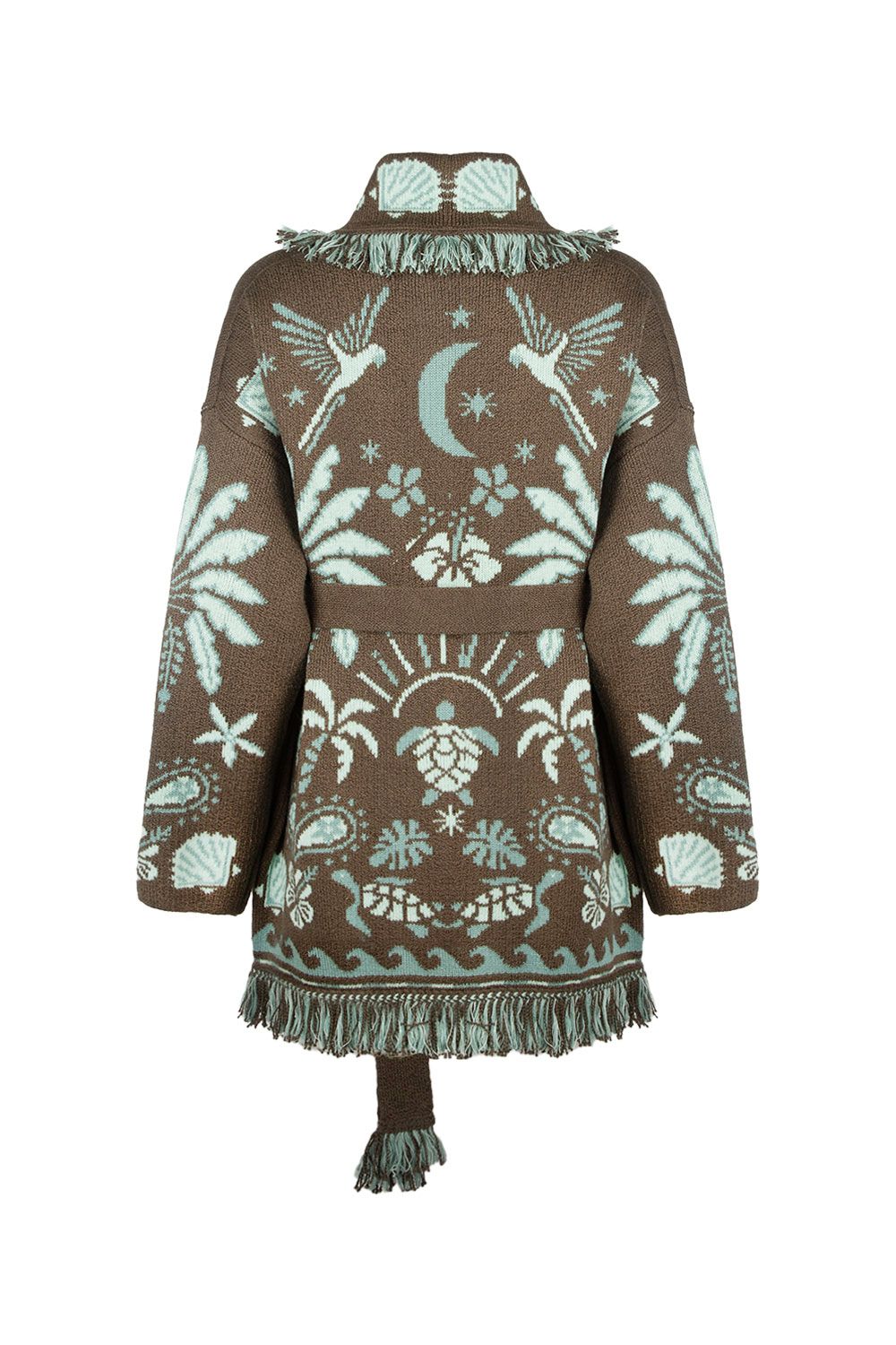 Cardigan in misto lana e cotone marrone con motivo jacquard azzurro e cintura removibile
