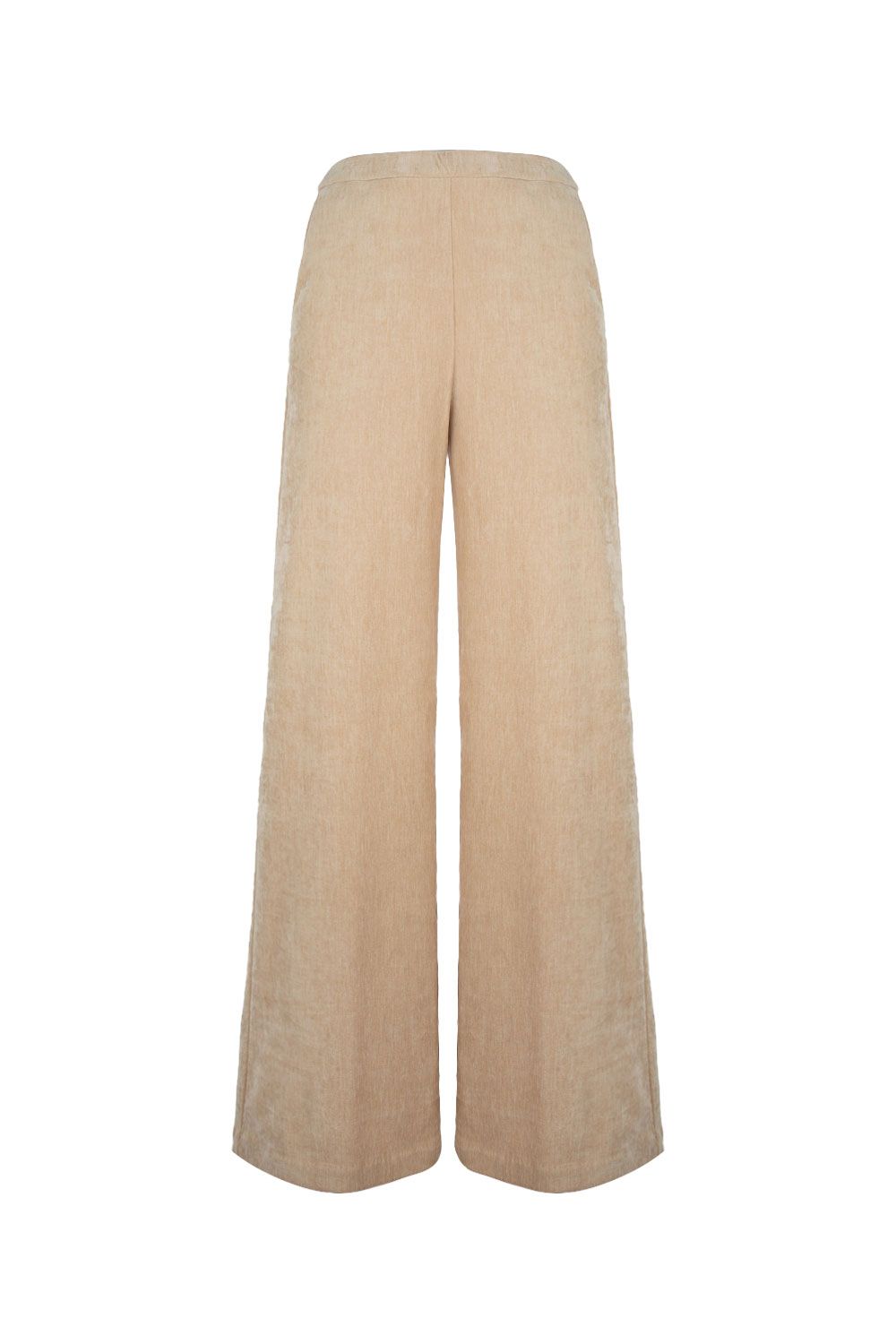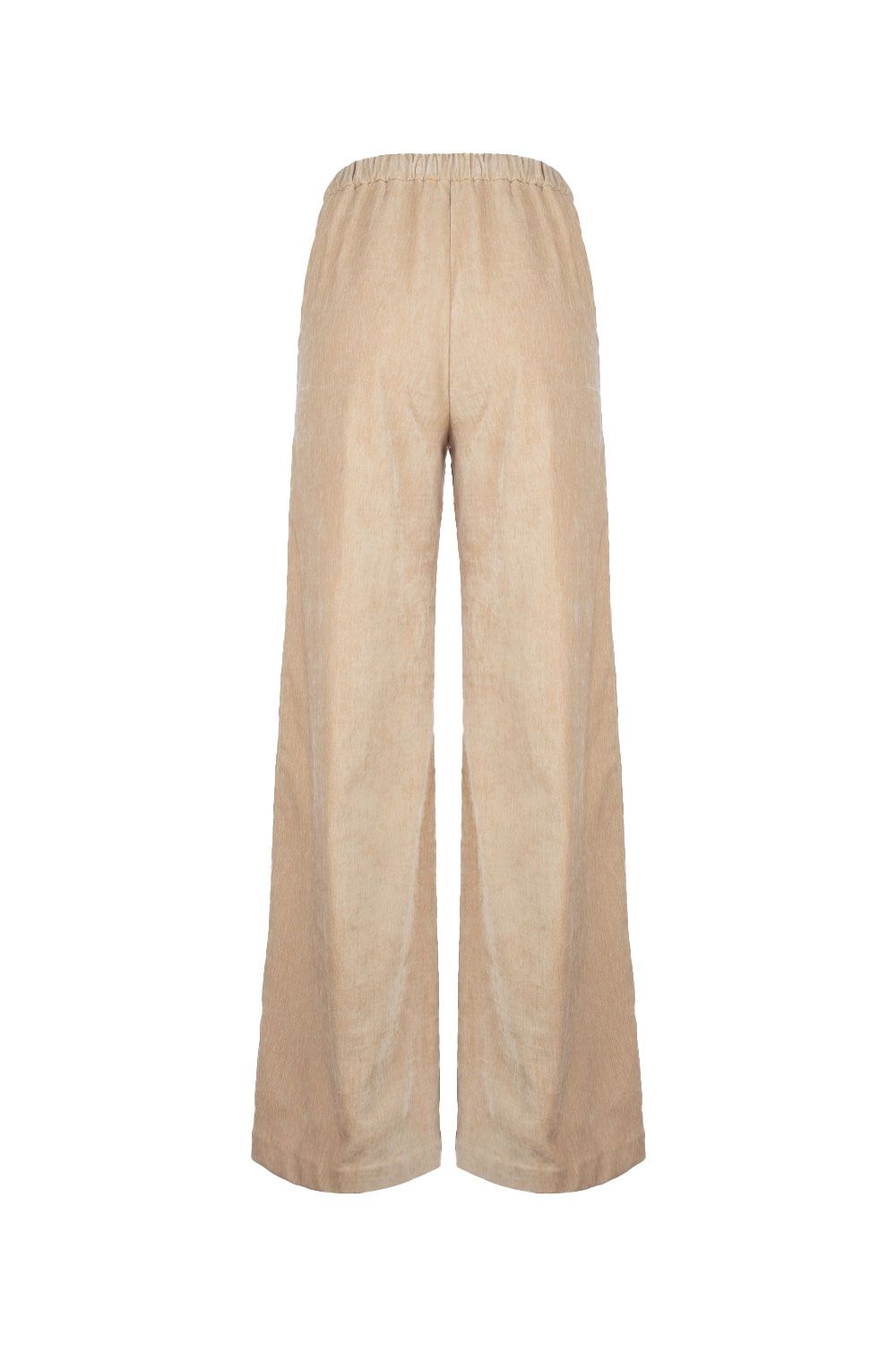 Pantaloni gamba lunga ampia effetto velluto liscio beige, elastico sul retro e chiusura con zip laterale, due tasche a filetto laterali