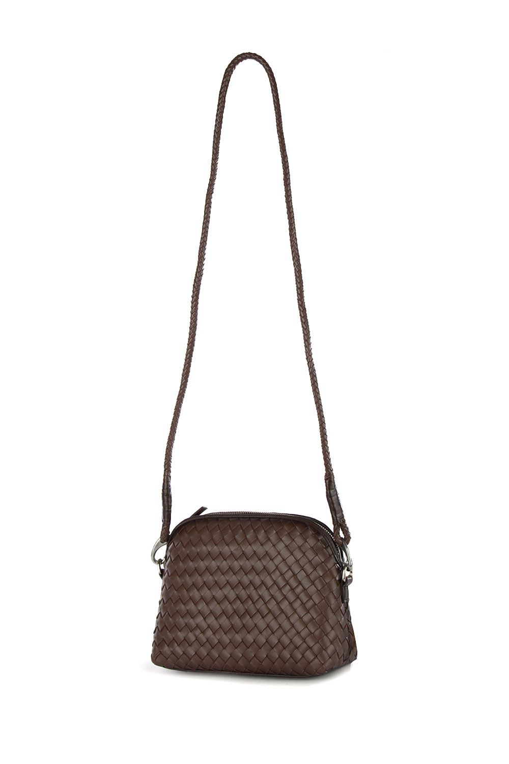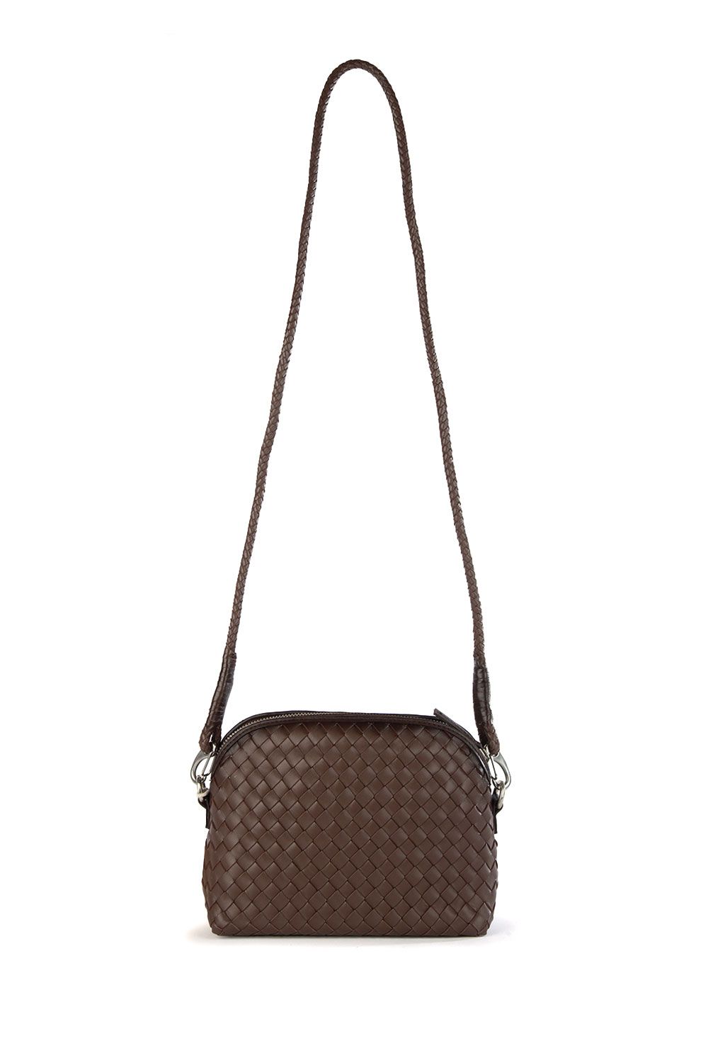 Borsa a tracolla in pelle intrecciata testa di moro con chiusura nella parte superiore con zip e tracolla tubolare in pelle intrecciata