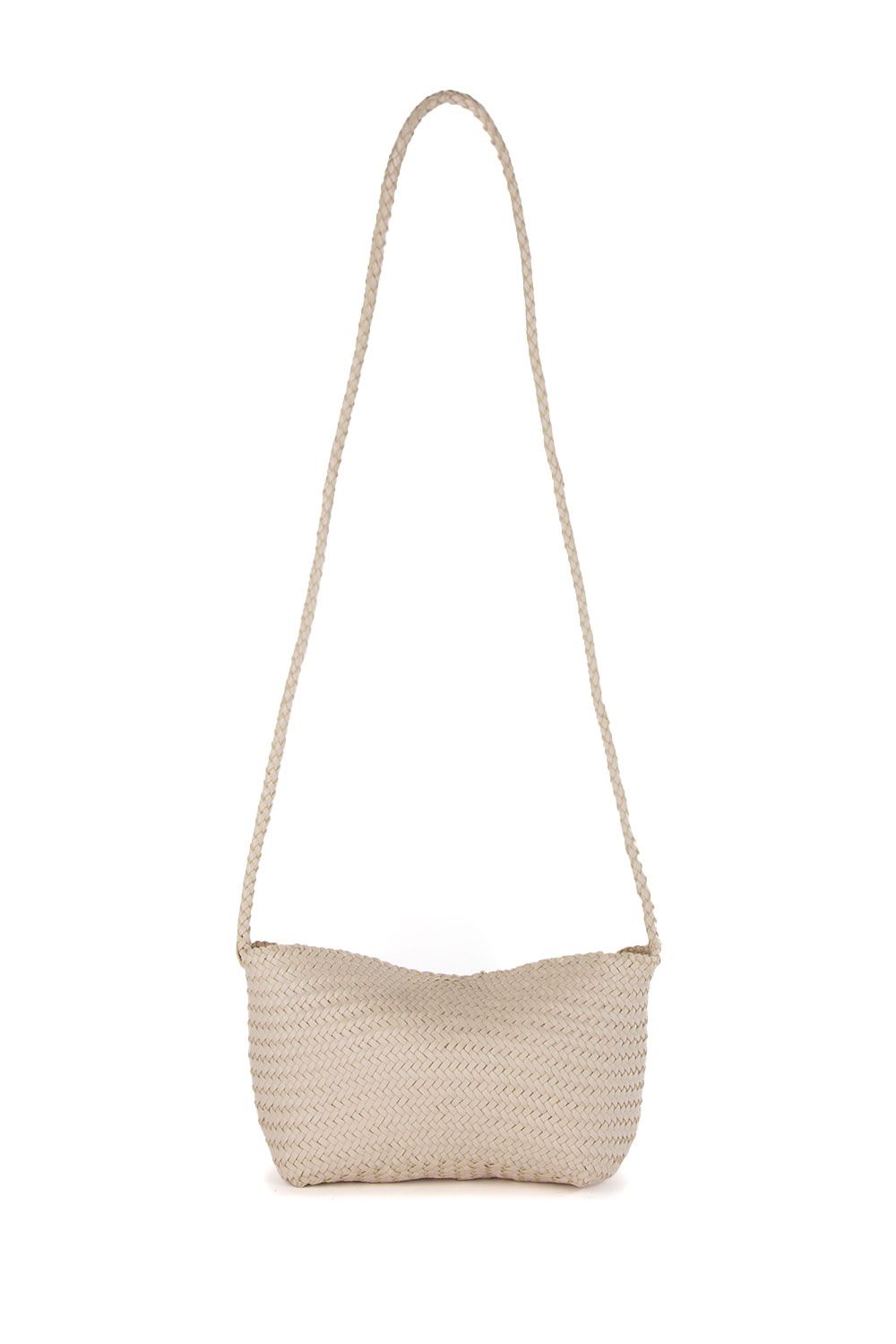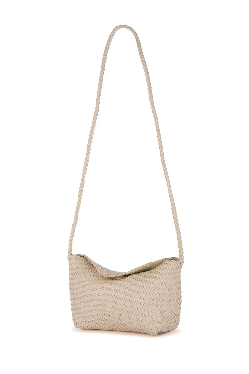 Borsa a tracolla in pelle intrecciata rosa cipria con chiusura nella parte superiore con calamita e tracolla tubolare in pelle intrecciata