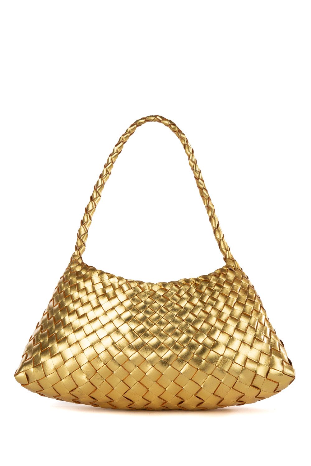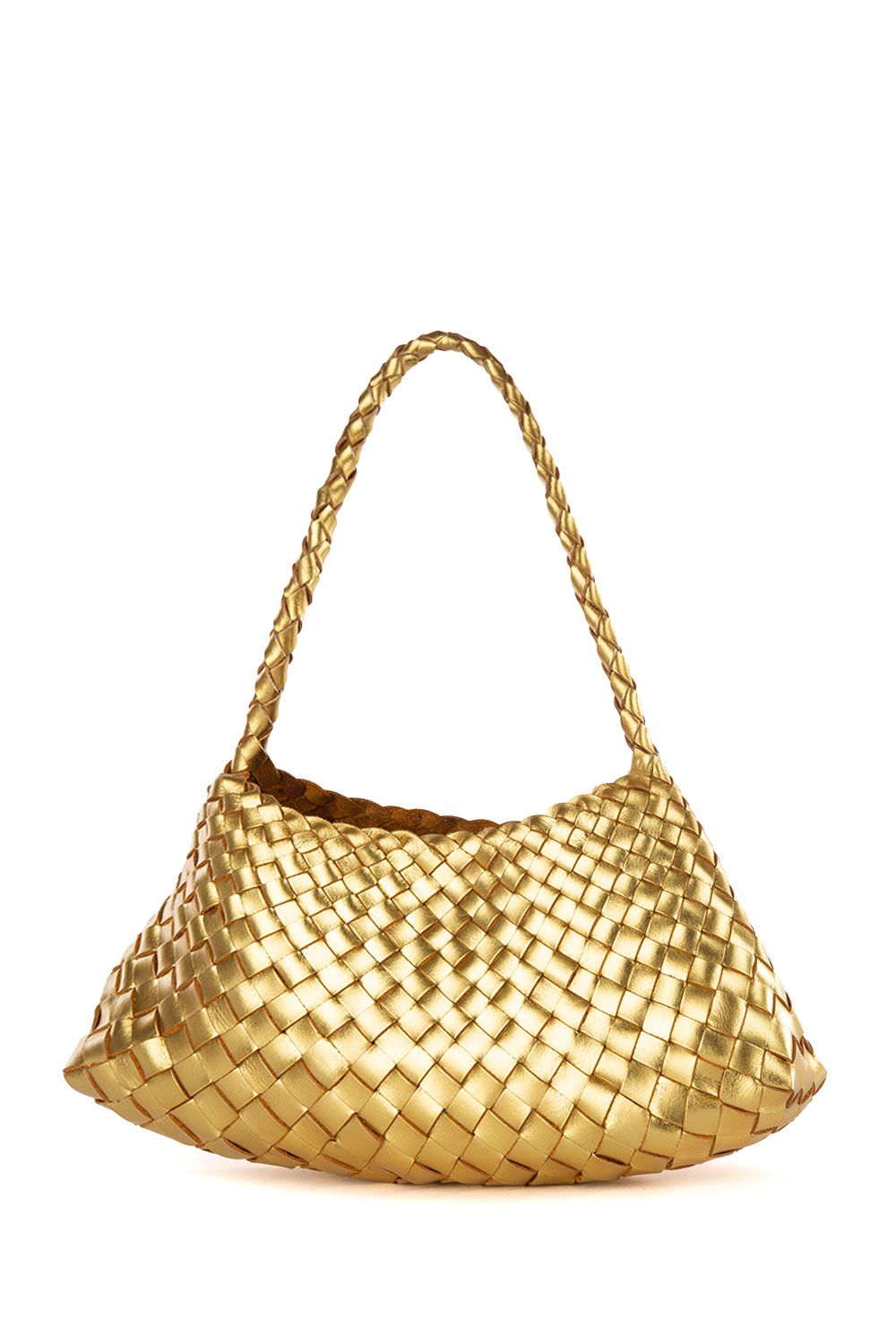 Borsa a mano in pelle intrecciata laminata oro con manico tubolare