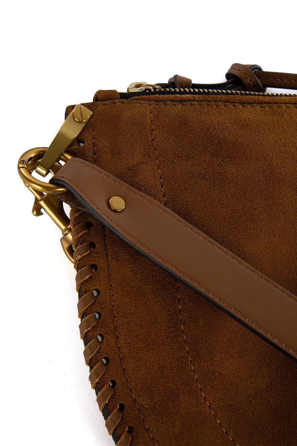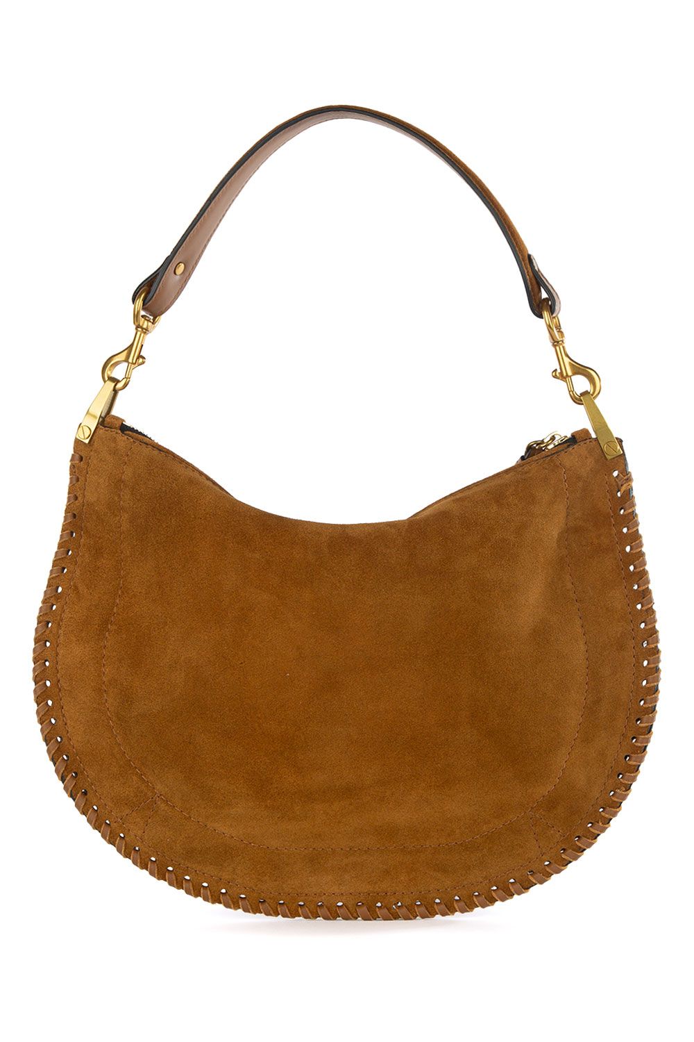 Borsa a mano in suede cognac con bordo decorato con intreccio in pelle, apertura con zip nella parte superiore, manico in pelle e tracolla regolabile e removibile in suede
