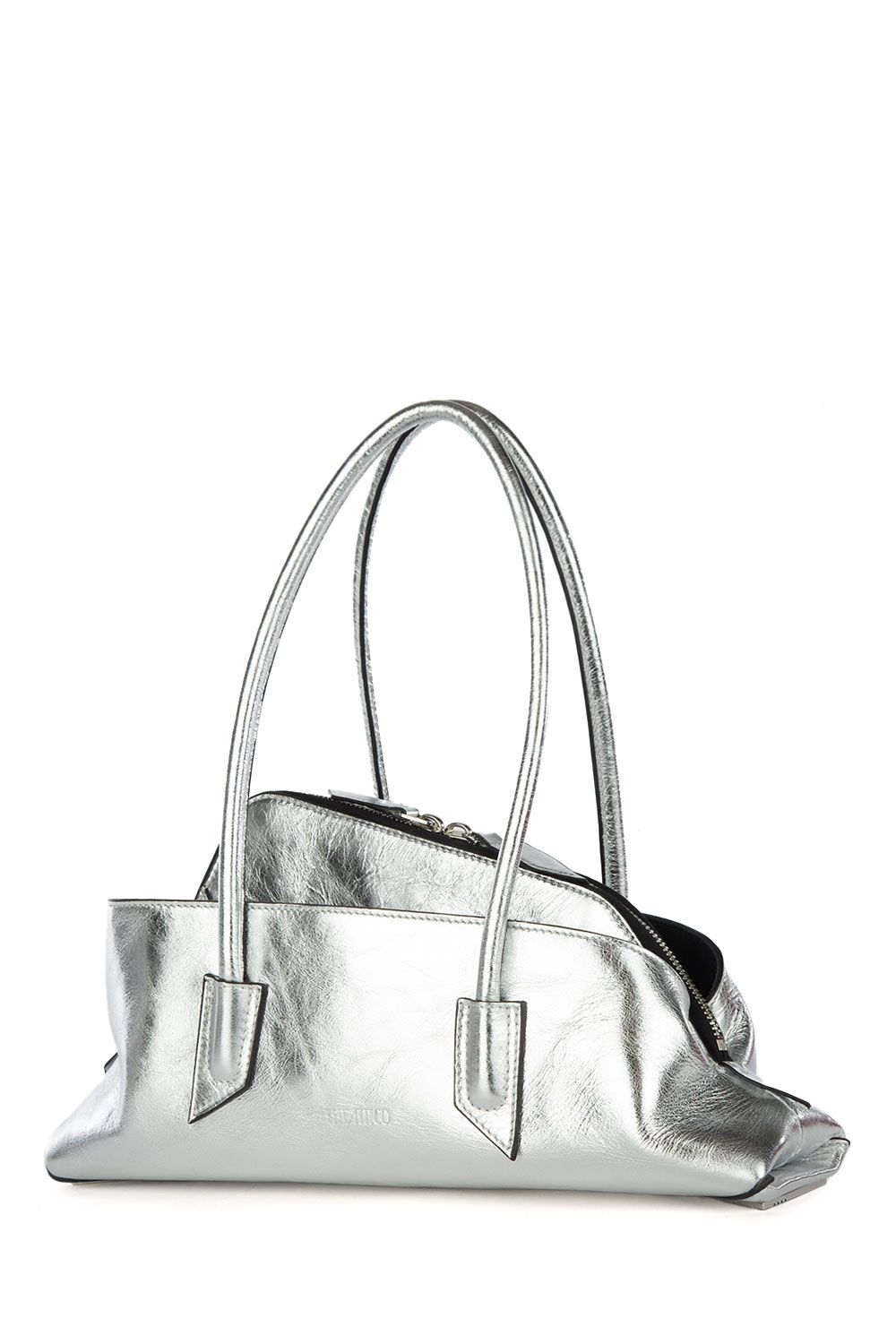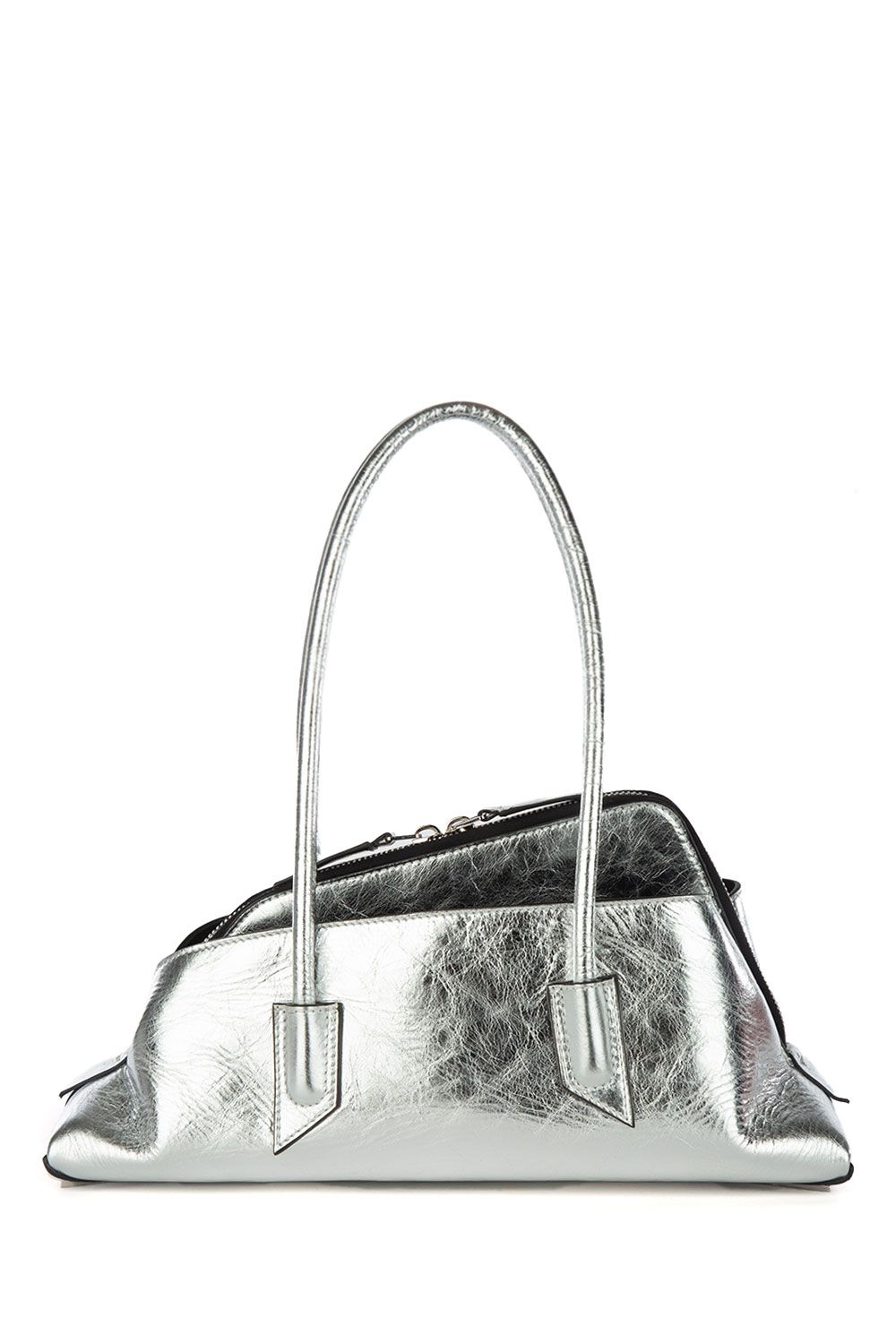 Borsa a spalla in pelle laminata argento con apertura con zip, doppio manico a spalla e tasche esterne