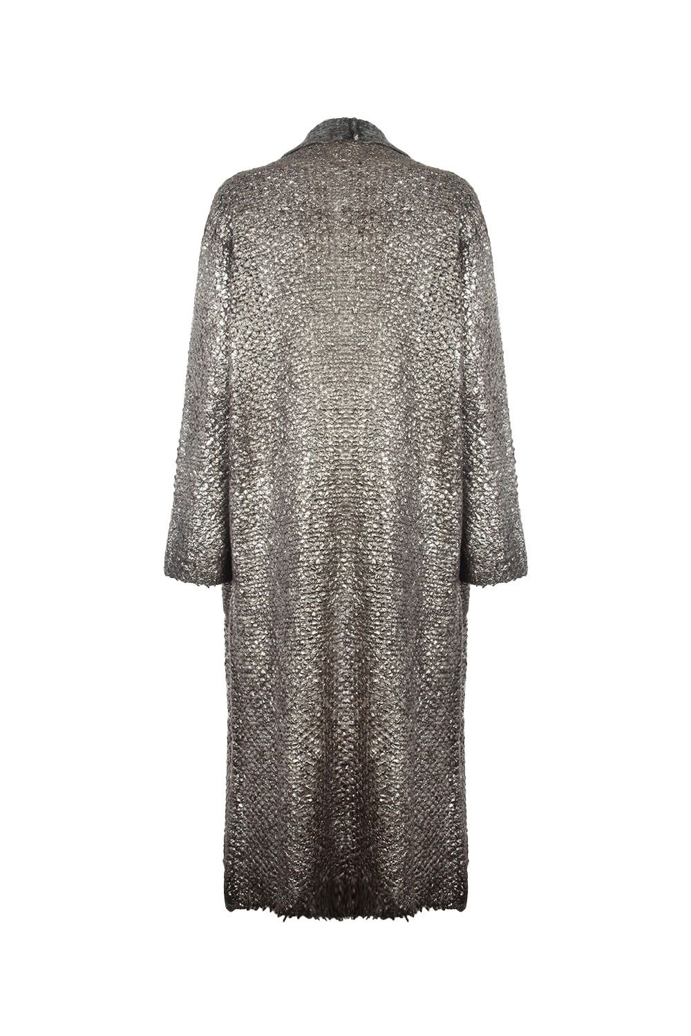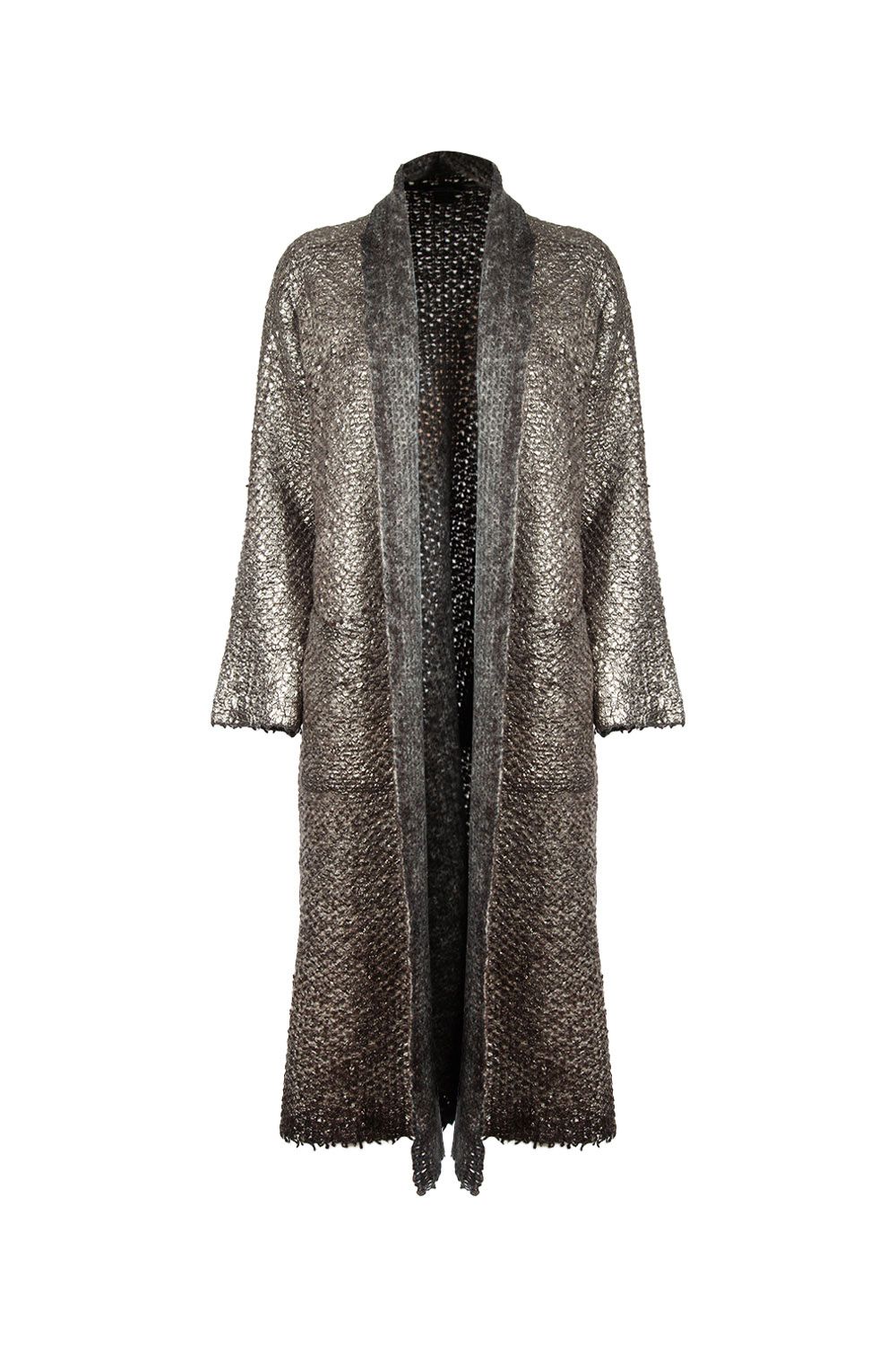 Cardigan lungo in cashmere e seta laminato grigio, due tasche laterali frontali, manica lunga