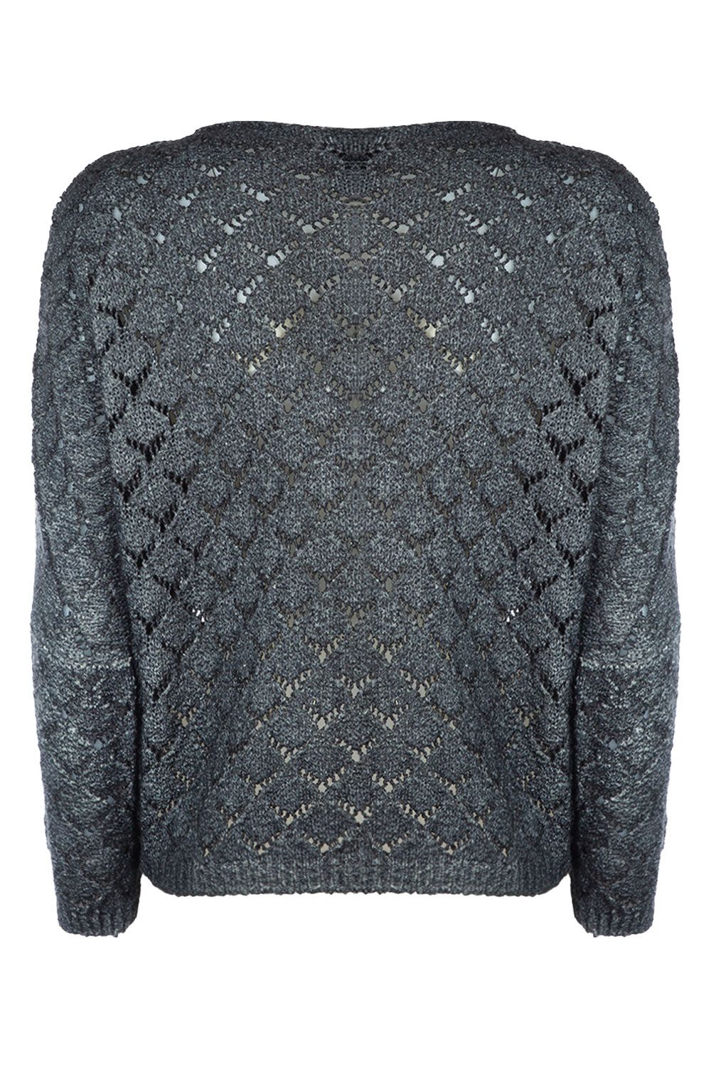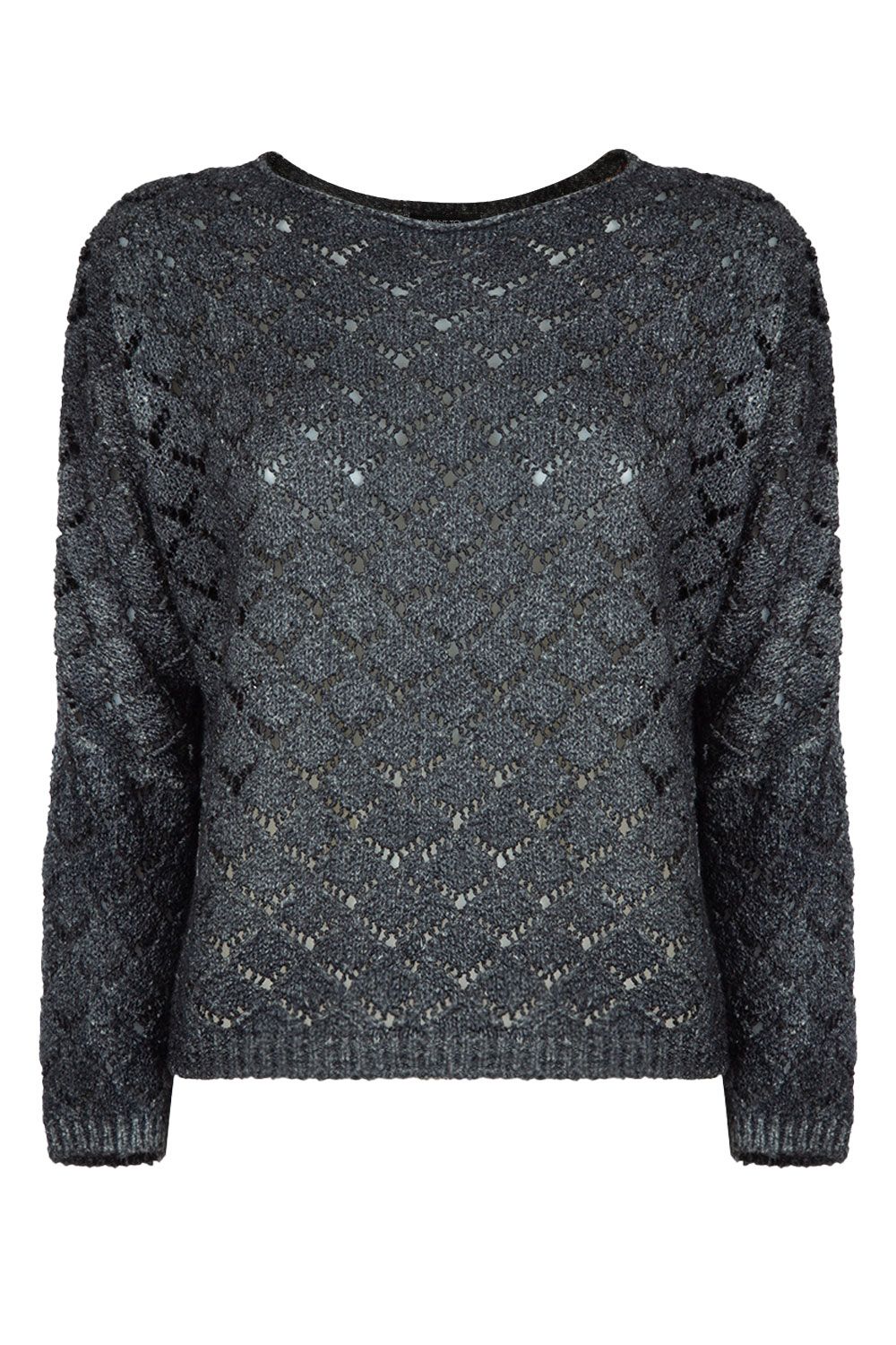 Maglia barchetta in misto lana e seta blu mélange, trama a rombi, manica lunga a pipistrello, polsini e orlo a coste