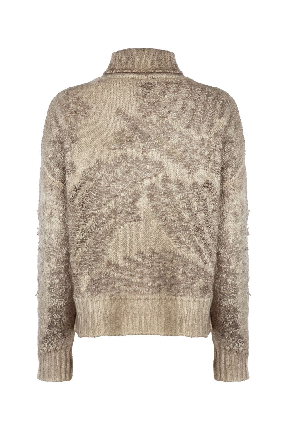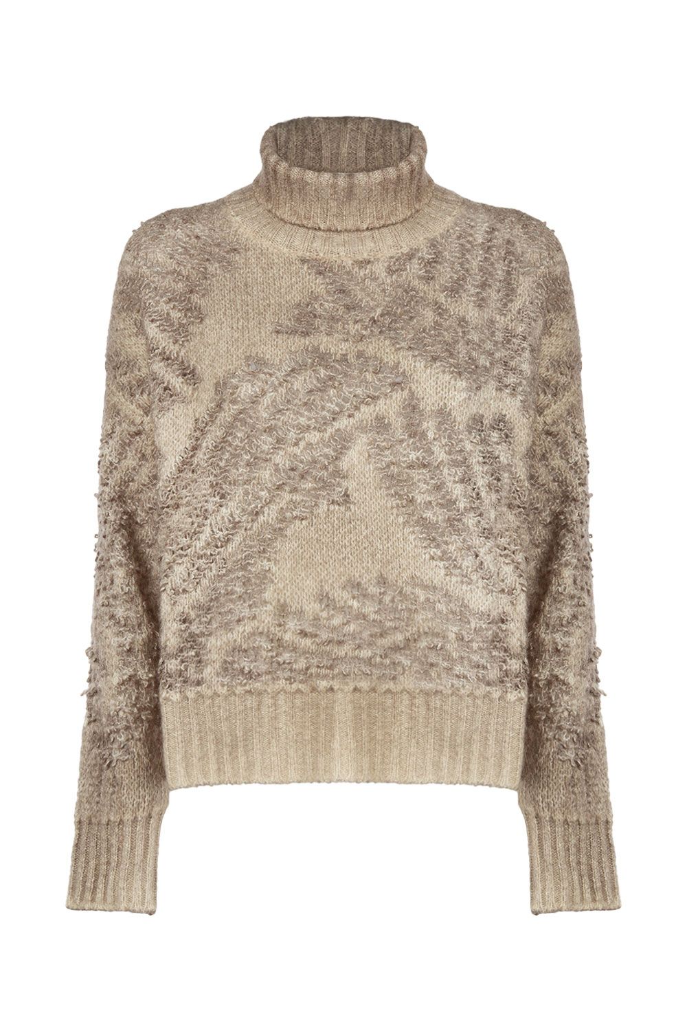Maglia boxy collo alto in misto cashmere e lana jacquard taupe, collo morbido, polsini e orlo a coste