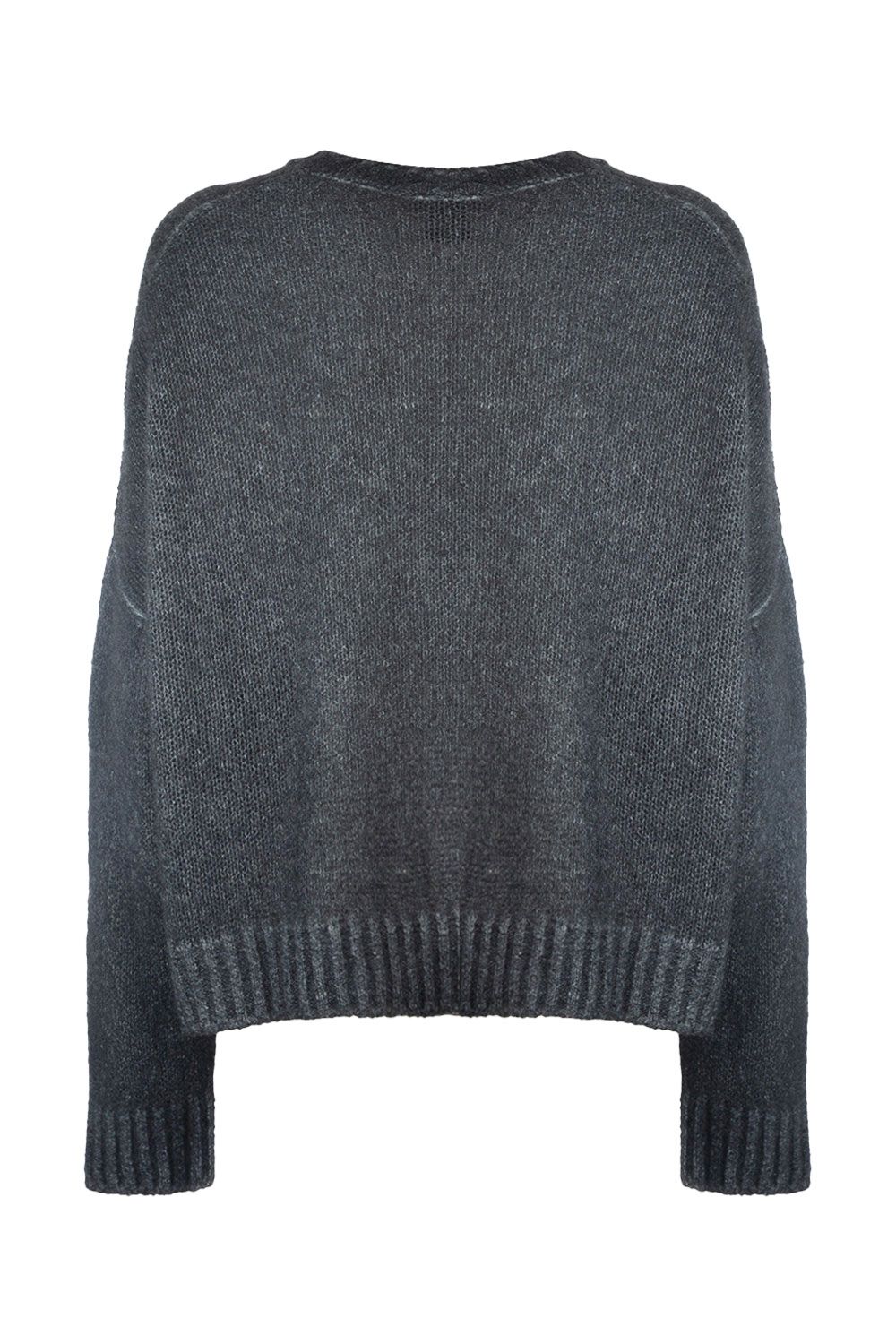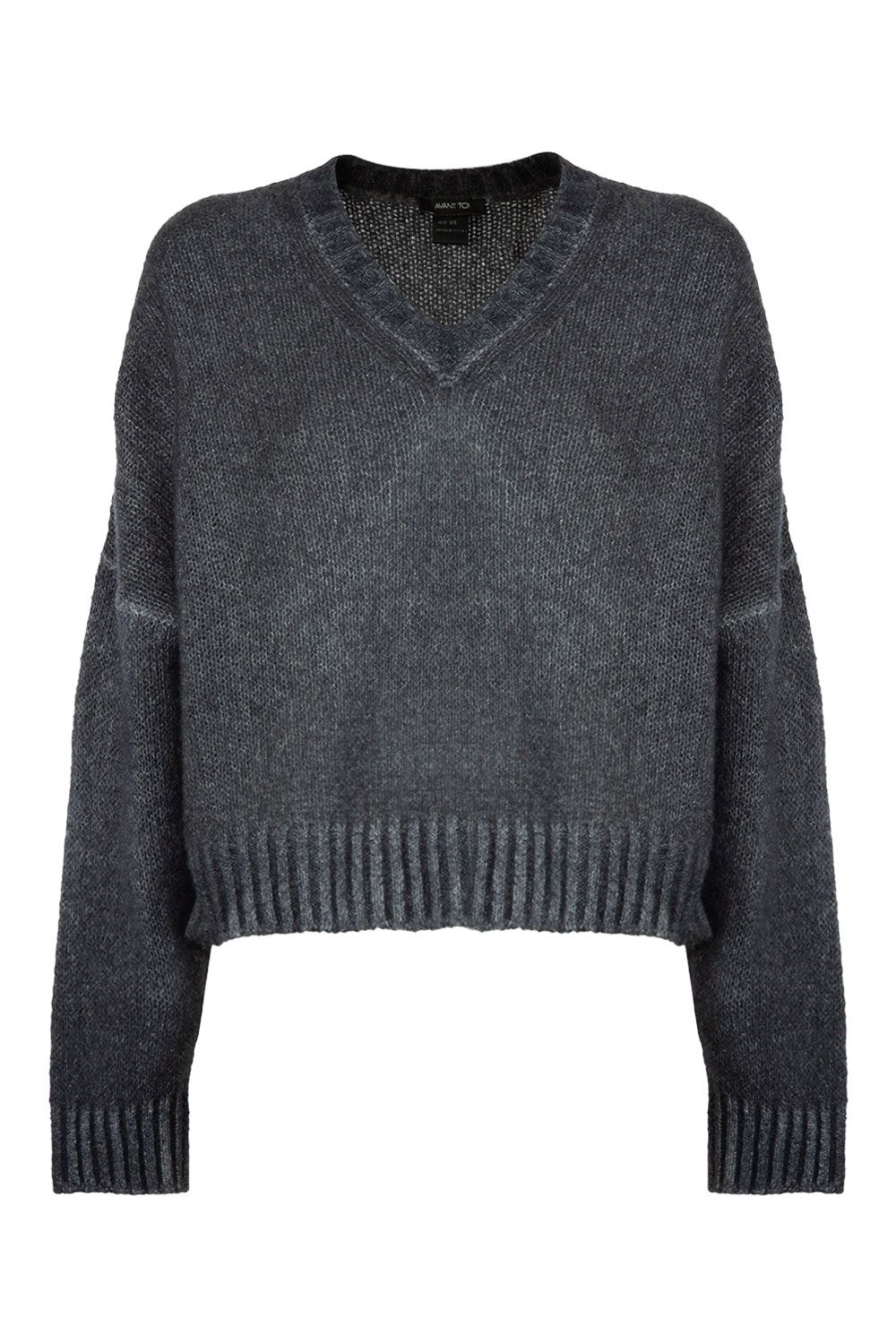 Maglia boxy scollo a V in misto cashmere e seta blu mélange, manica lunga a pipistrello, polsini e orlo a coste