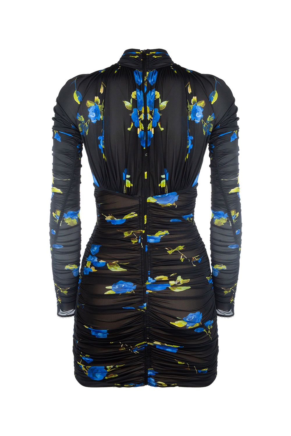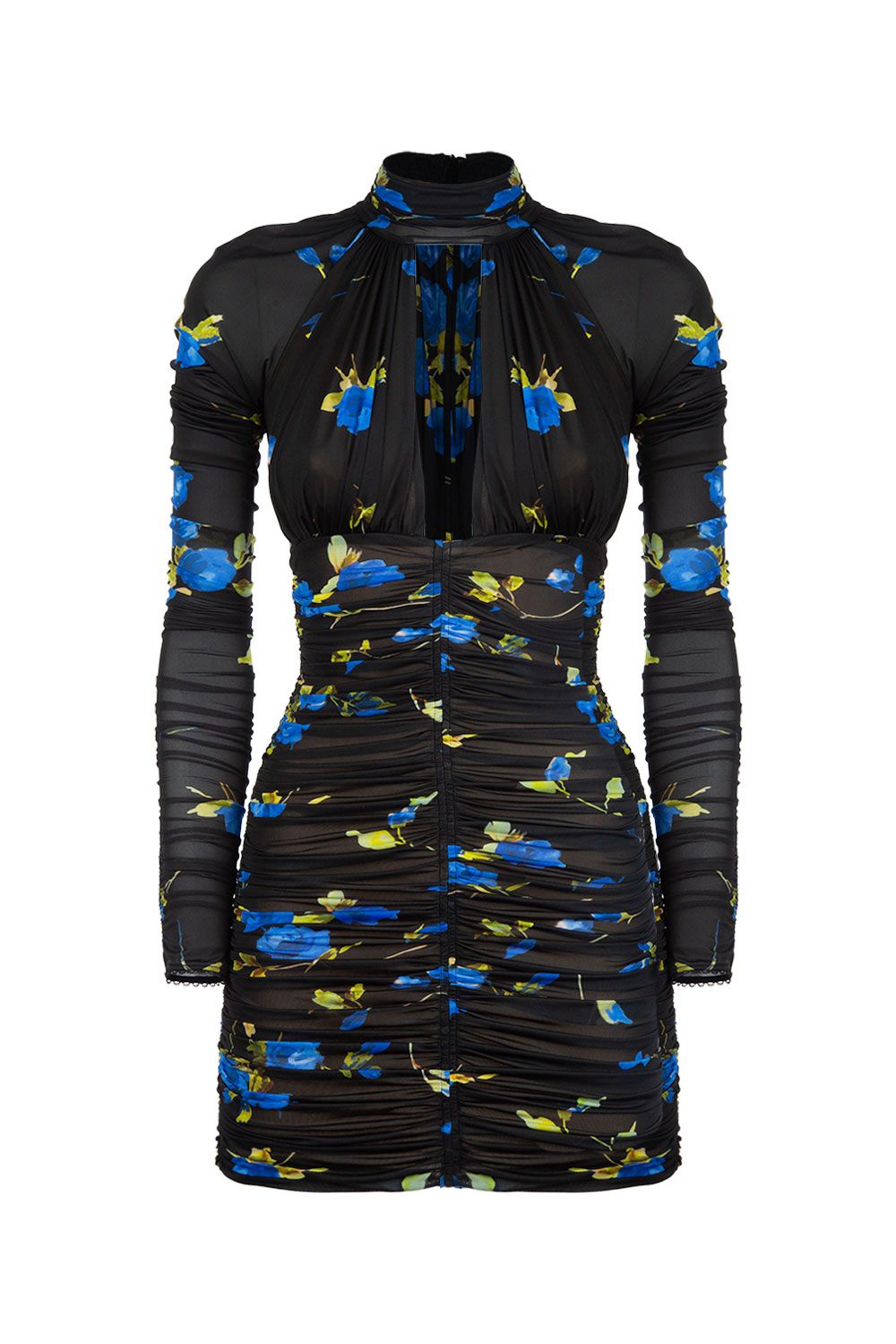 Abito corto in jersey stretch fondo nero e stampa con fiori blu, dettagli arricciati sulle maniche e sul corpetto, manica lunga, collo alto, cut out sul frontale, zip sul retro