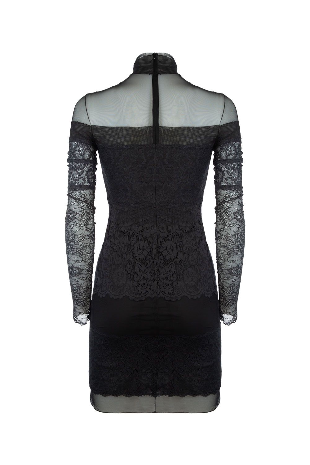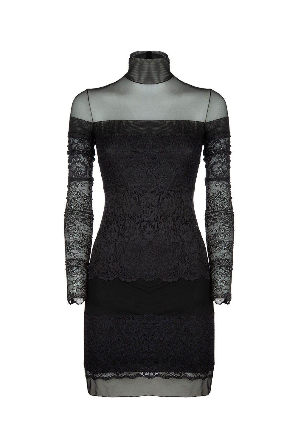 Abito corto dolcevita in pizzo e tulle stretch semitrasparente nero con manica lunga, sottoveste nera cucita, chiusura con zip sul retro a scomparsa