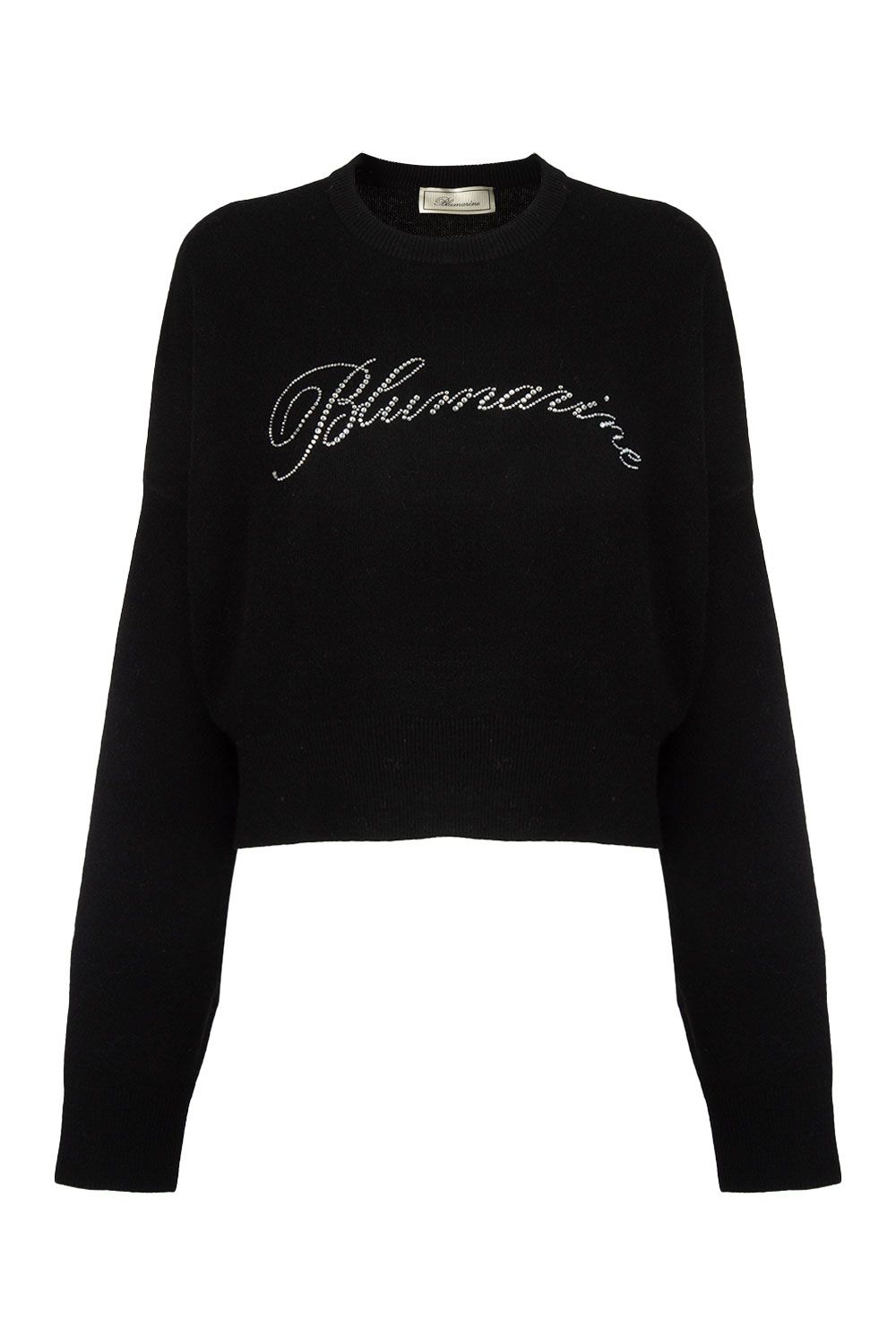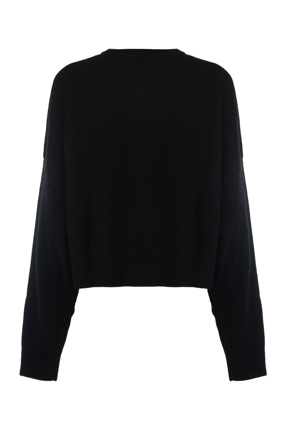 Maglia girocollo boxy in lana nera, logo strass frontale, manica lunga, spacchetti laterali, polsini e orlo a coste