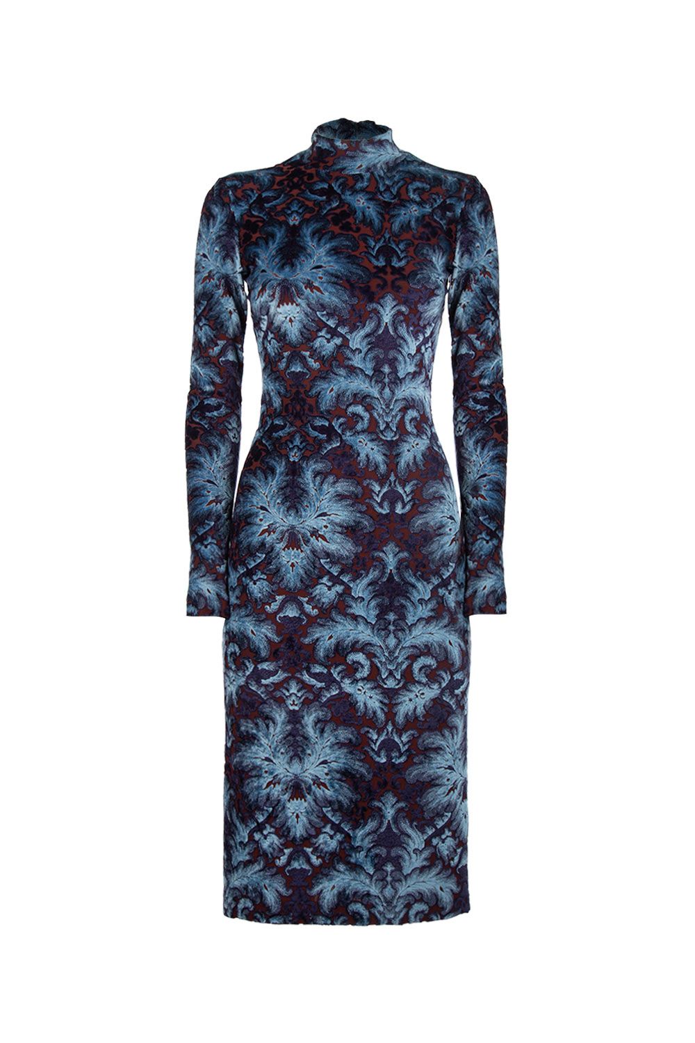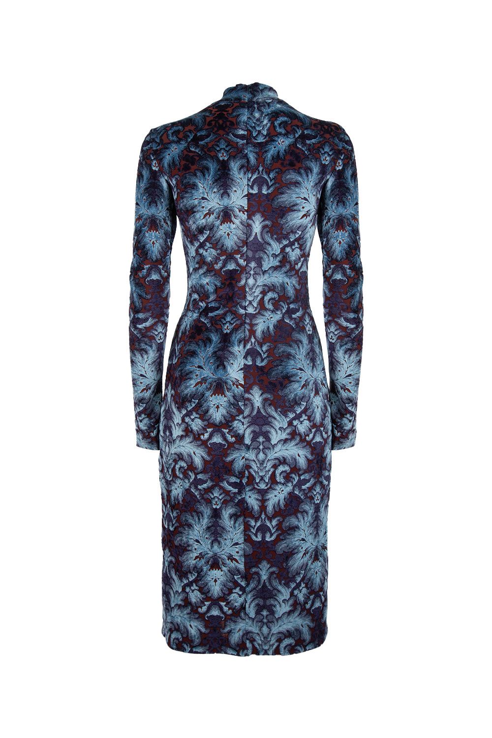 Abito midi in jersey stretch e velluto broccato sui toni del burgundy, blu e azzurro collo alto, manica lunga e chiusura con zip sul retro