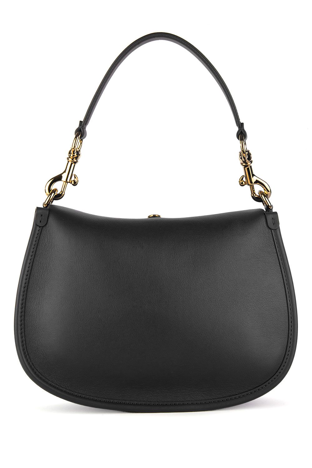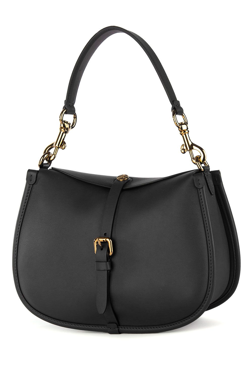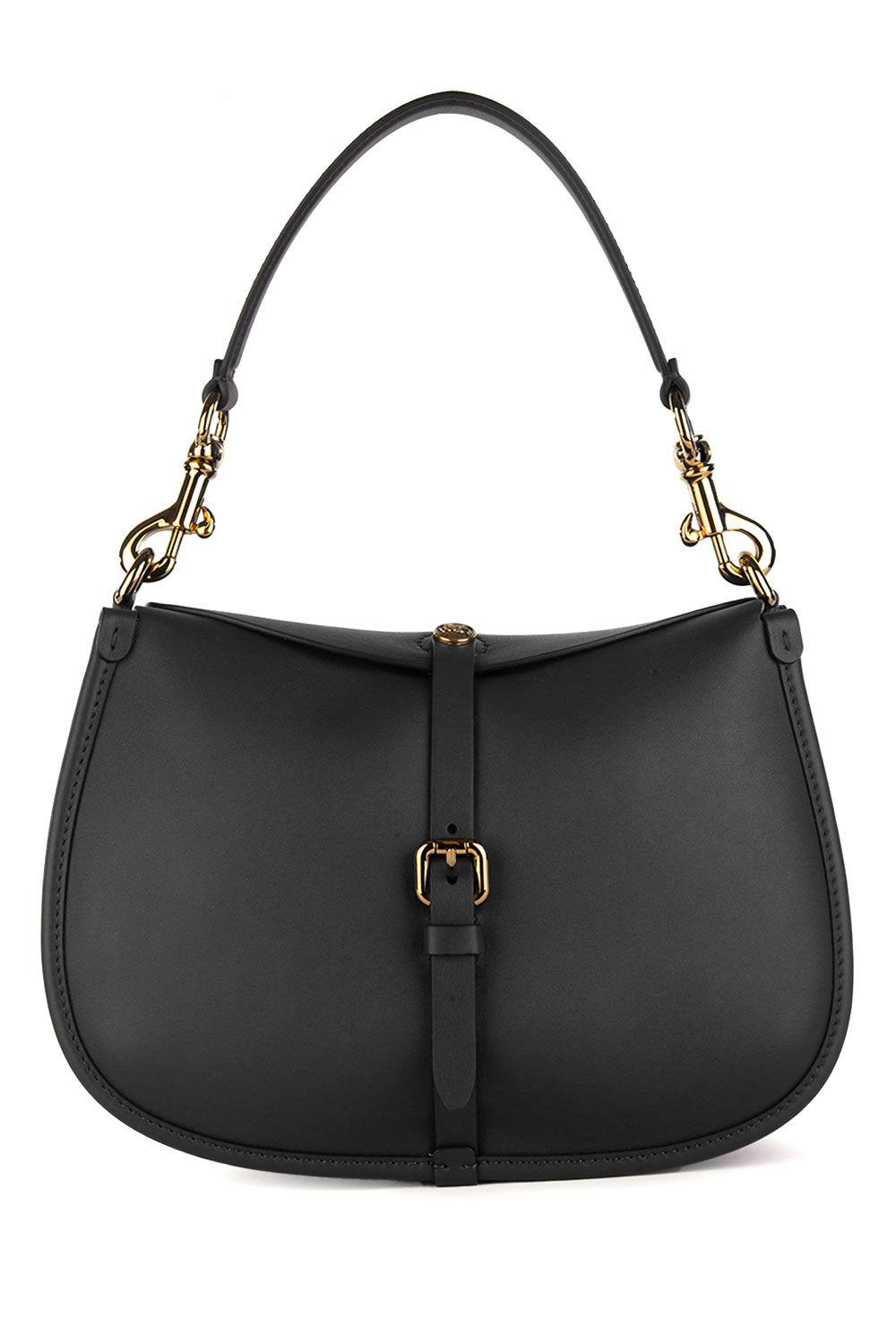 Borsa a spalla in pelle nera, interno in suede, chiusura magnetica con logo oro e fibbia metallica funzionale, manico rimovibile e tracolla regolabile e rimovibile