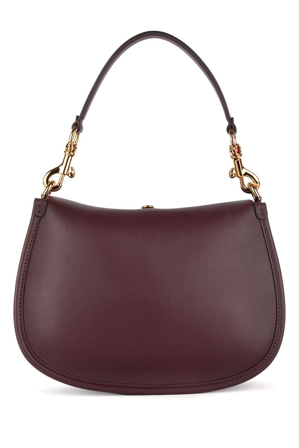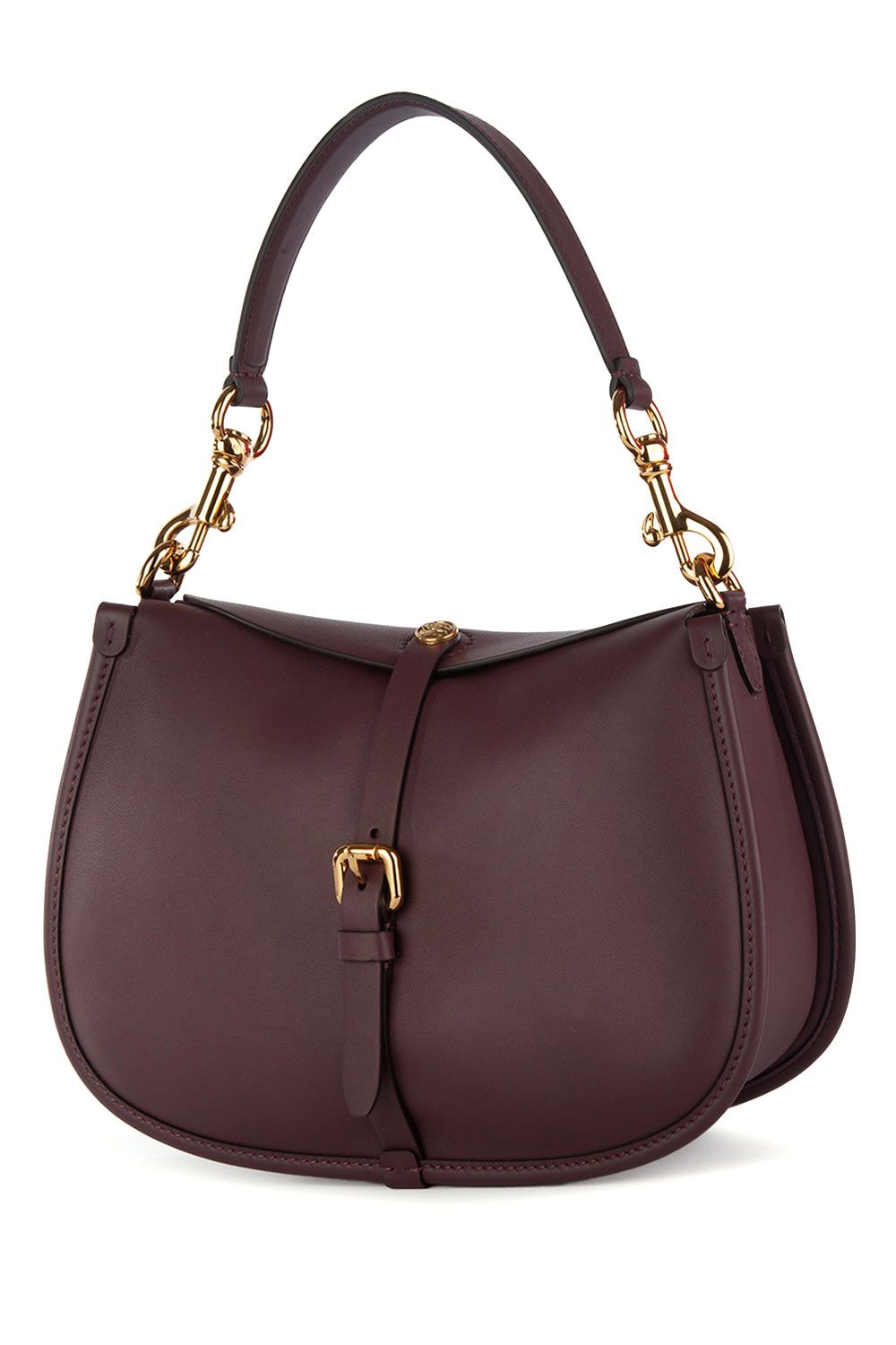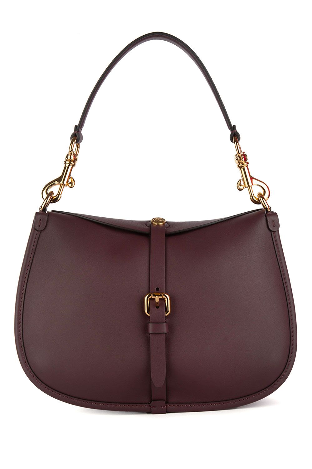 Borsa a spalla in pelle prugna, interno in suede, chiusura magnetica con logo oro e fibbia metallica funzionale, manico rimovibile e tracolla regolabile e rimovibile