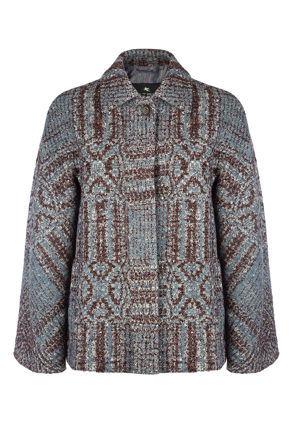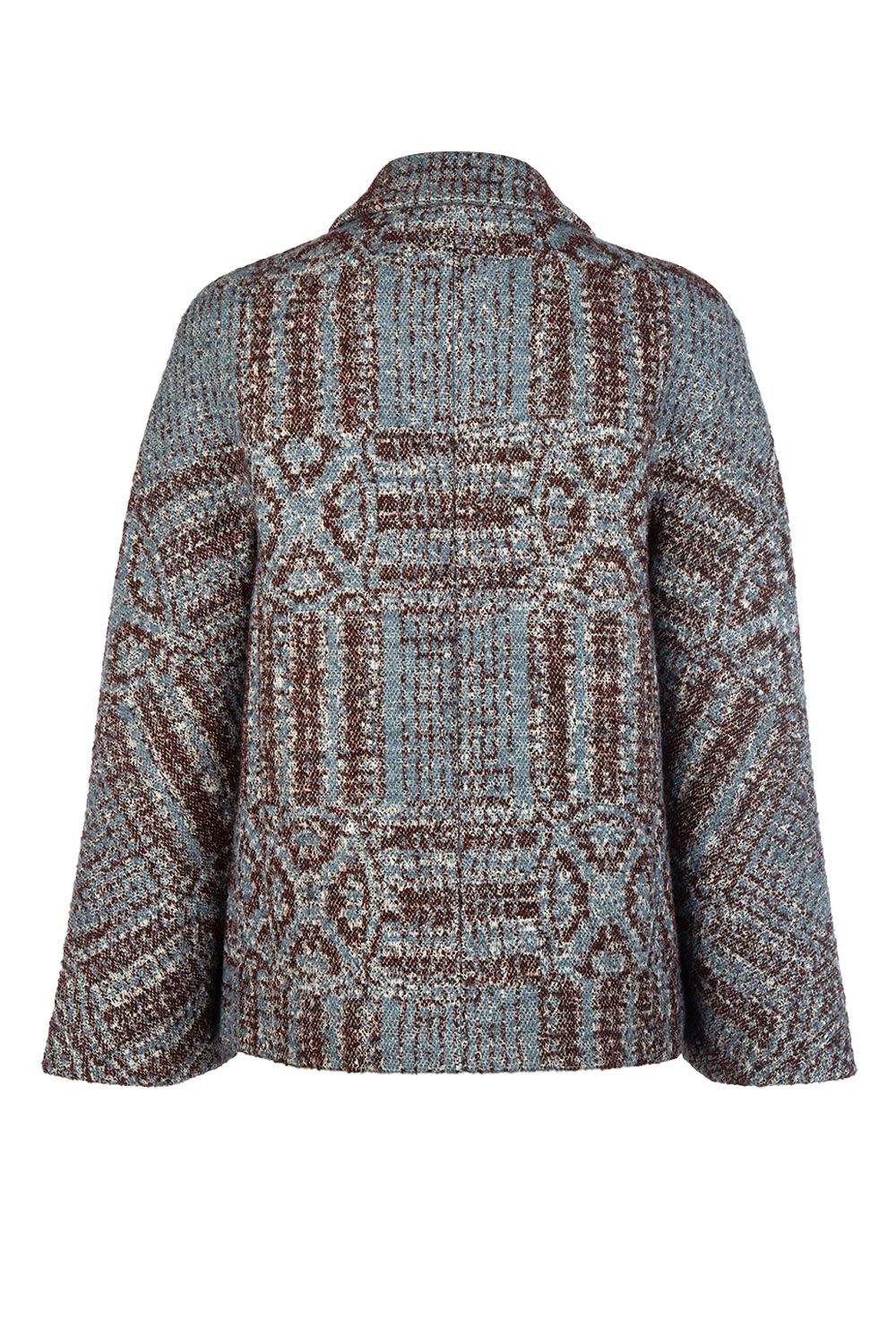 Cappotto corto in misto lana e cotone jacquard sui toni del burgundy, panna e azzurro, fodera interna in viscosa, colletto a camicia e chiusura con bottoni e tasche a filetto laterali