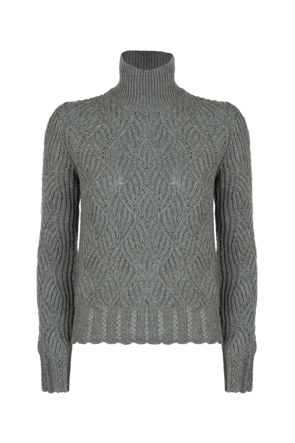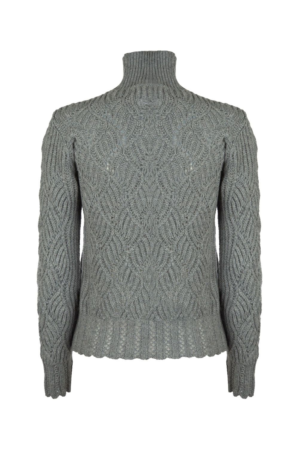 Maglia collo alto in cashmere grigia, trama intrecciata, manica lunga, fondo e polsini a coste