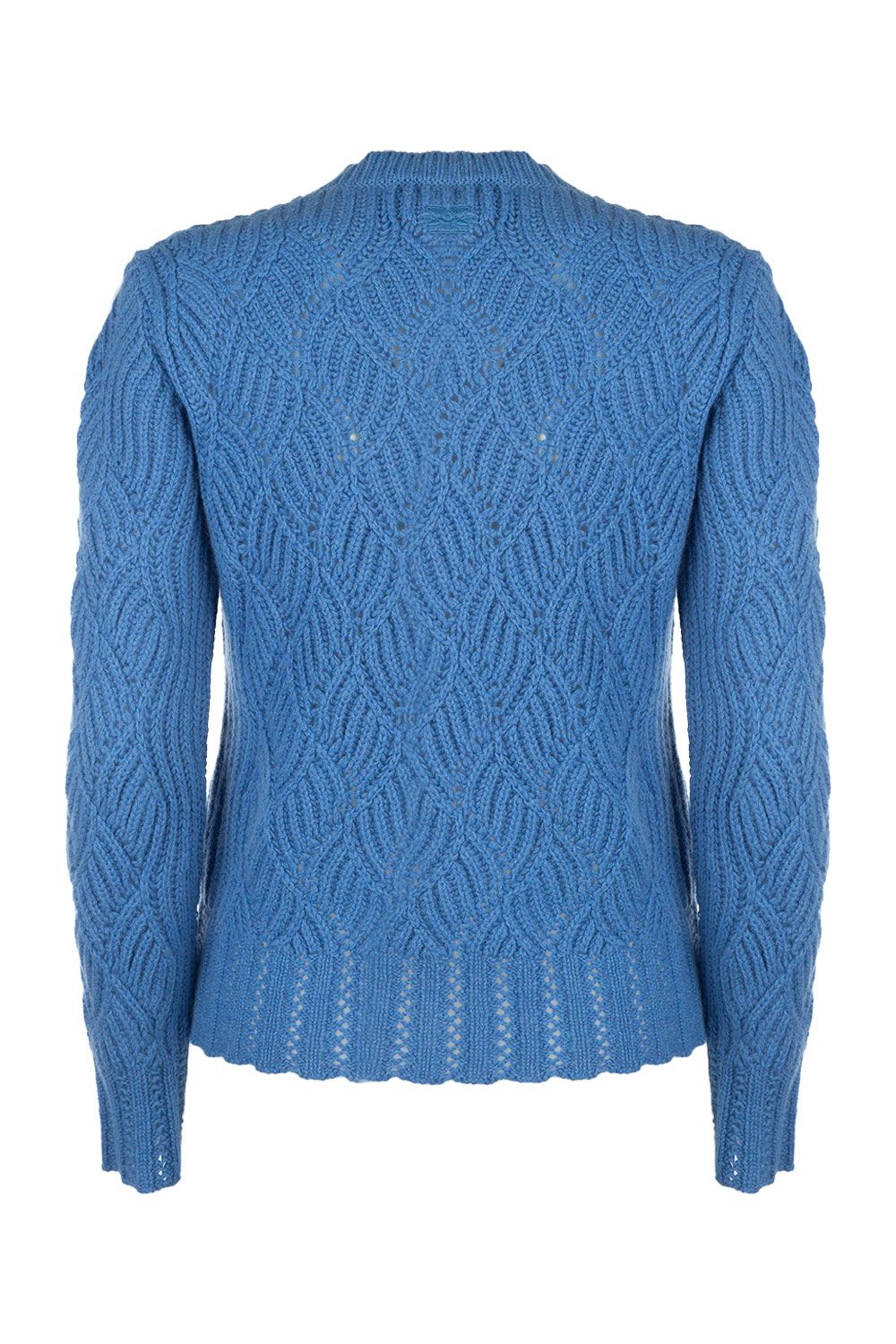 Maglia girocollo in cashmere ceruleo, trama intrecciata, manica lunga, fondo e polsini a coste