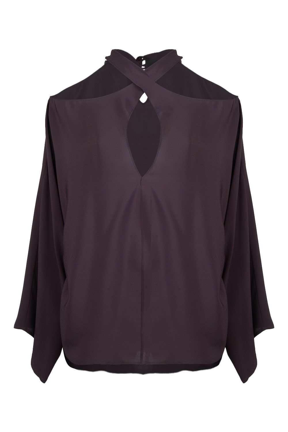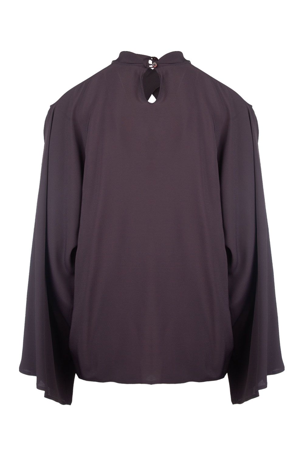 Blusa in misto seta melanzana, manica tre quarti ampia, collo incrociato con goccia frontale, chiusura sul retro con due bottoni