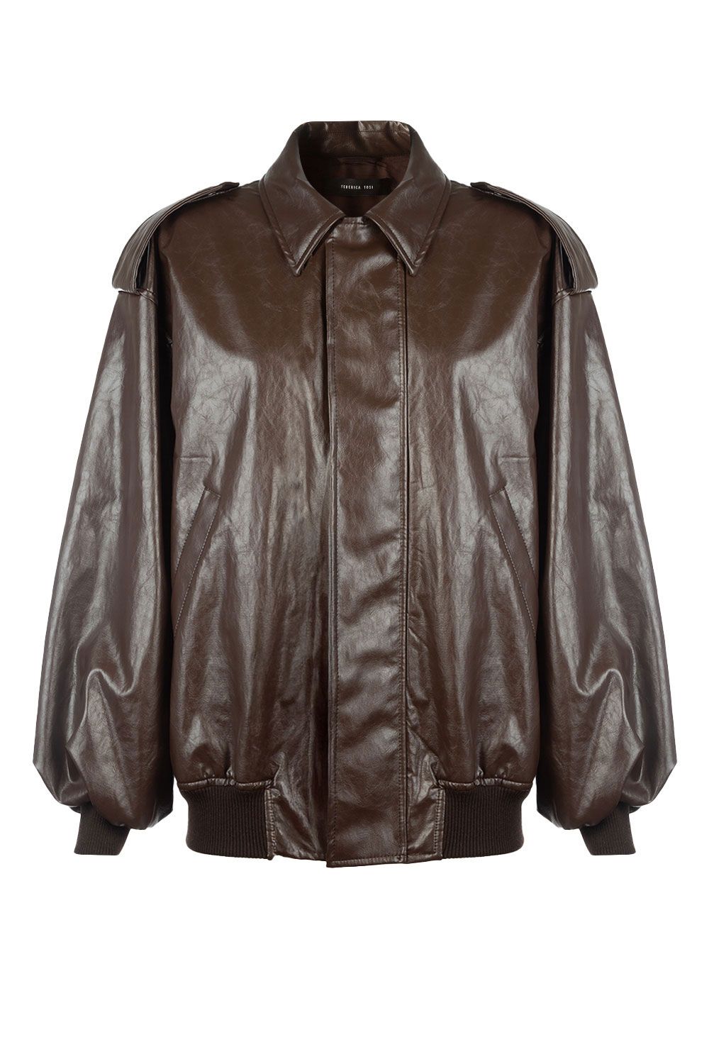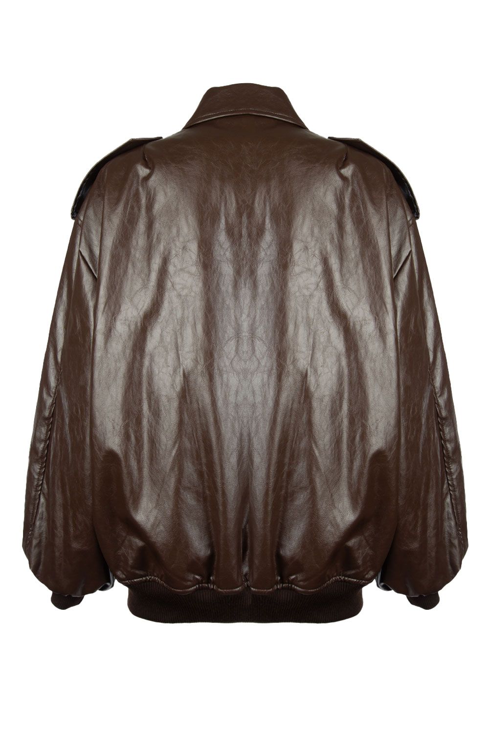 Bomber oversize effetto pelle cioccolato, polsini e orlo elastici, colletto a camicia chiusura con zip e bottoni nascosti, due tasche a letto laterali e due controspalline con bottone automatico