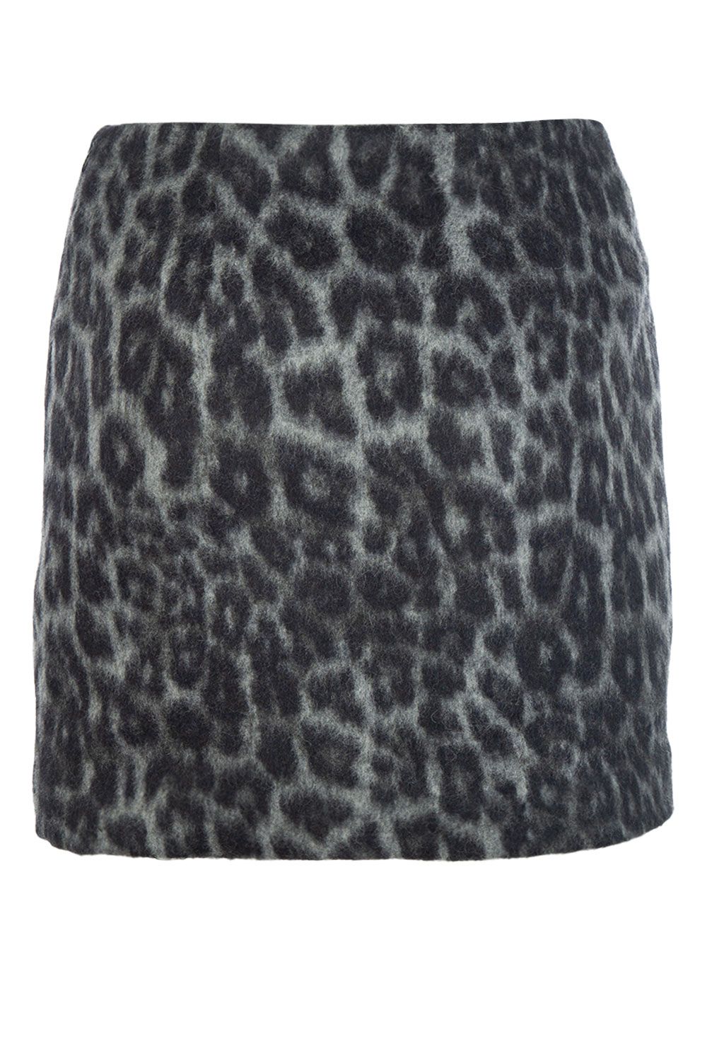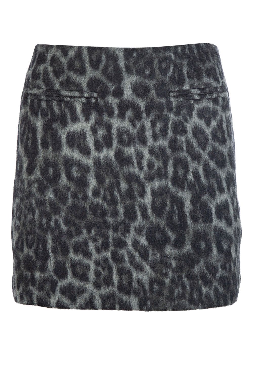 Gonna corta in misto lana animalier grigia e nera, due tasche a filetto frontali e chiusura con zip laterale