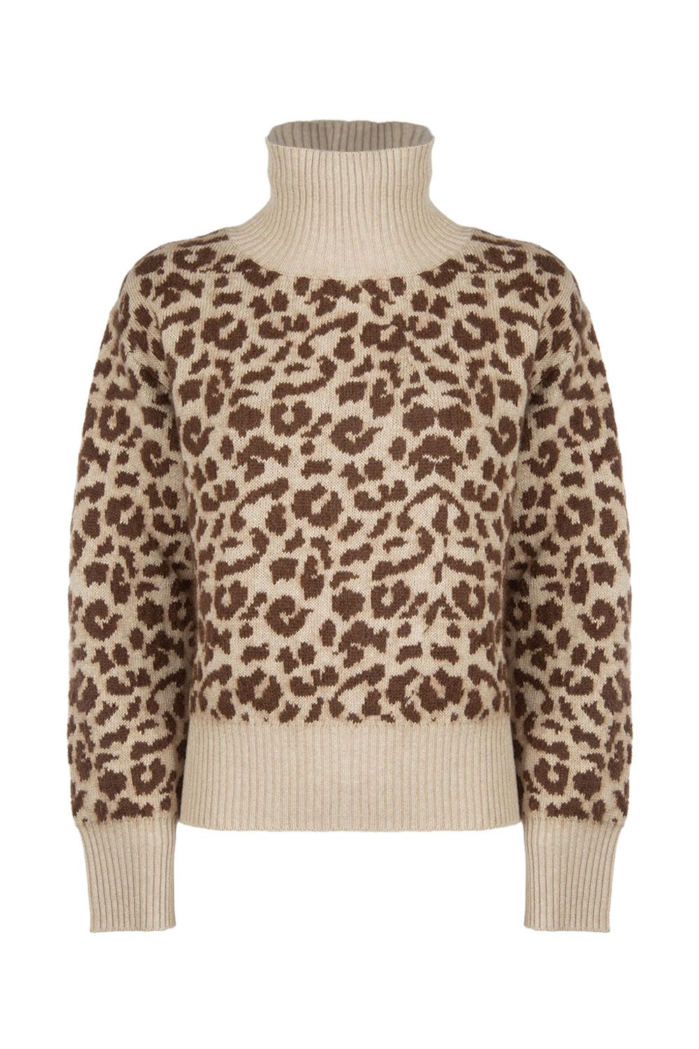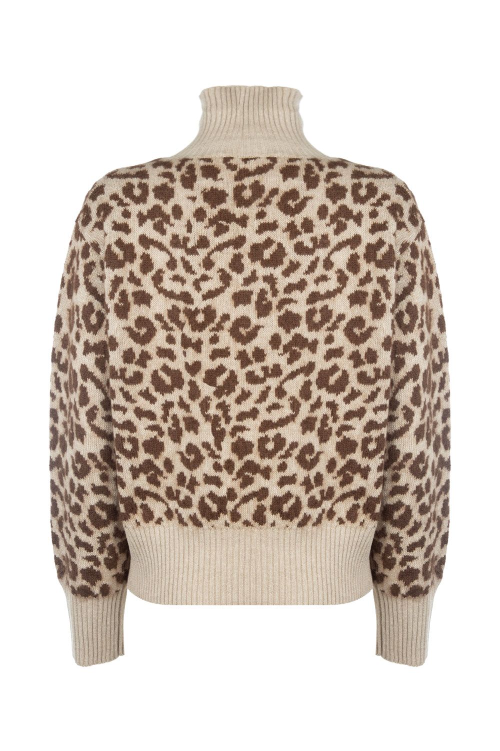 Maglia boxy collo a cratere in misto lana stampa animalier beige e marrone, collo polsini e orlo a coste