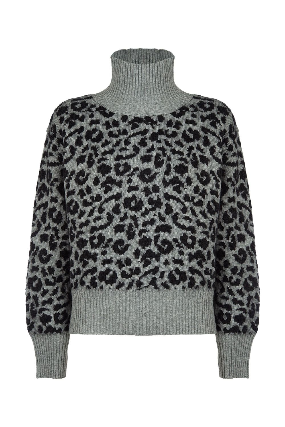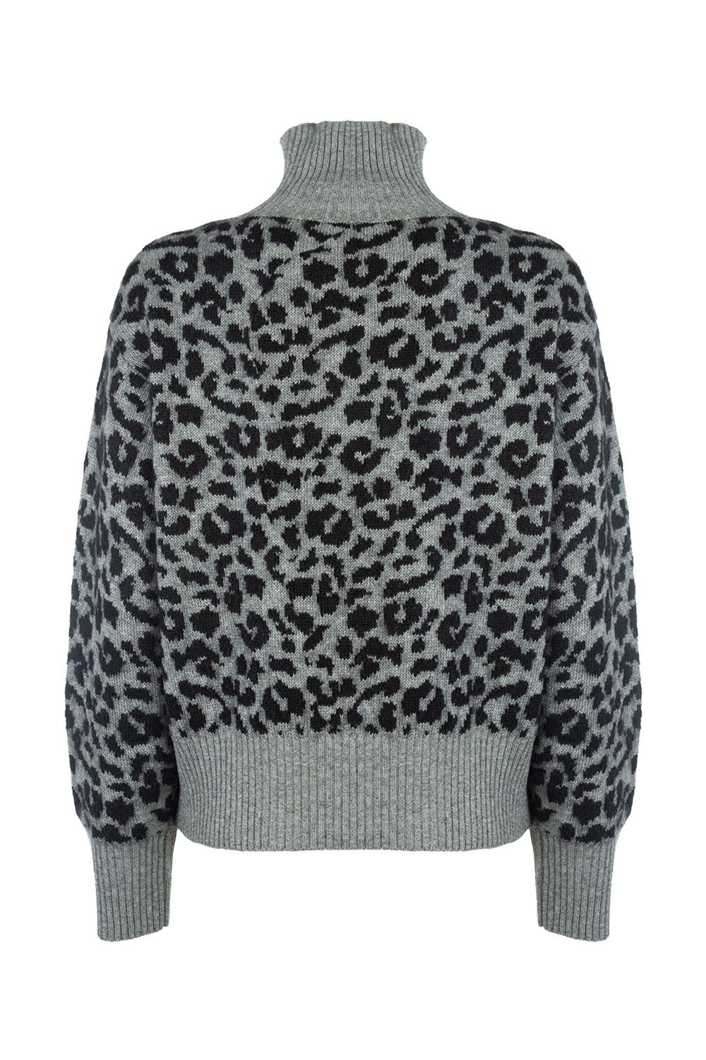 Maglia boxy collo a cratere in misto lana stampa animalier grigia e nera, collo polsini e orlo a coste