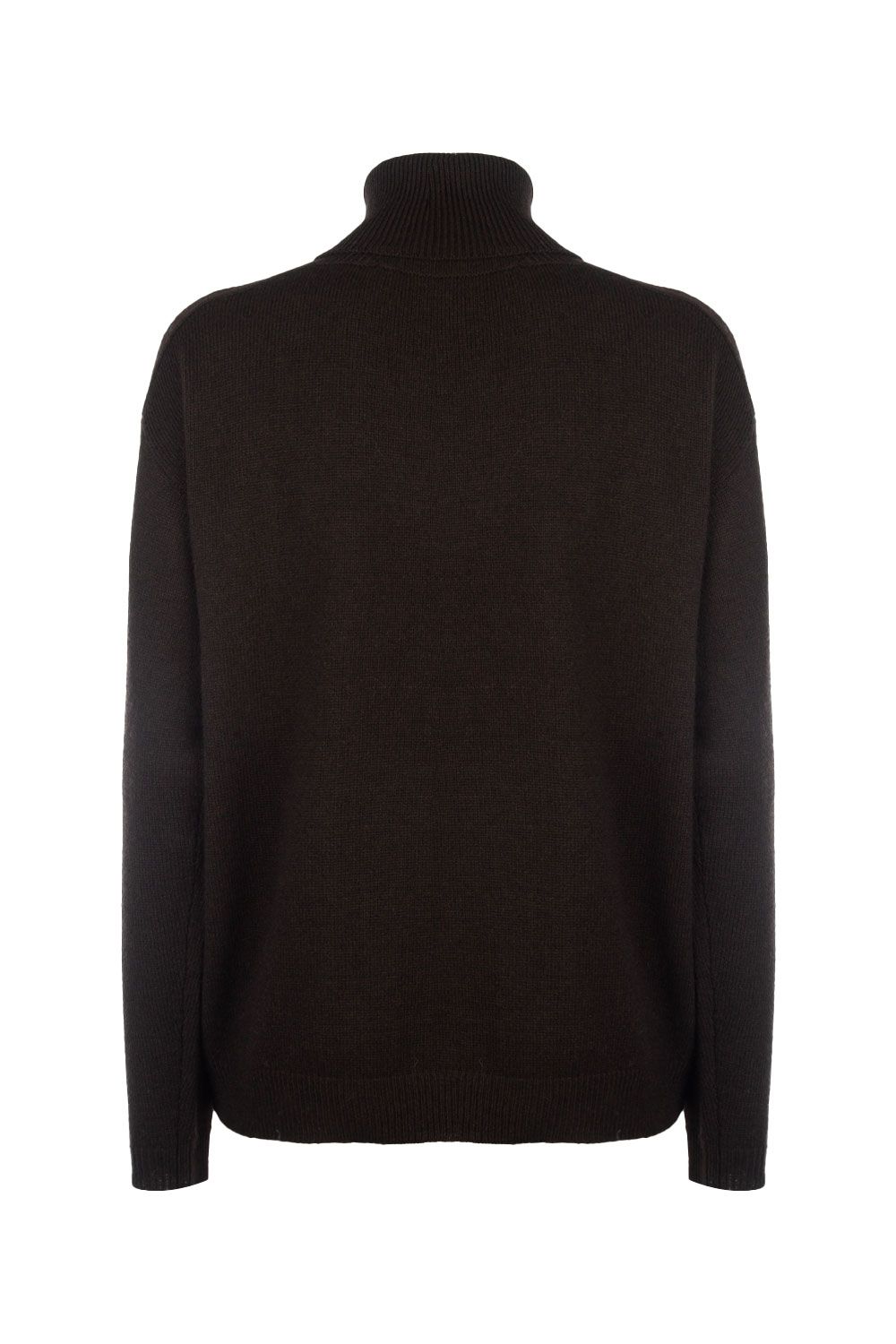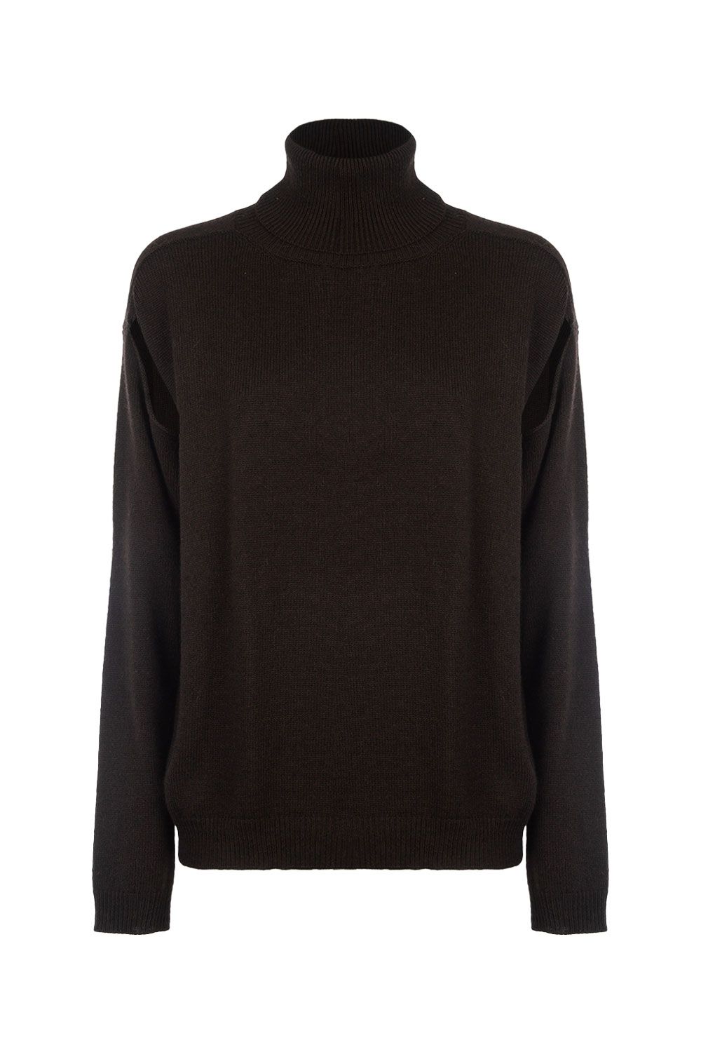 Maglia collo alto in misto lana marrone leggermente oversize, dettagli cut out appena sotto la spalla, collo polsini e orlo a coste
