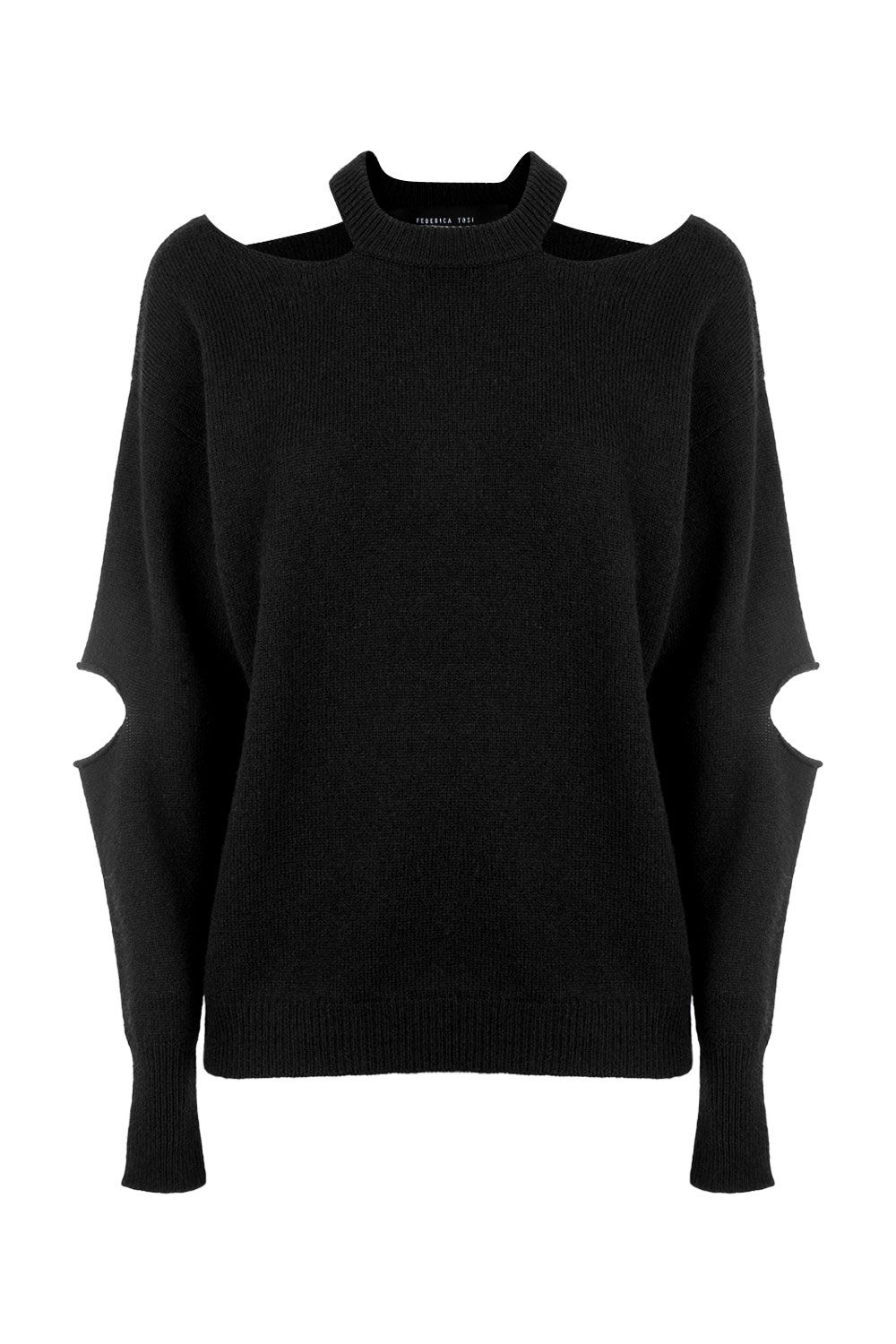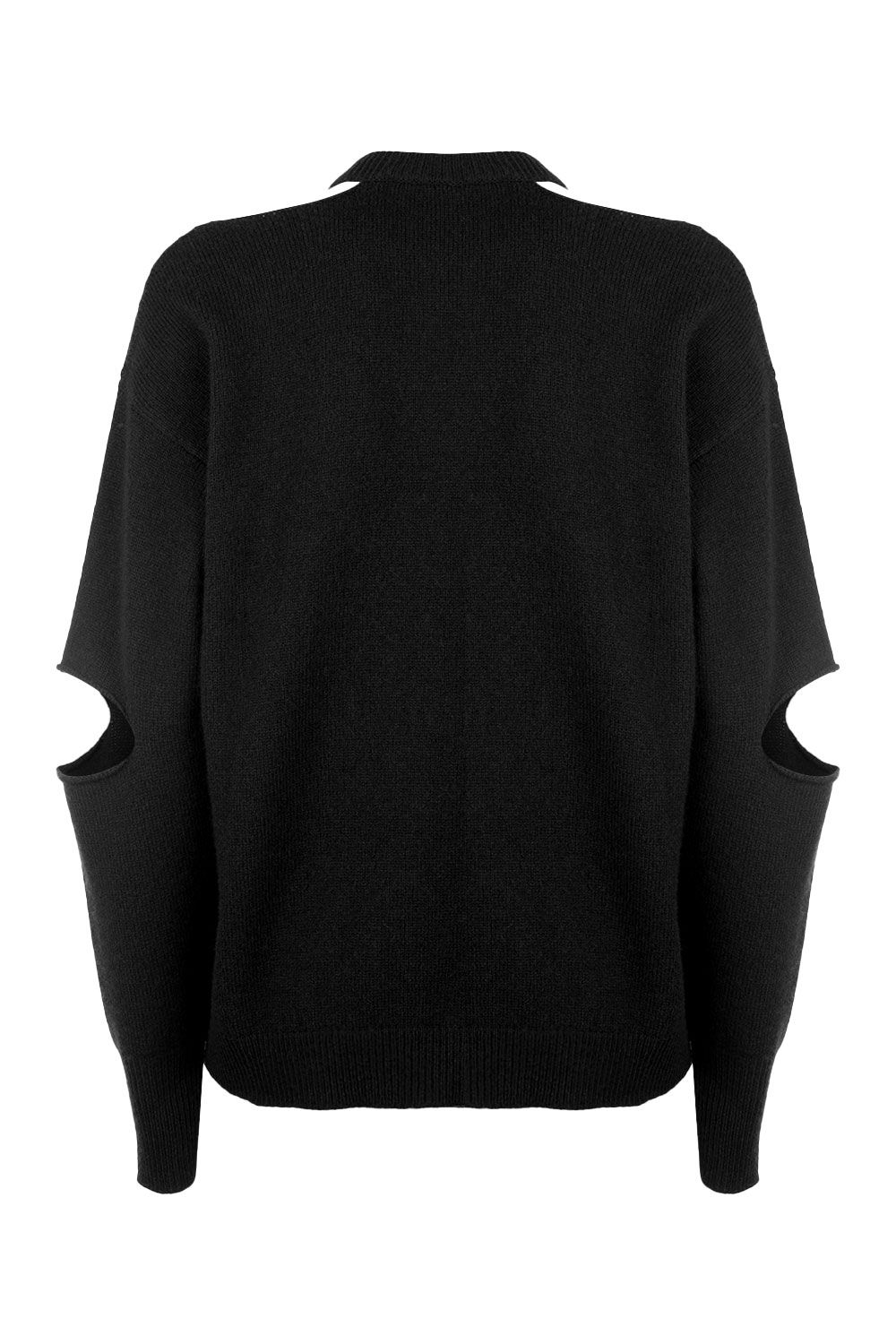 Maglia girocollo oversize in misto lana nera, dettagli cut out sulle maniche e sul collo, polsini e orlo a coste