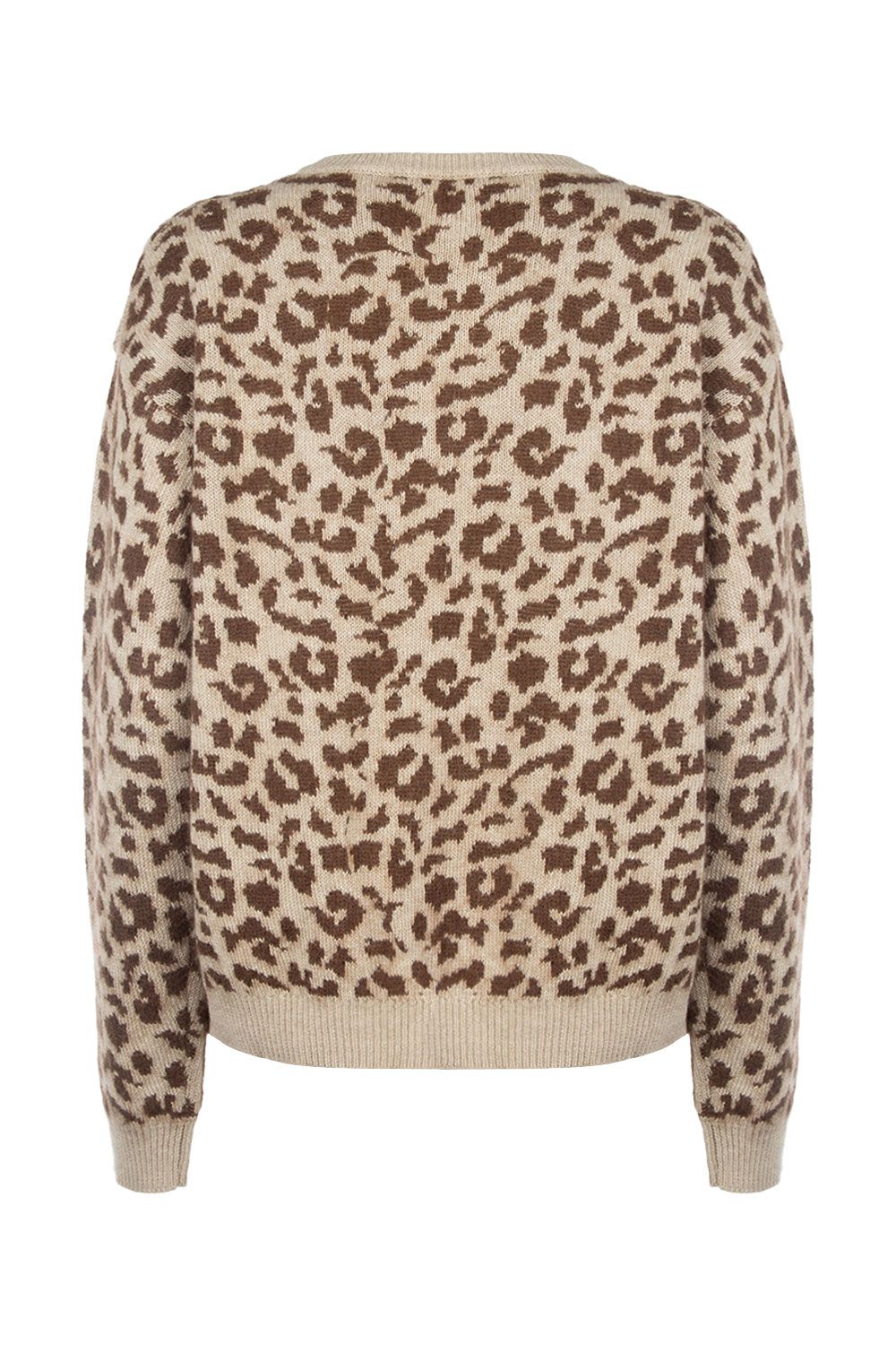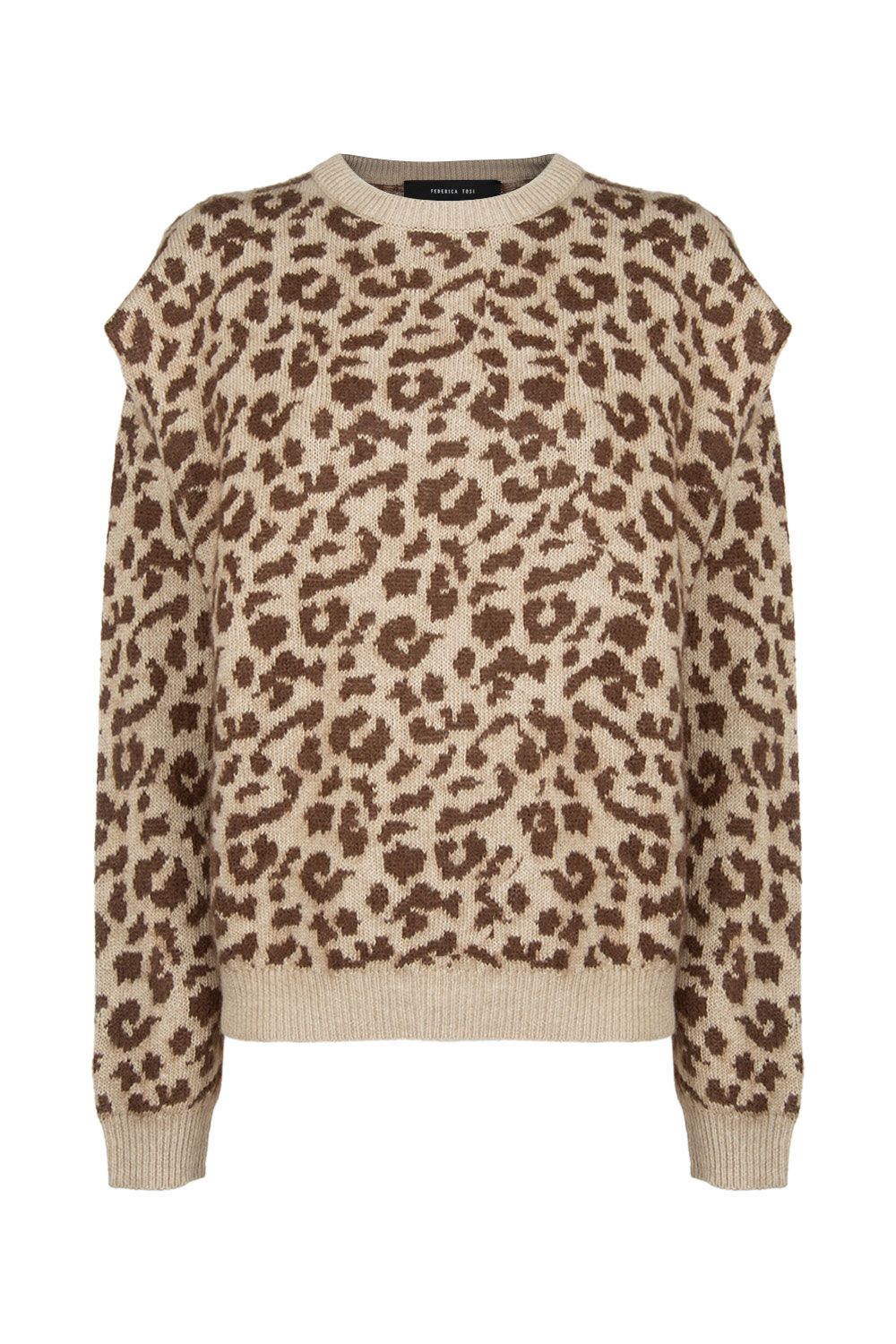 Maglia oversize girocollo in misto lana stampa animalier beige e marrone, dettagli cut out sulle maniche, collo polsini e orlo a coste