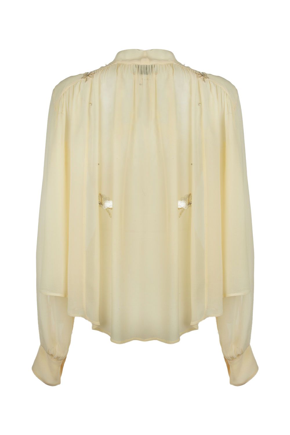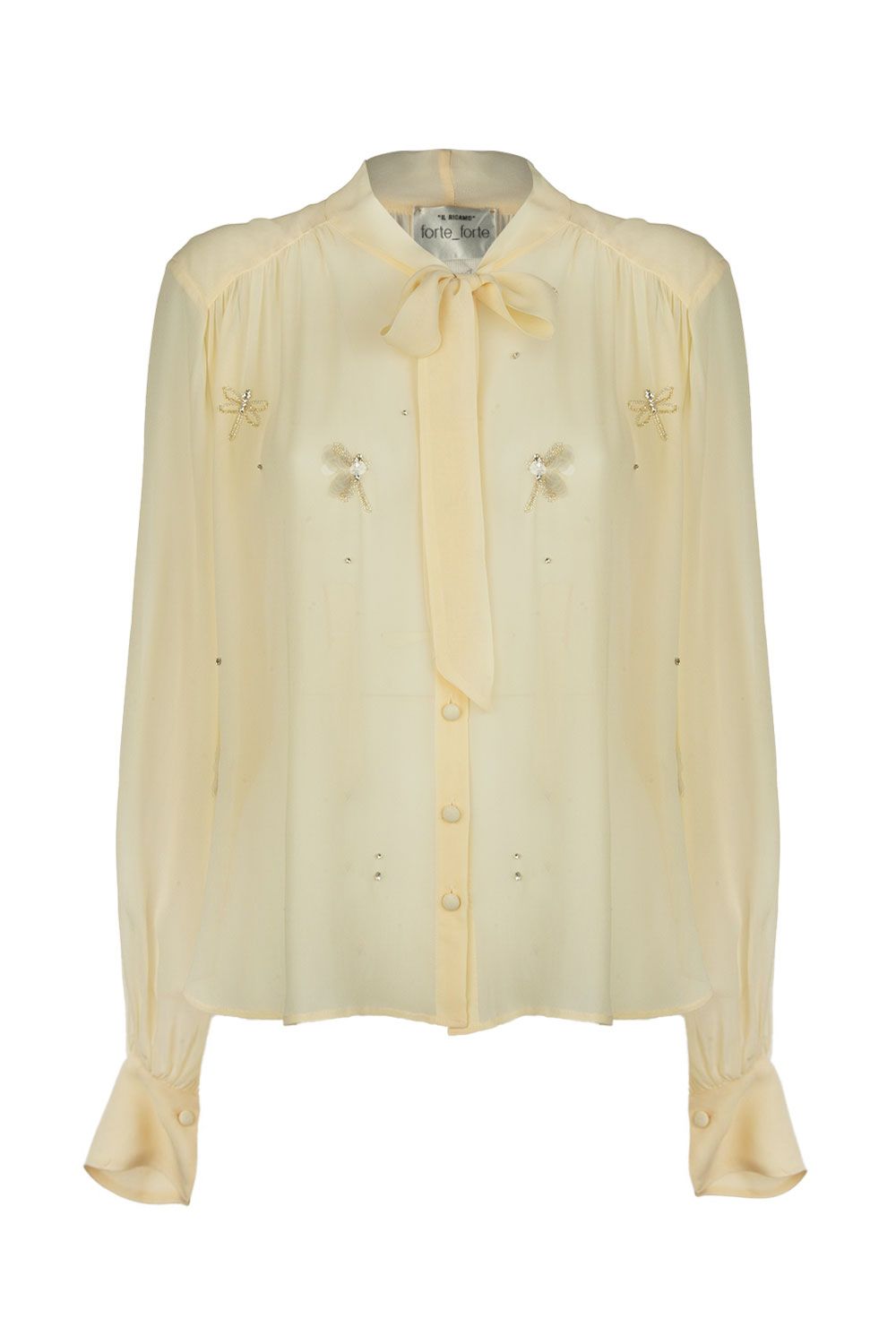 Camicia boxy in georgette trasparente avorio, chiusura con bottoni ricoperti e collo con fiocco, libellule applicate di strass e perline
