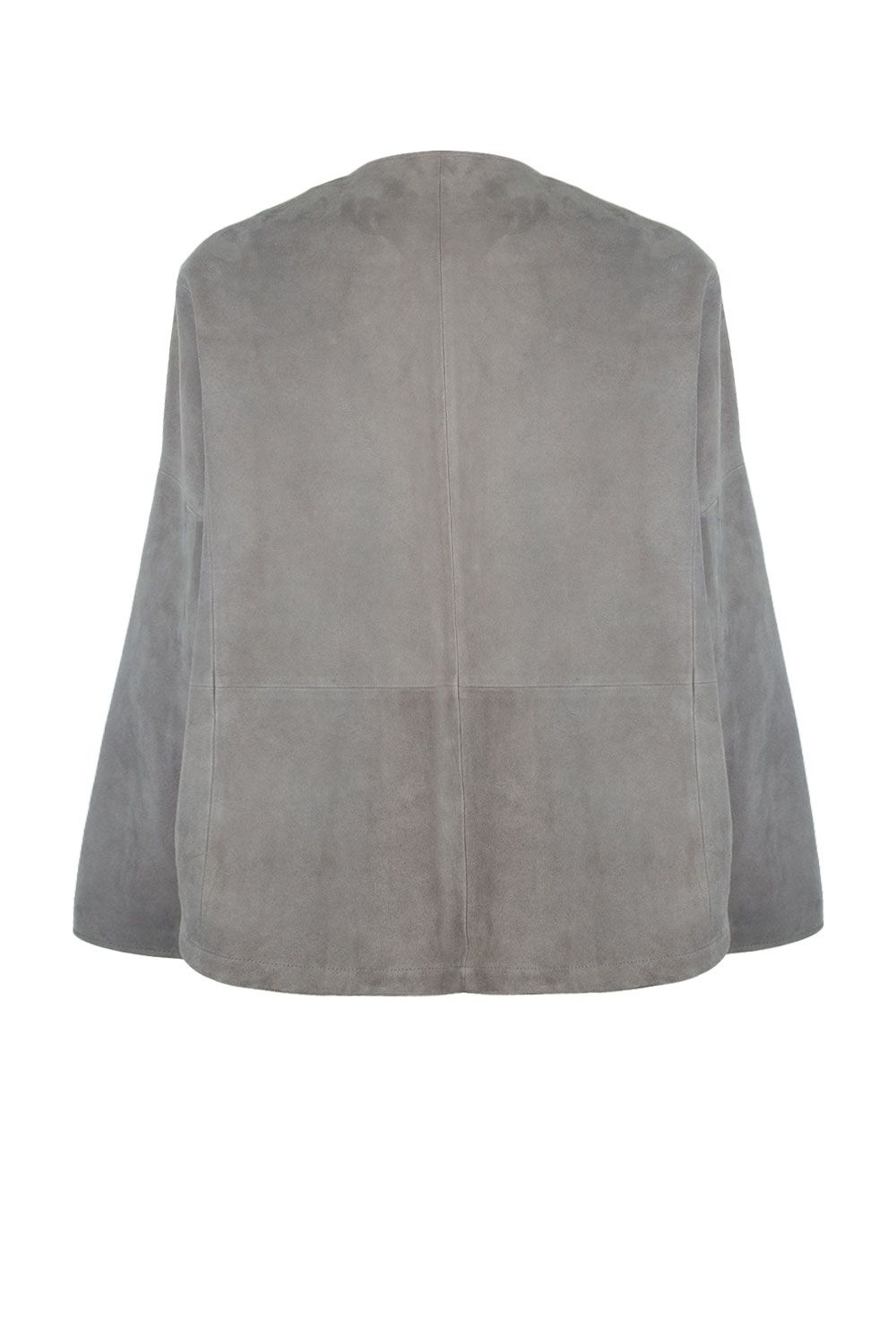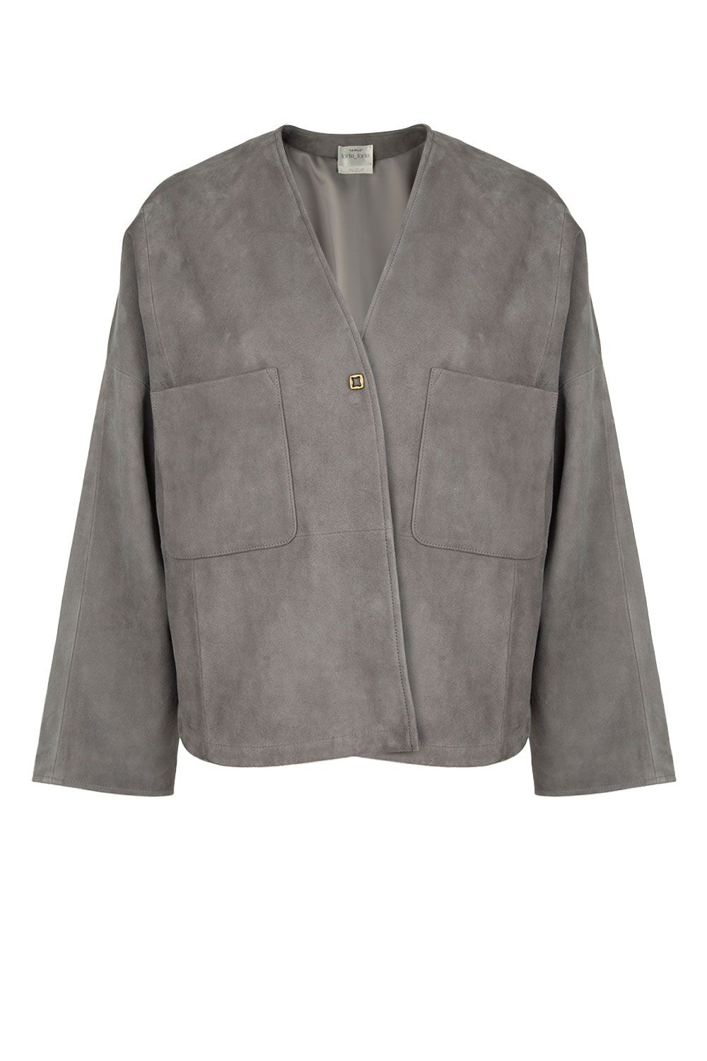 Giacca sfoderata boxy in suede grigia, cuciture a vista, chiusura con un bottone frontale in metallo oro, due tasche piatte frontali, spacchi laterali e orlo stondato
