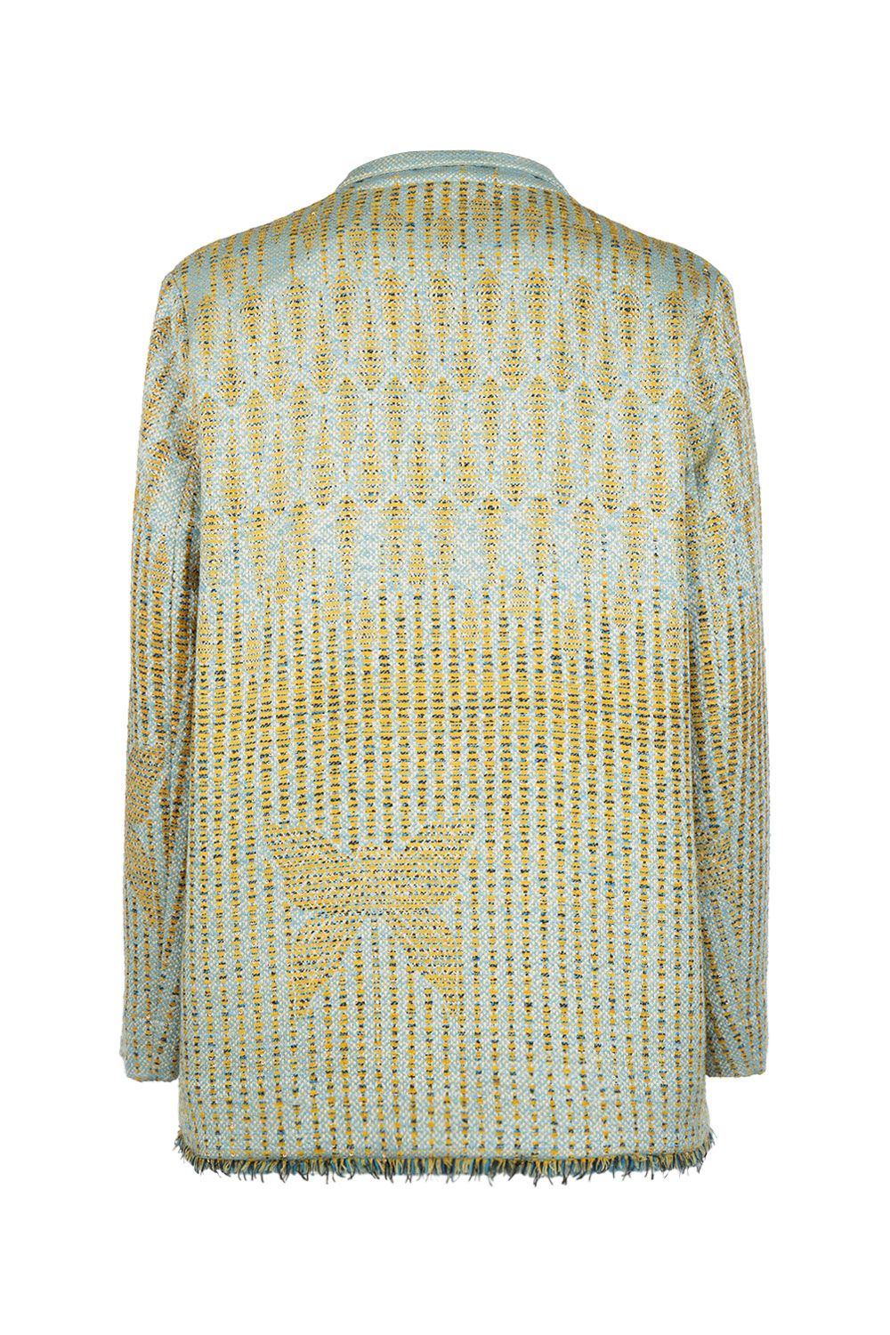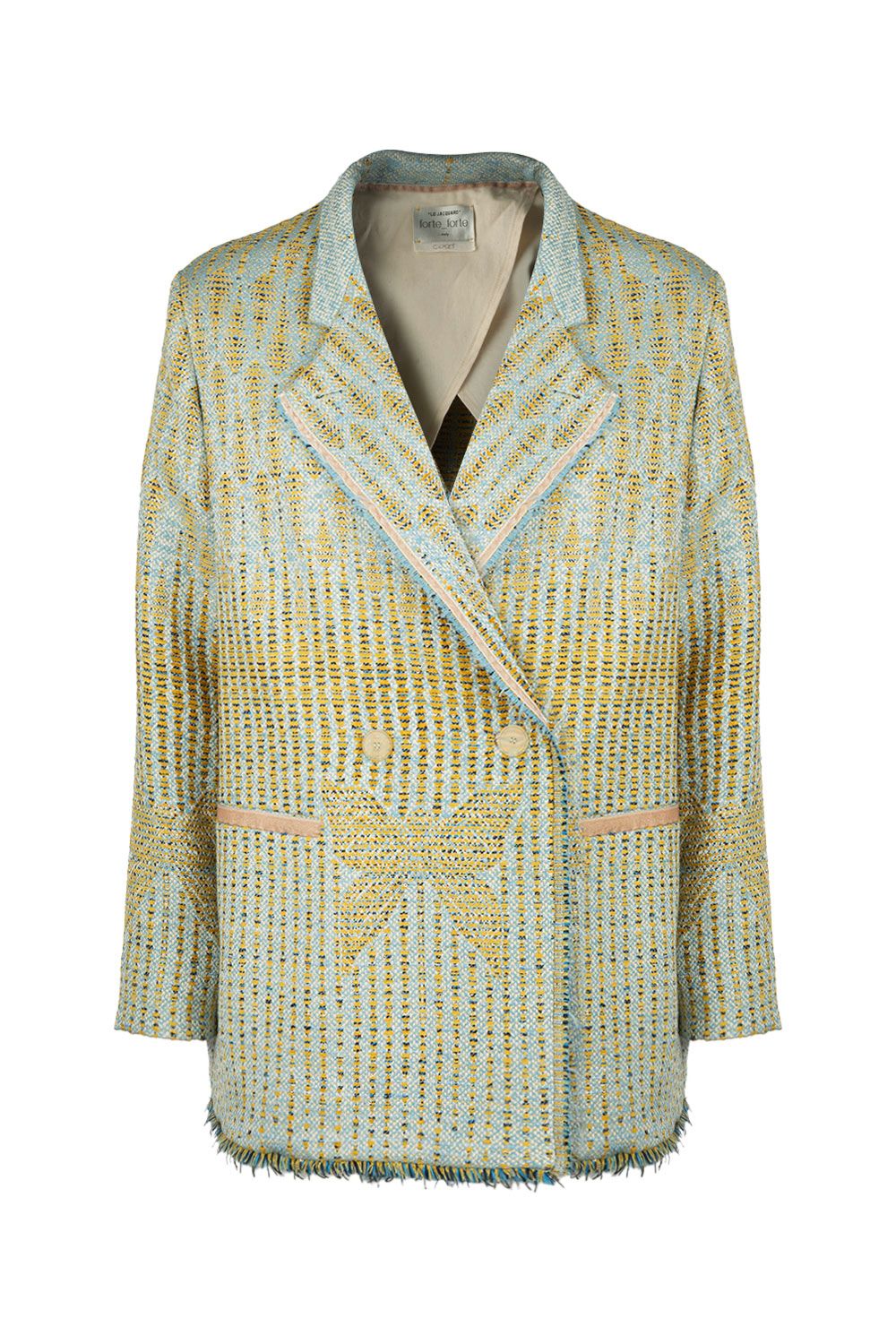 Giacca cappotto doppiopetto sfoderata in misto cotone bouclé fondo azzurro, inserti ocra e lamè, chiusura con bottoni fronti semitrasparenti ocra, due tasche a filetto frontali con fettucce effetto velluto avorio, orlo sfrangiato