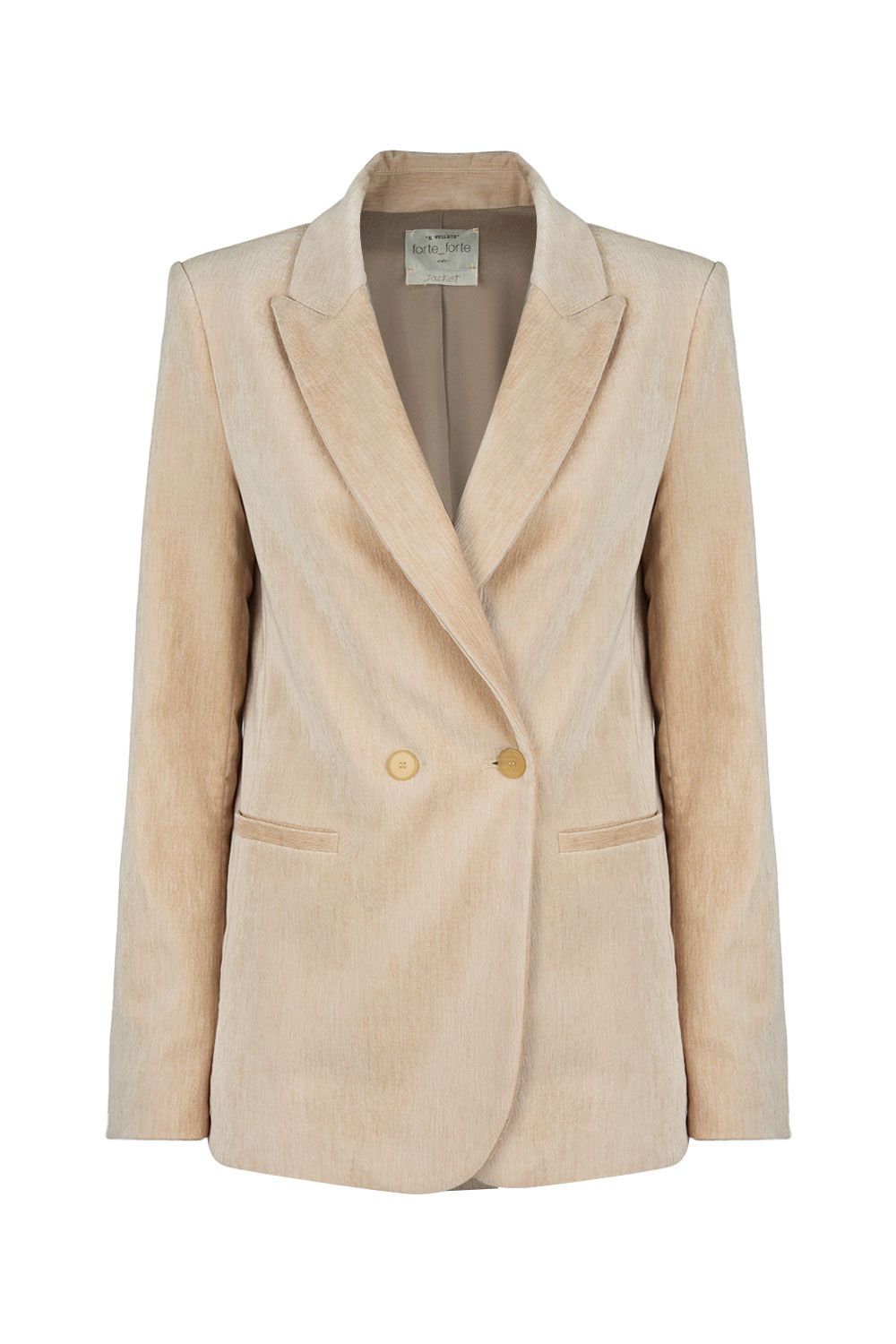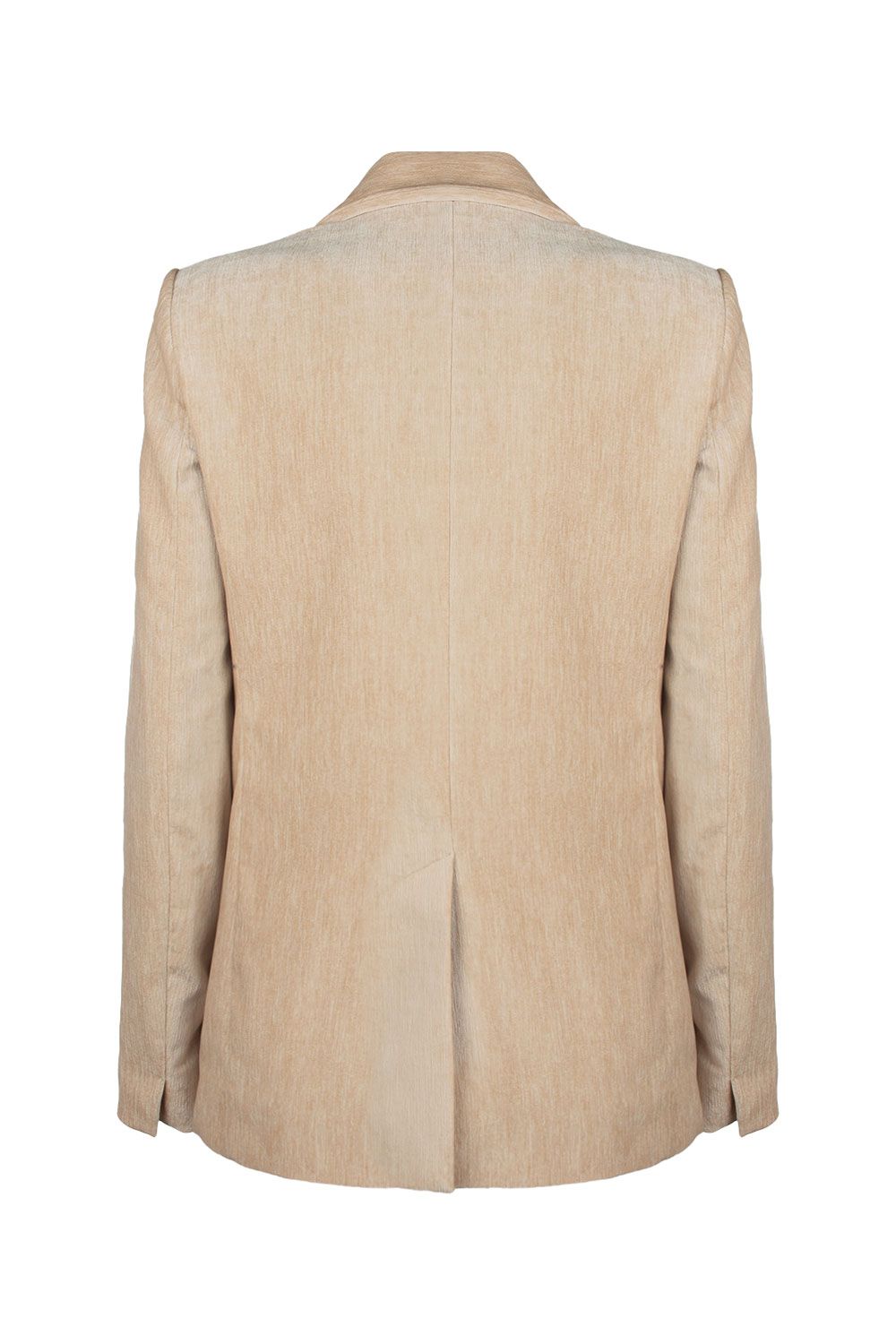 Giacca doppiopetto effetto velluto beige, spalle imbottite, bottoni chiusura tono su tono due tasche a filetto frontali, spacco sul retro e spacchetto sul fondo delle maniche, fodera in misto viscosa