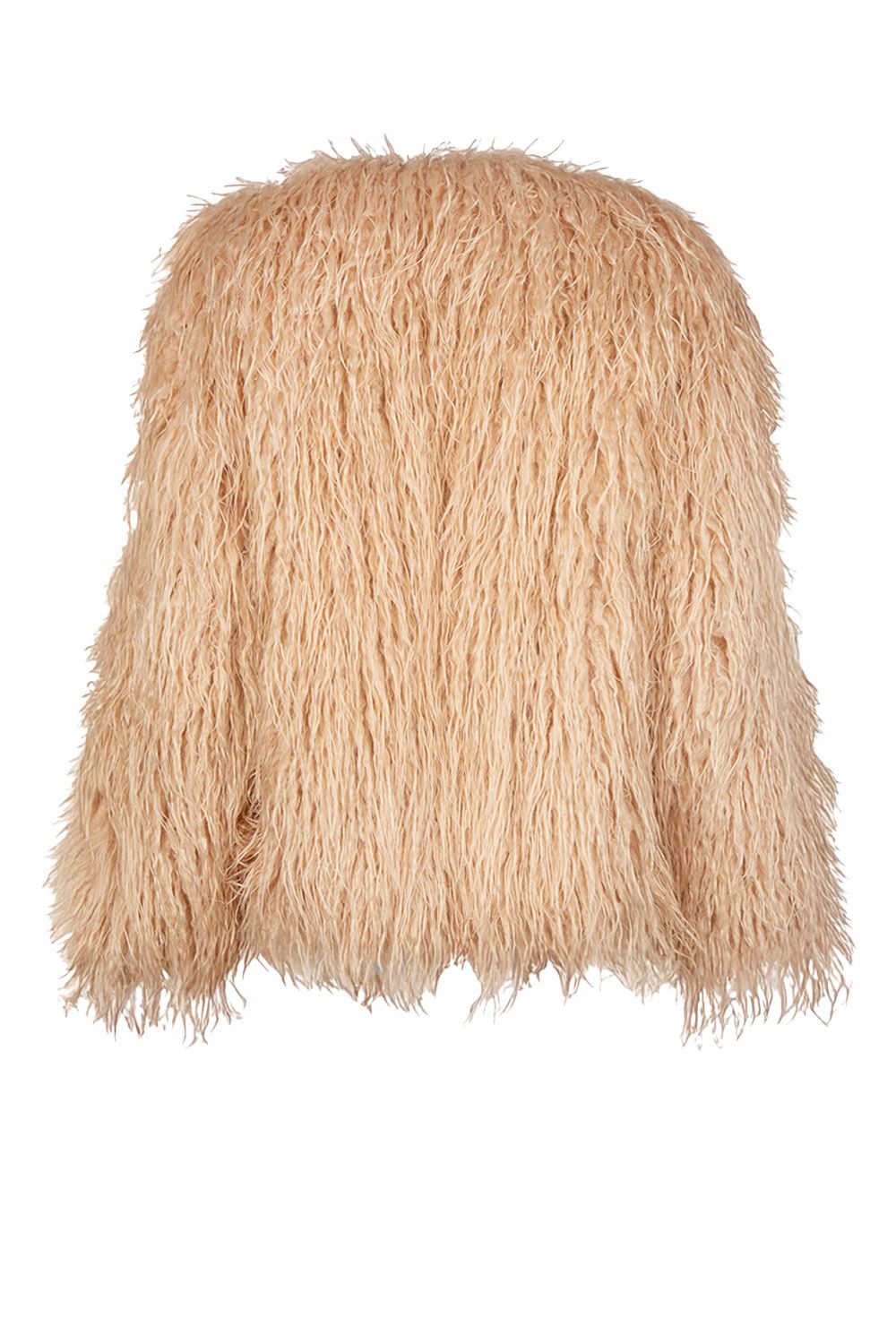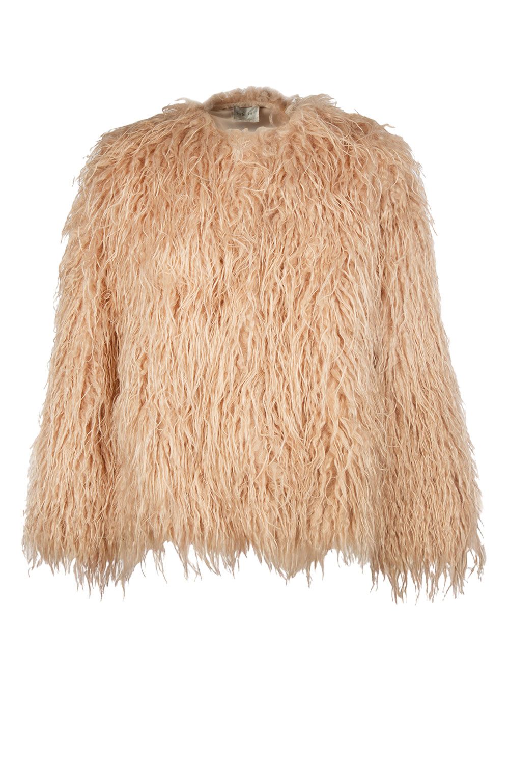 Giacca kimono corto a pelo riccio rosa cipria, chiusura con bottoni automatici nascosti, collo tondo, foderata