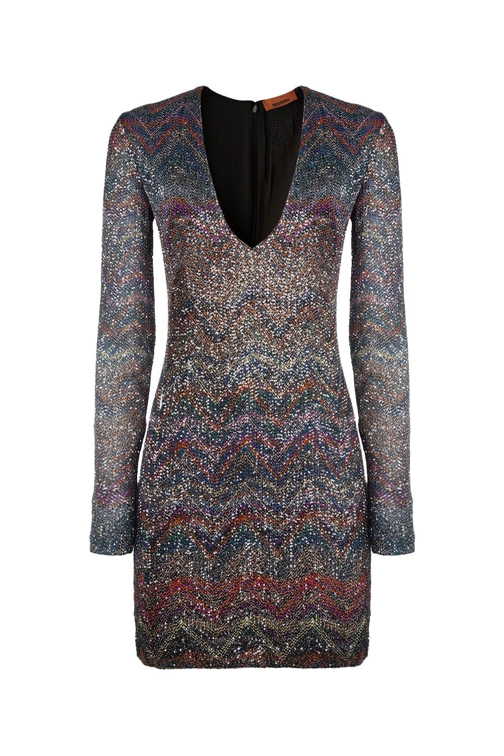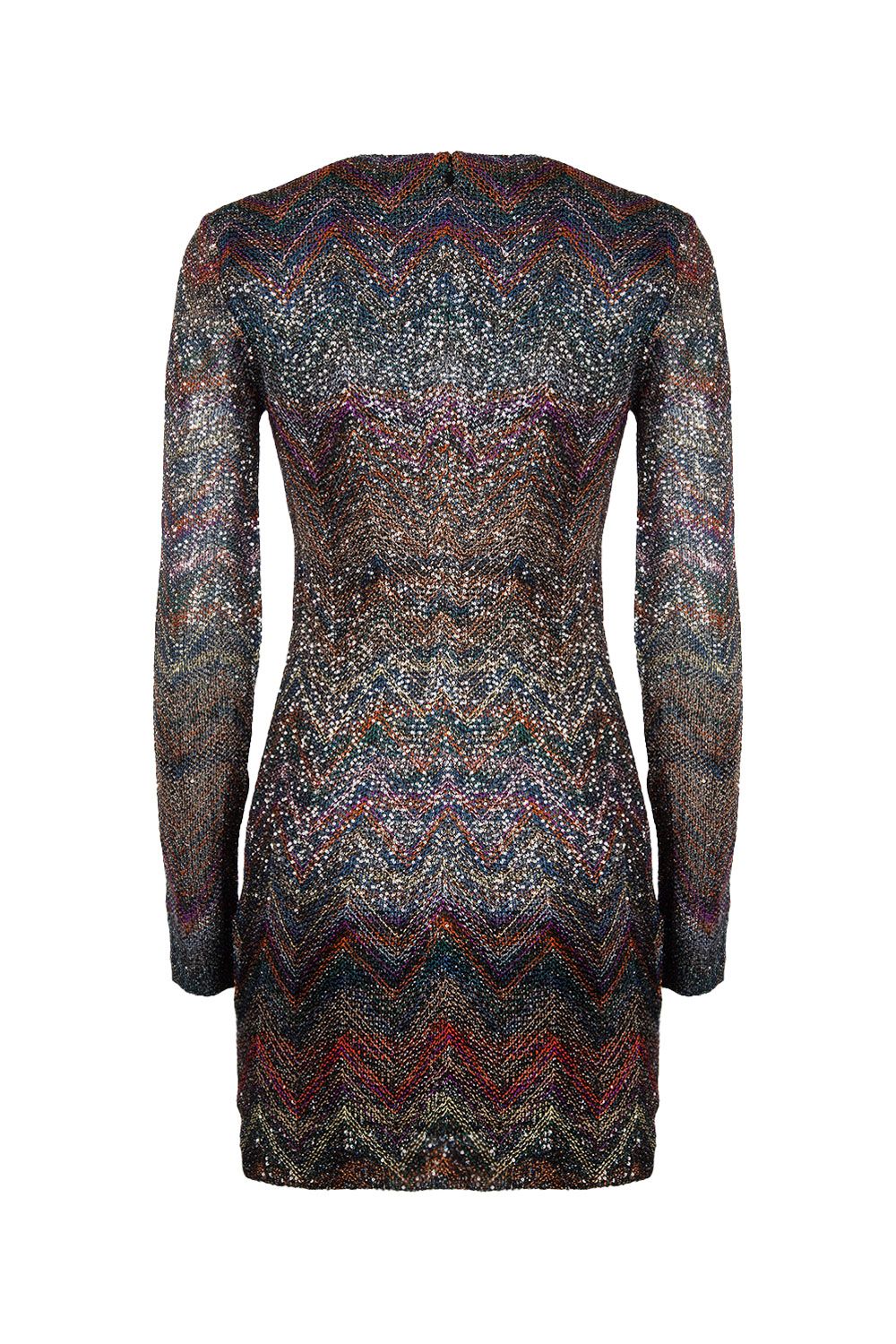 Abito corto scollo a V in misto viscosa, motivo iconico a zig zig multicolore e paillettes applicate, manica lunga, sottoveste nera cucita e chiusura con zip sul retro