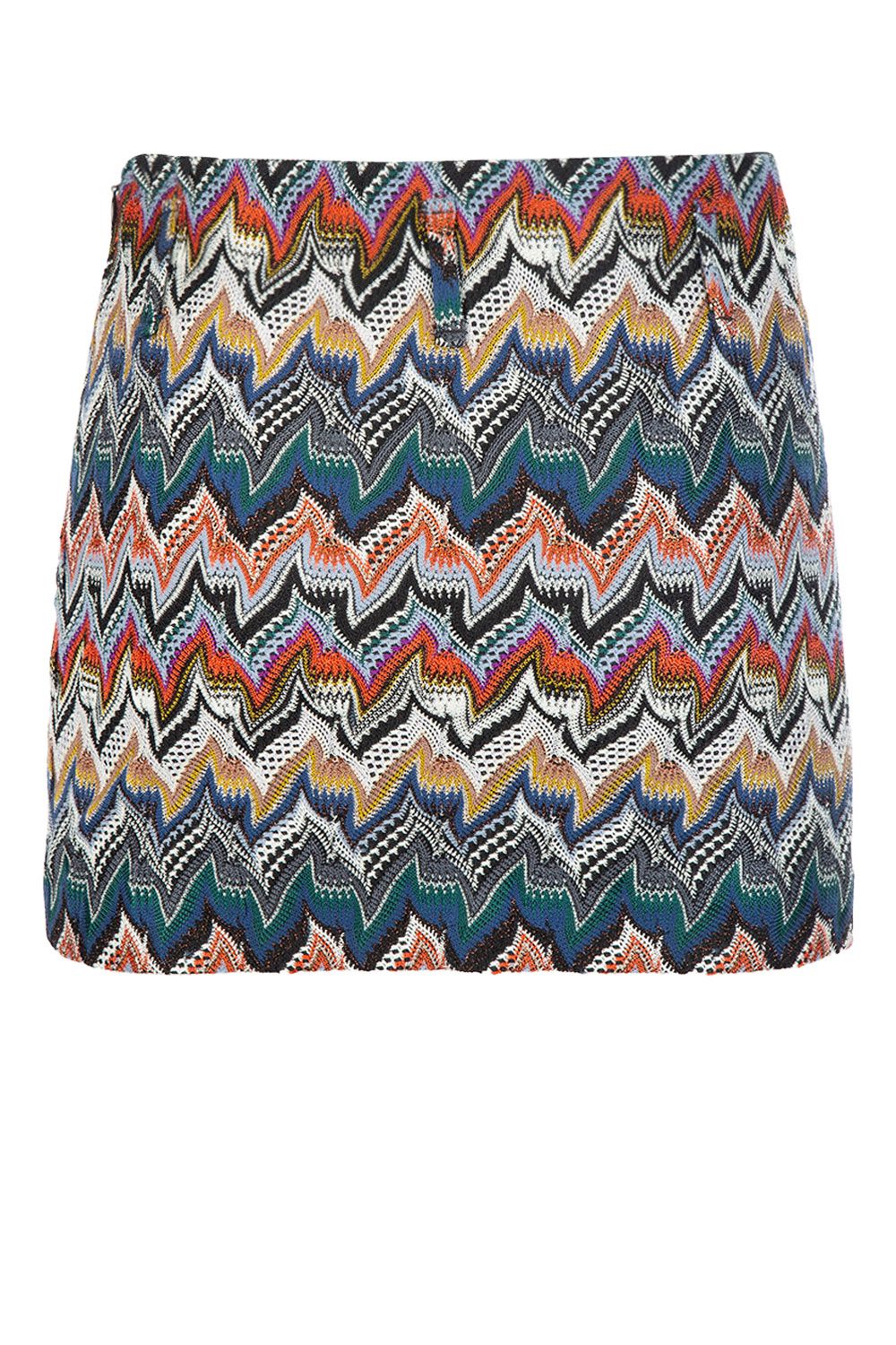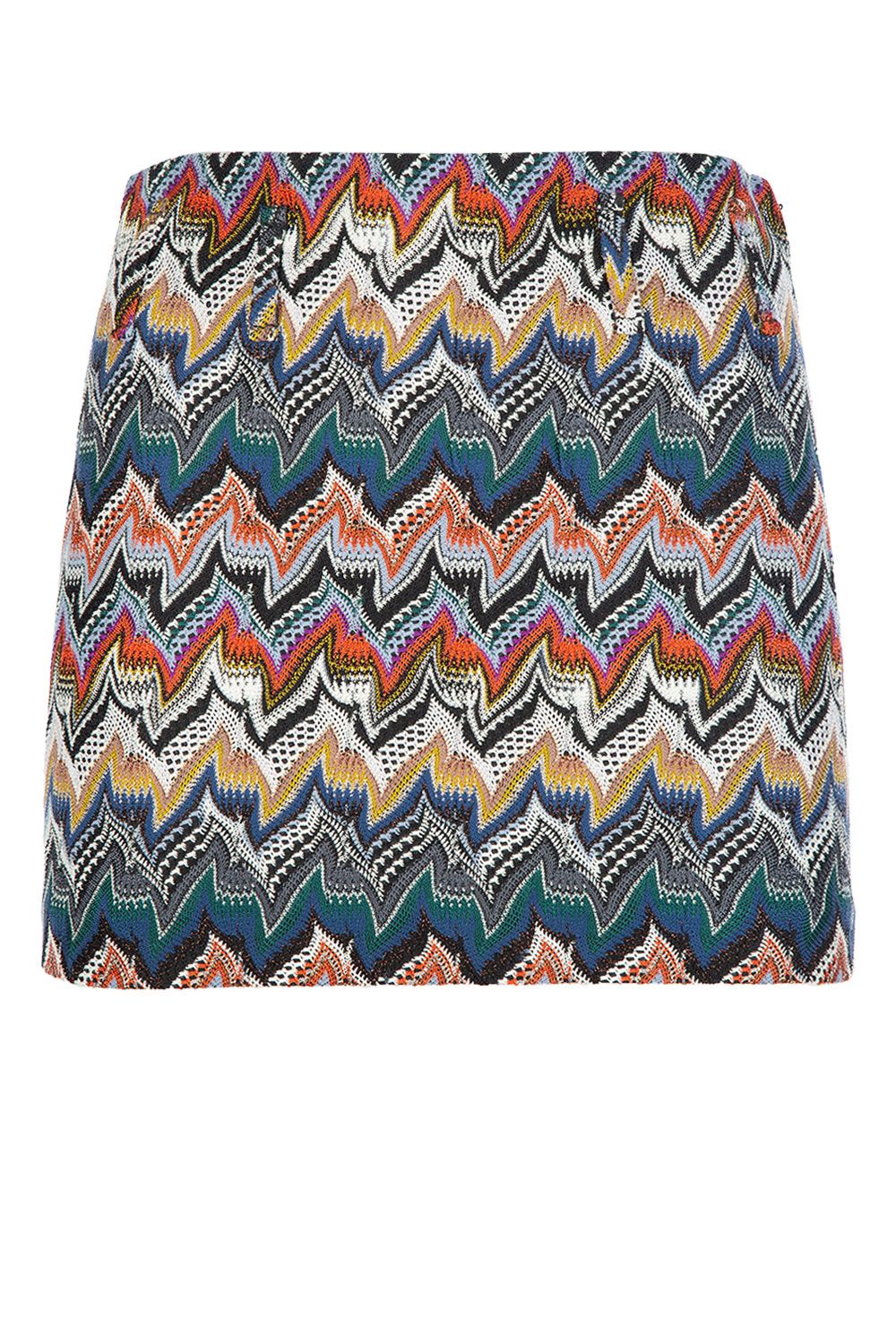 Gonna corta in viscosa e lana con motivo iconico a zig zag multicolore, inserti in lamé, chiusura laterale con zip e passanti