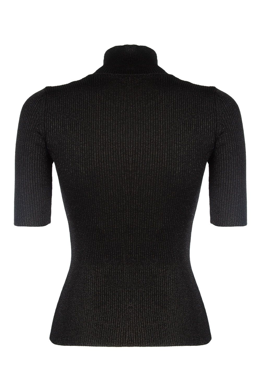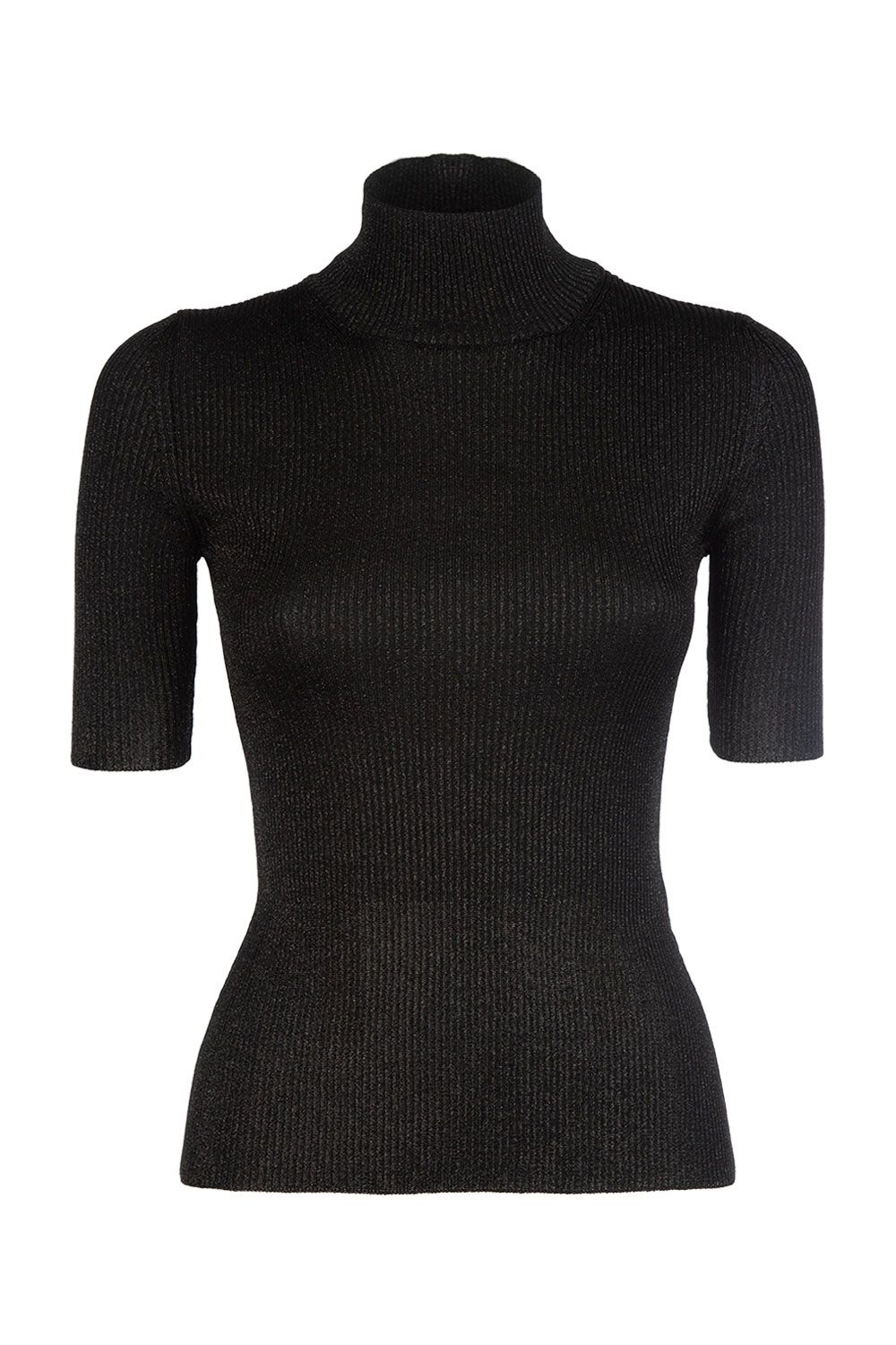 Maglia slim collo a cratere a coste sottili nera con inserti lamé manica corta