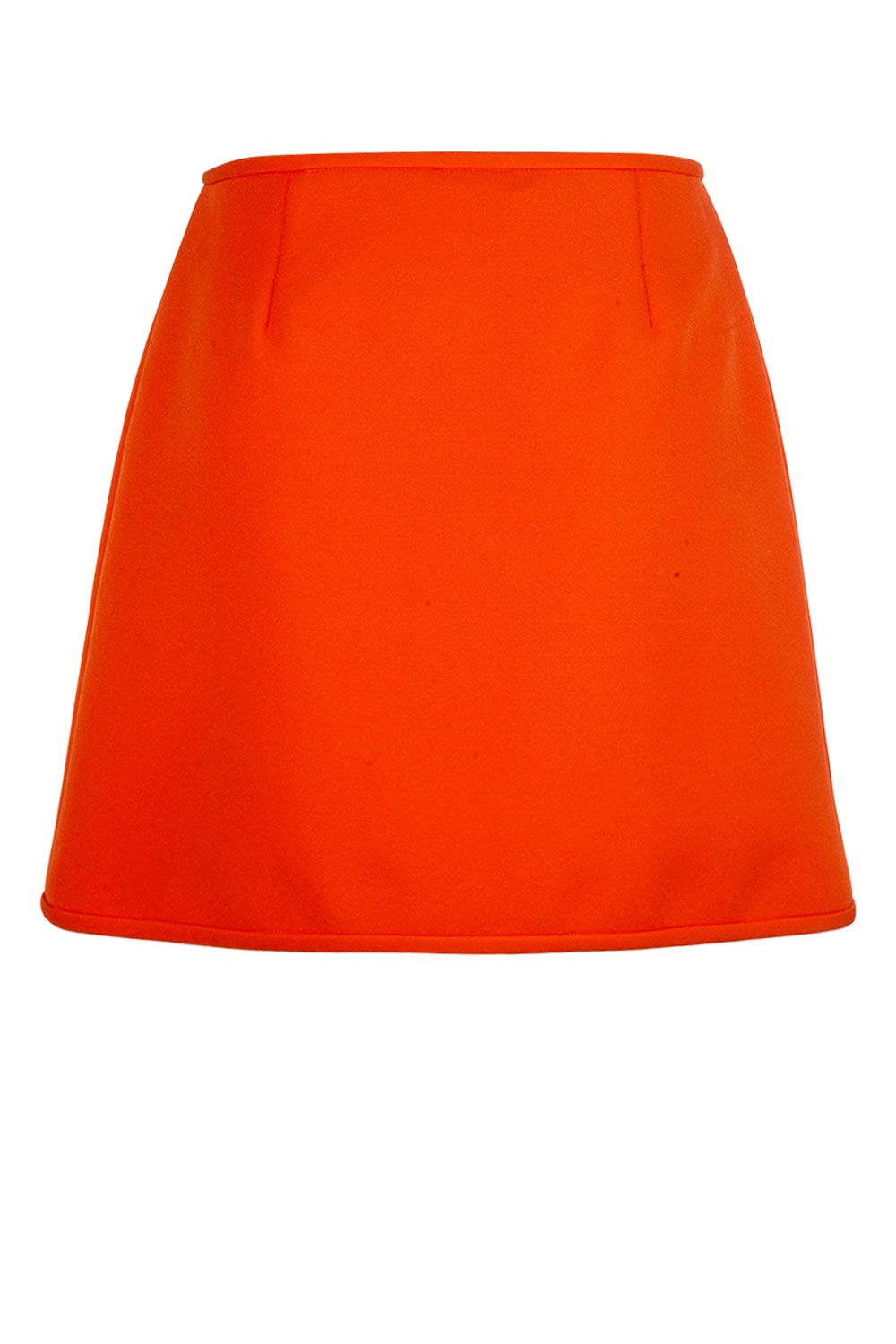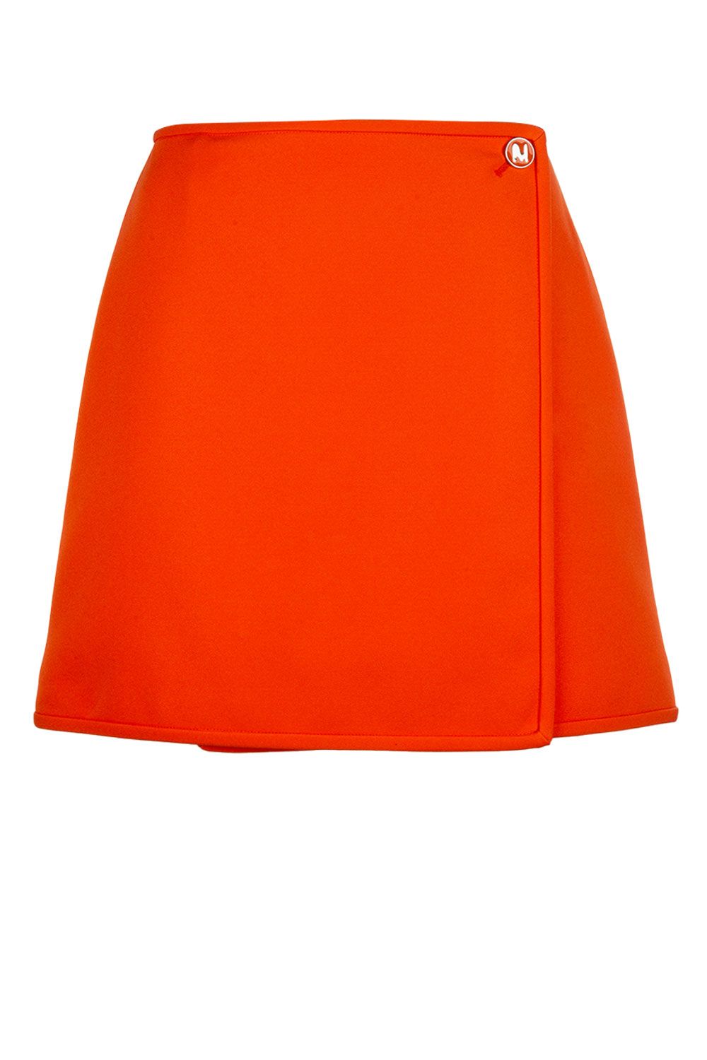 Gonna corta a portafoglio in cady arancione, chiusura con bottone interno nero e bottone esterno in metallo argento e arancione con logo“M”, bordi delle cuciture in rilievo rigidi