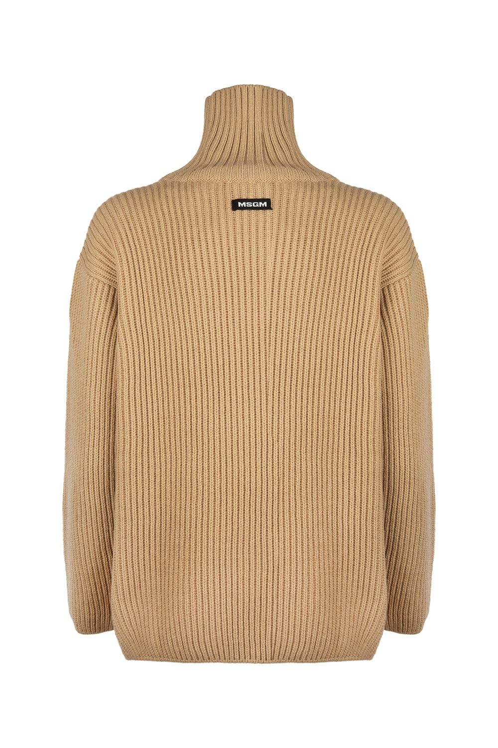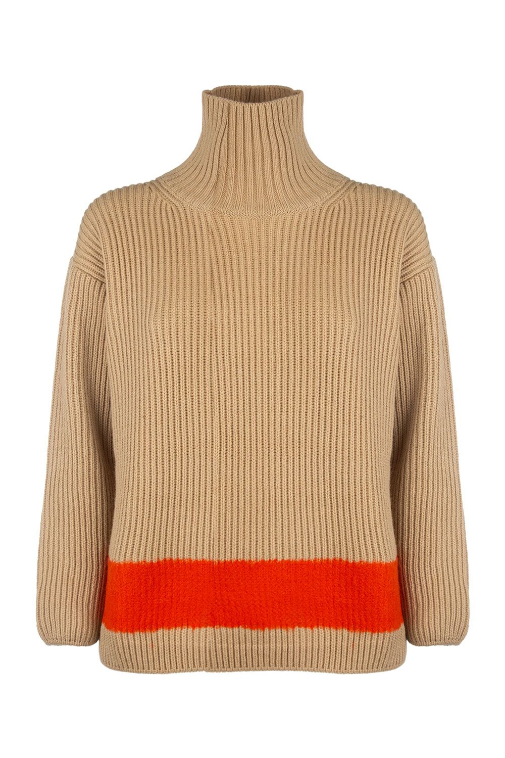 Maglia collo alto oversize cammello con inserto frontale arancione, polsini e orlo leggermente stondati