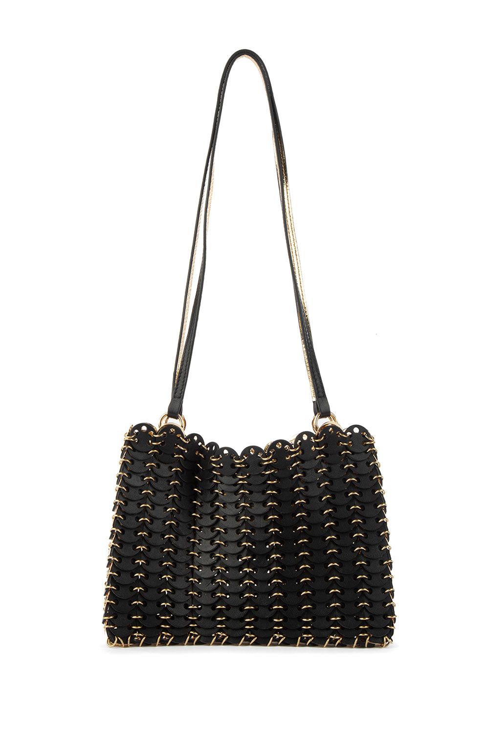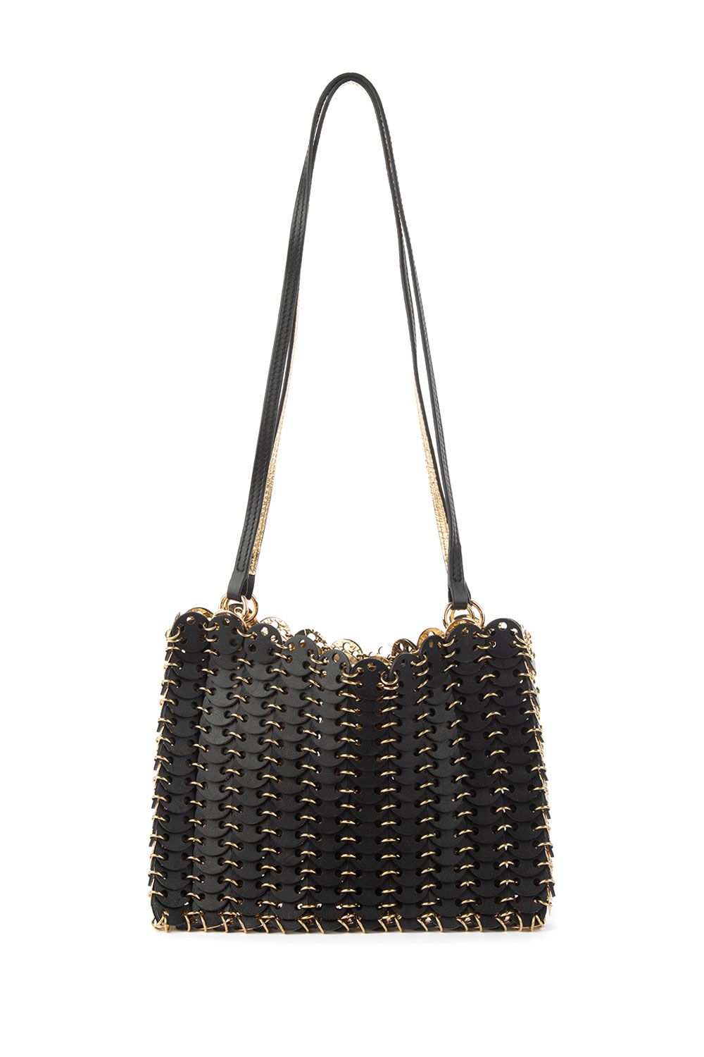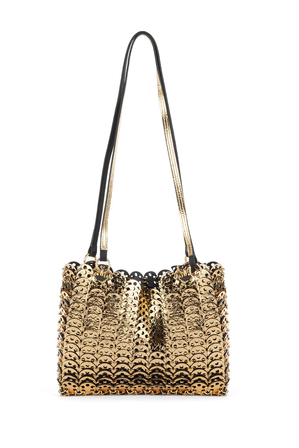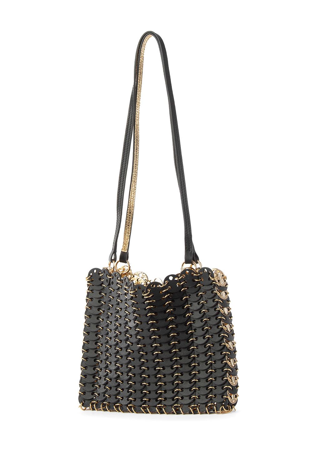 Borsa 1969 reversibile nera e oro, dischetti di morbida pelle liscia da un lato e metallizzata oro dall’altro, manici sottili e dettagli in metallo