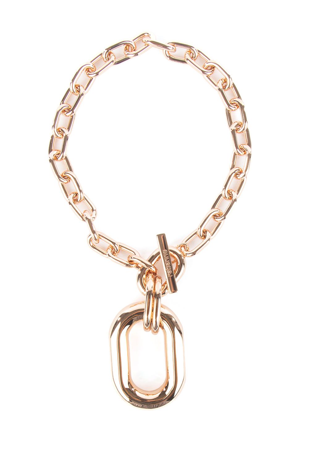 Collana in alluminio con maglia a catena oro rosa, logo inciso, pendente oversize e chiusura frontale con alamari