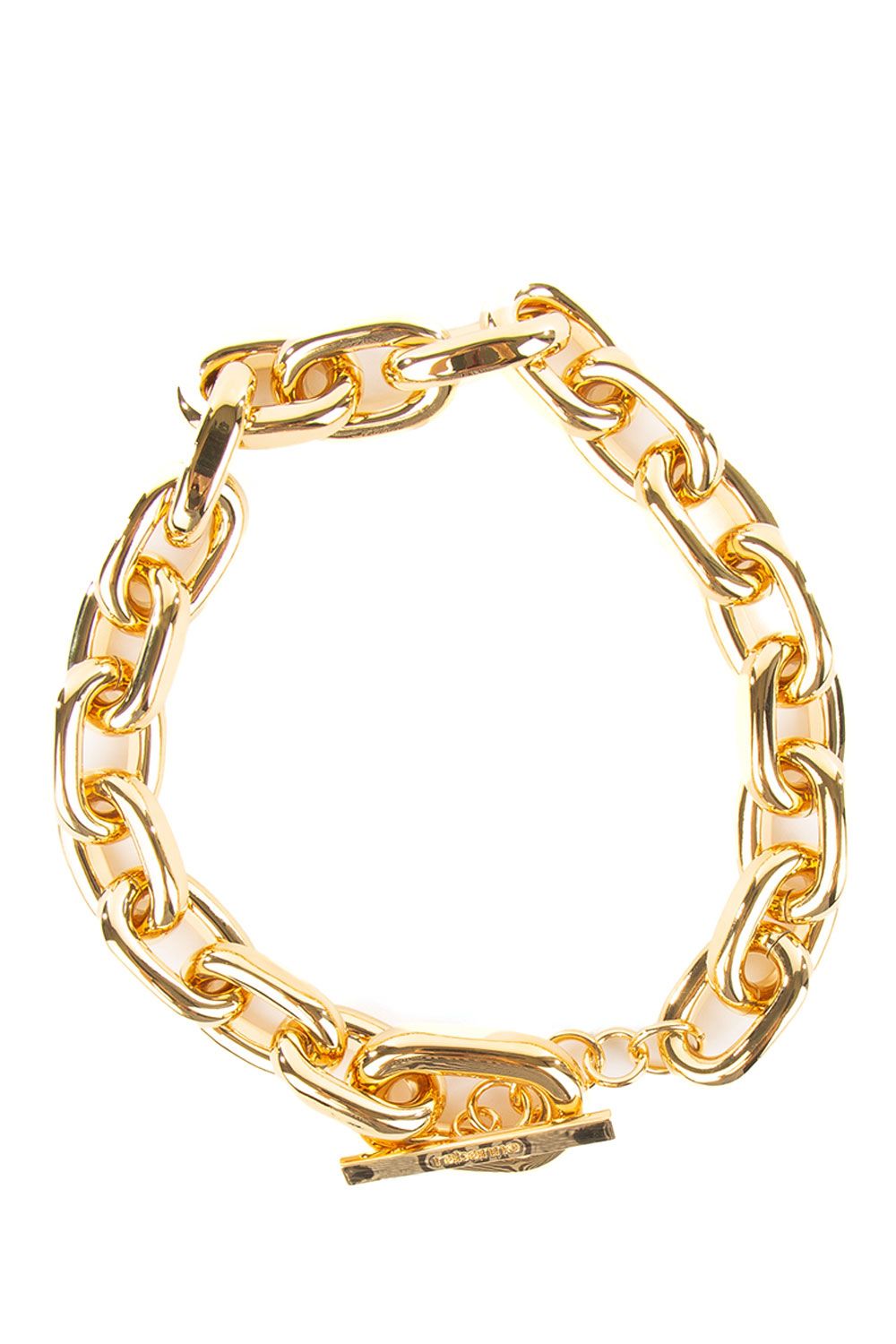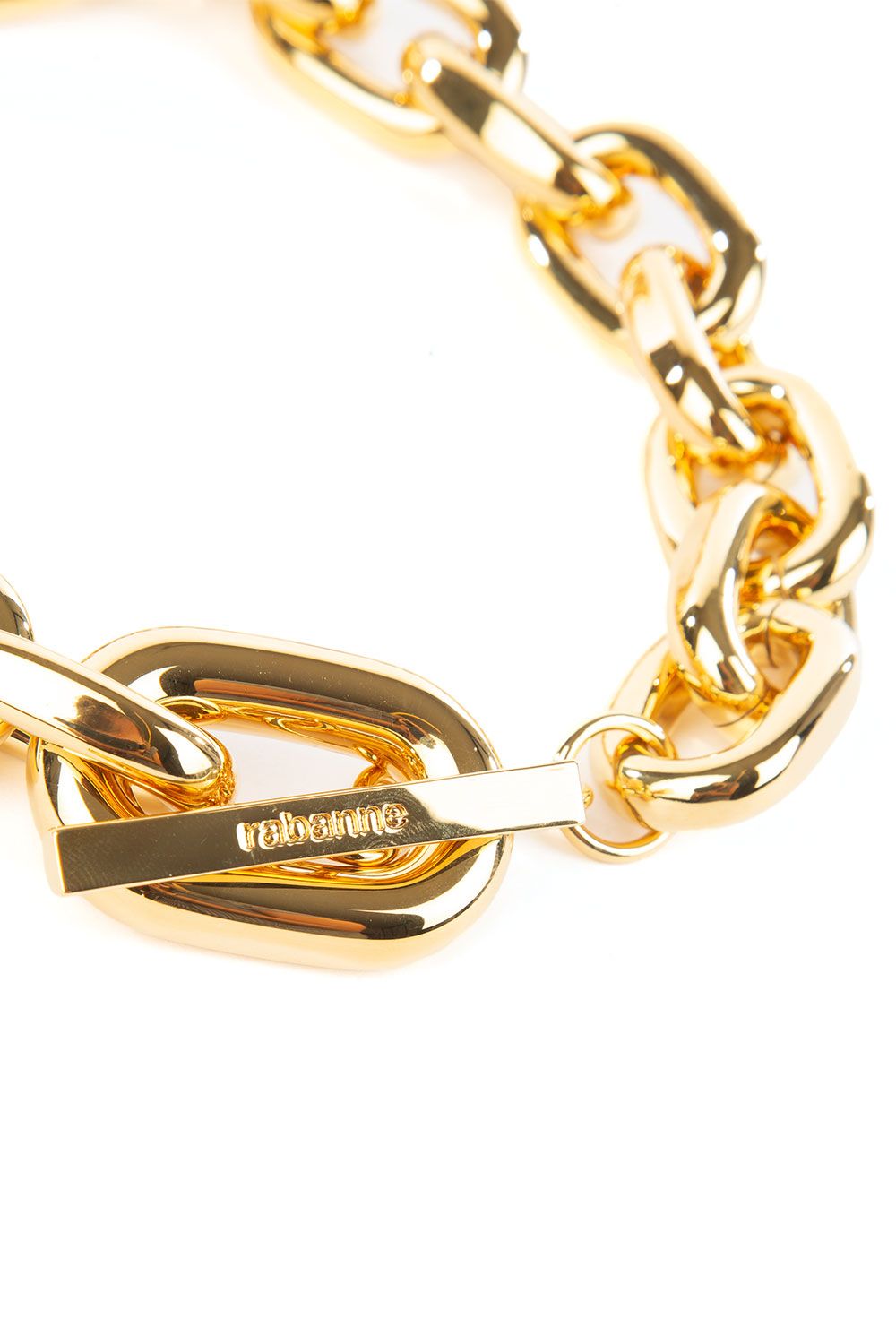 Collana in alluminio e ottone con maglia a catena oro, logo inciso e chiusura con alamari
