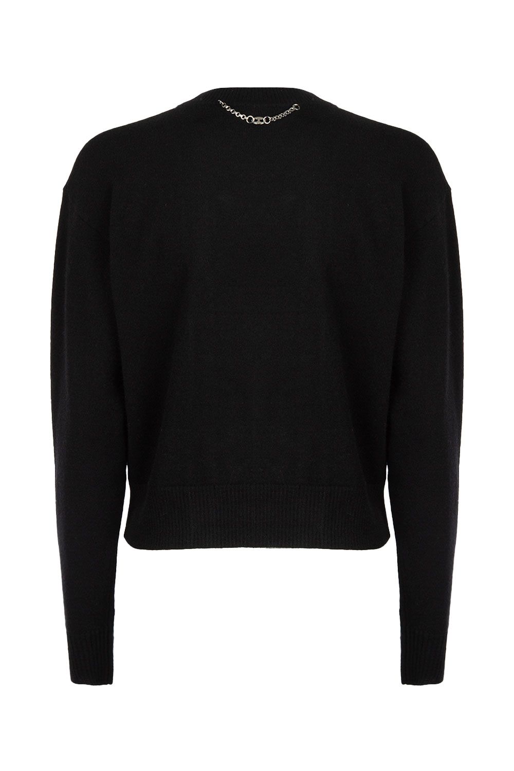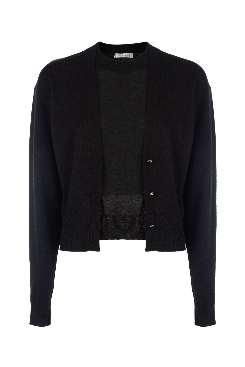 Maglia cardigan girocollo in misto lana e cashmere nera con bottoni gioiello frontali, manica lunga con polsino e orlo a coste