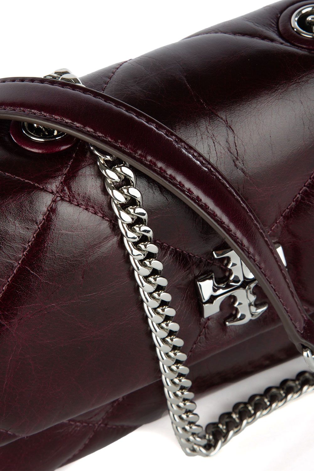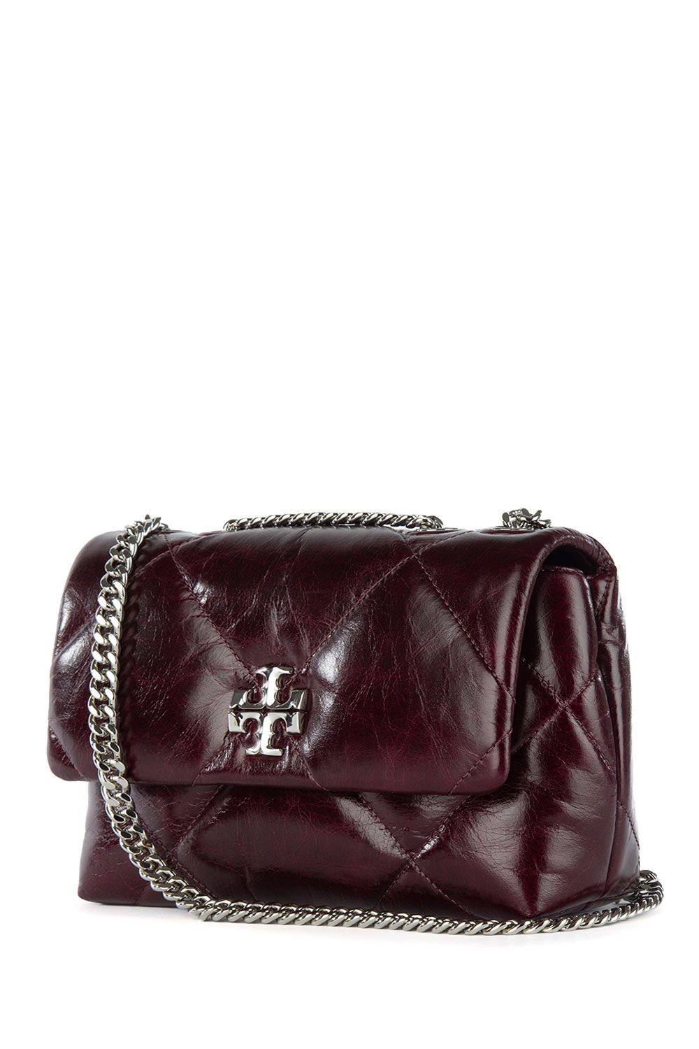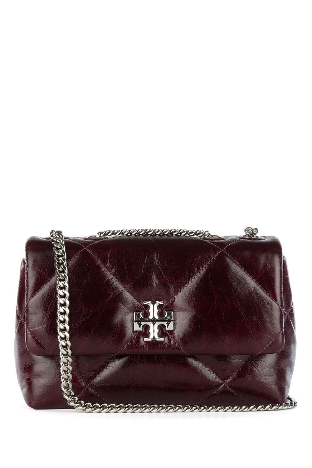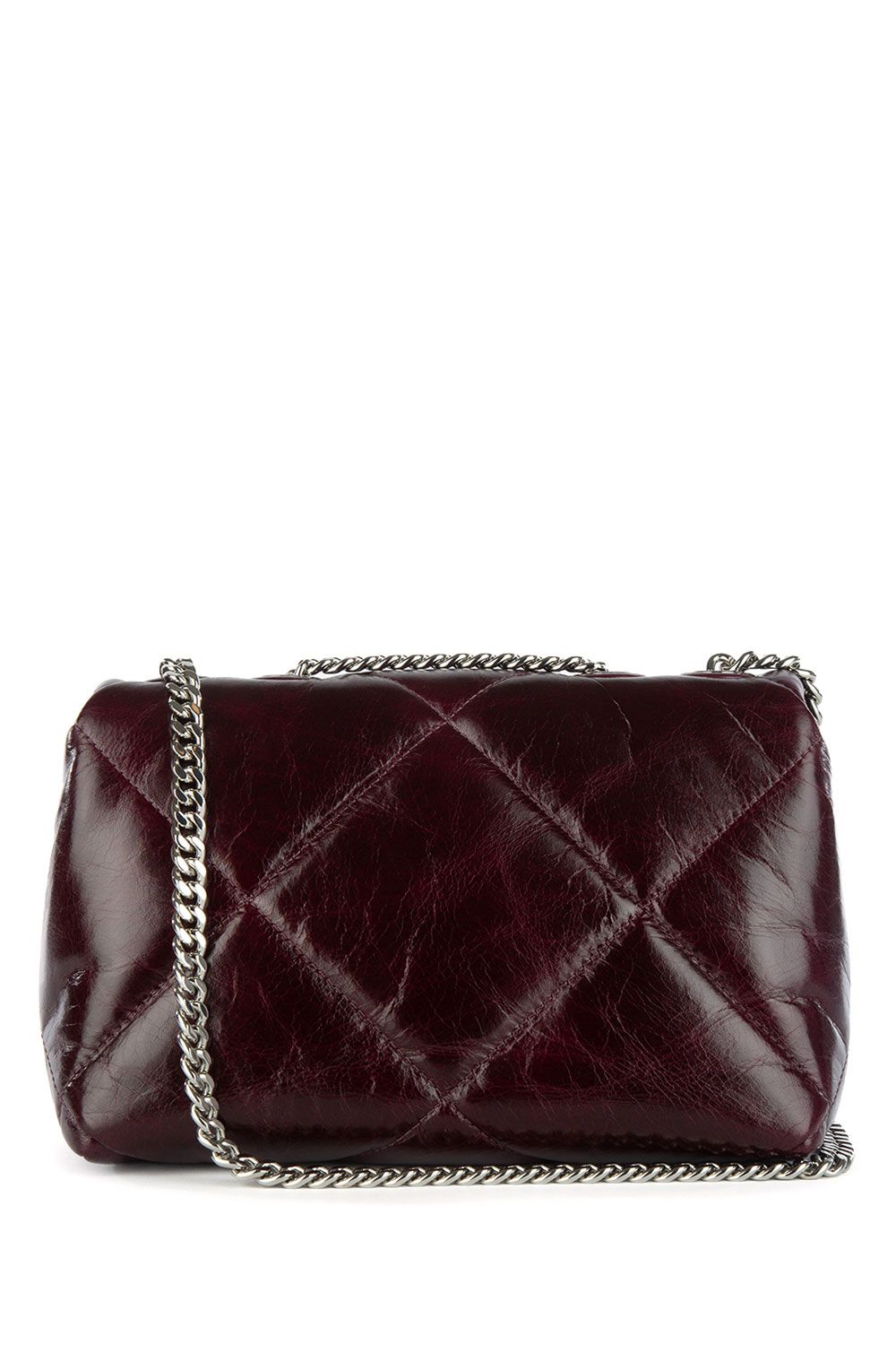 Borsa piccola trapuntata in pelle bordeaux, chiusura magnetica, manici catena e pelle e logo frontale in metallo argento