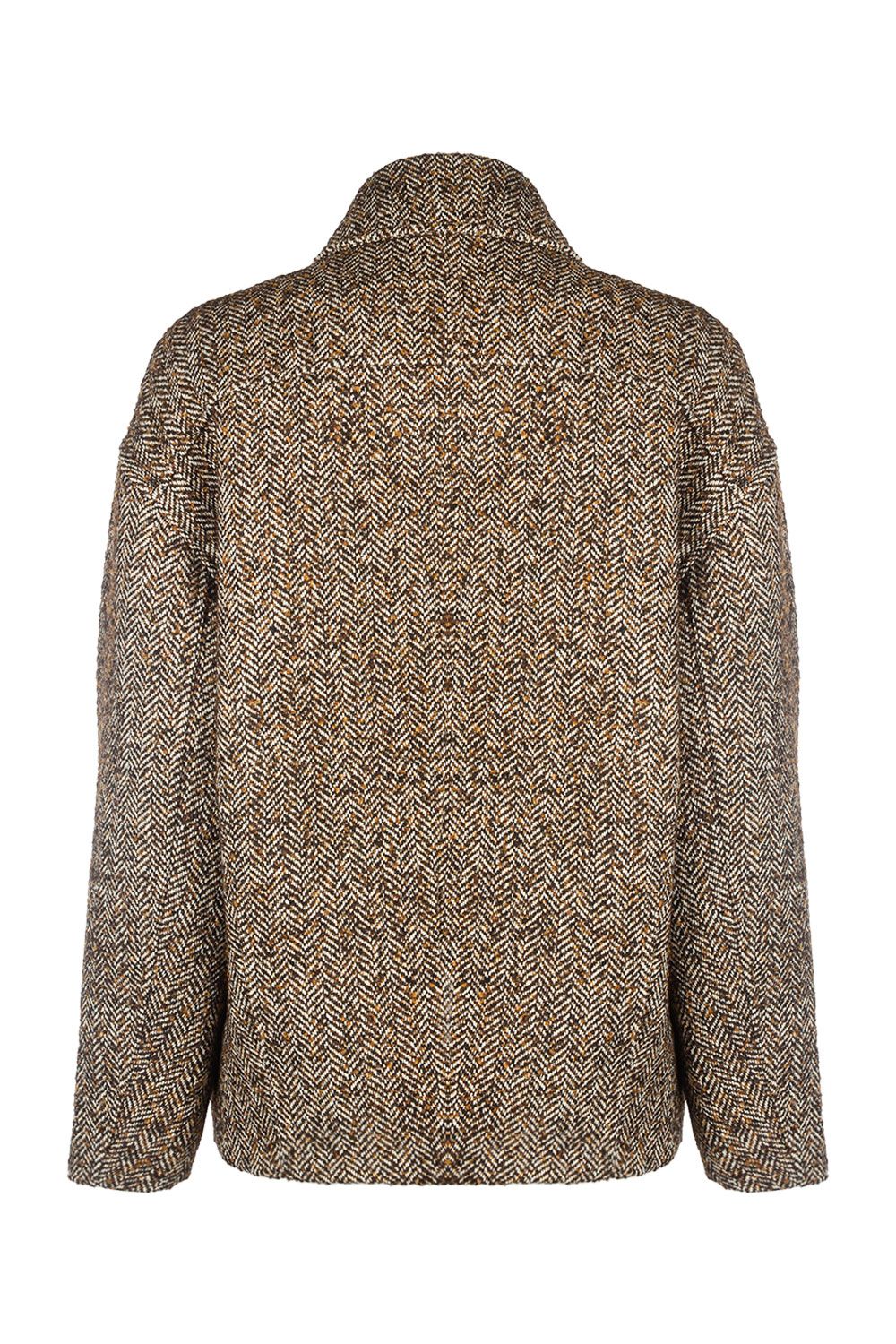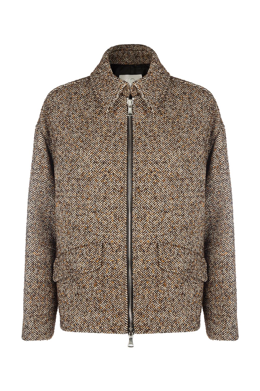 Giacca corta in misto lana spigata sui toni del marrone, colletto a camicia, chiusura con zip, due tasche frontali ad aletta