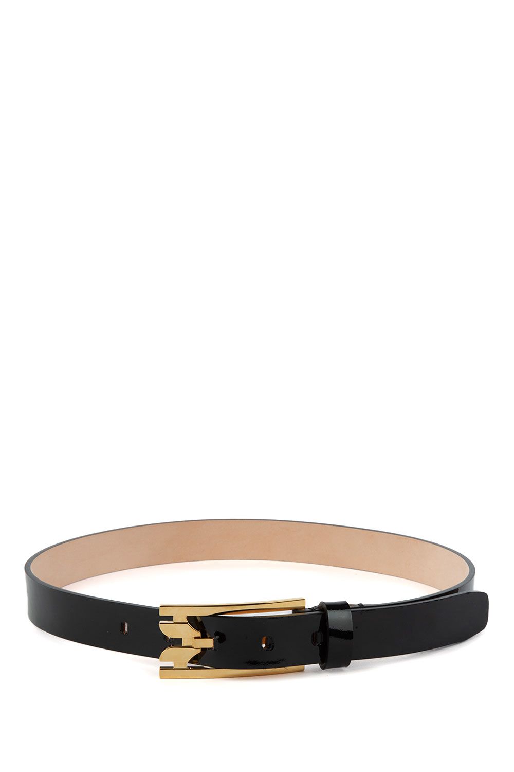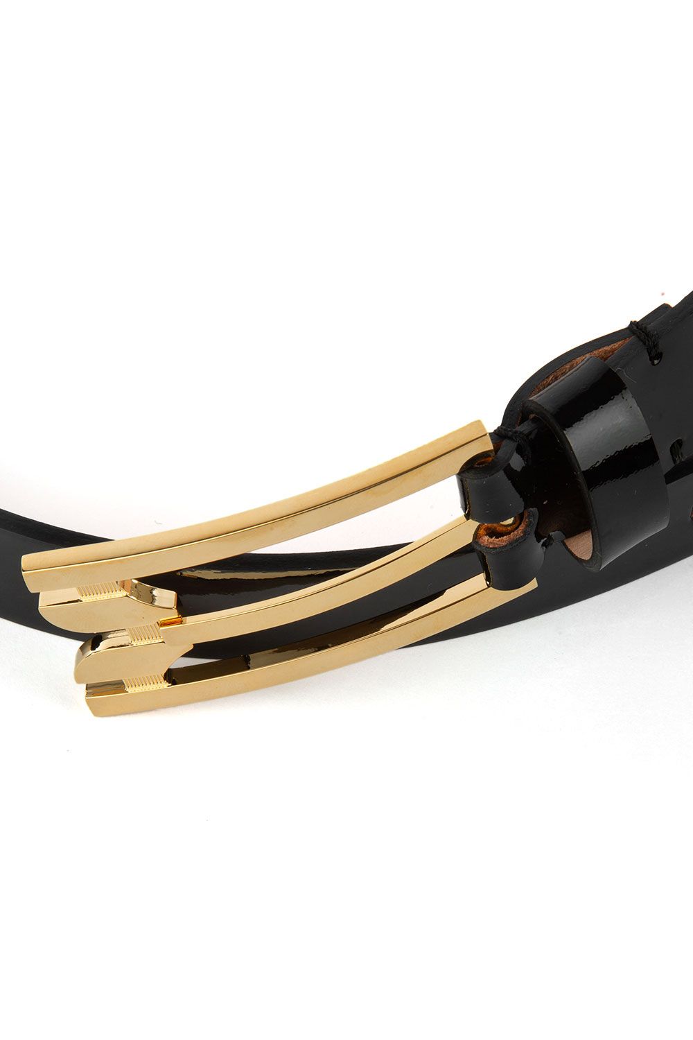 Cintura in pelle effetto vernice nera, fibbia in metallo dorato frontale, altezza 2.5 cm