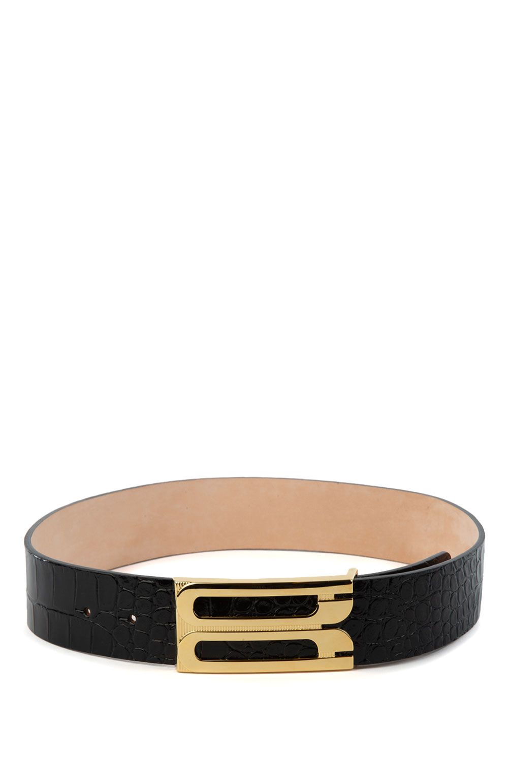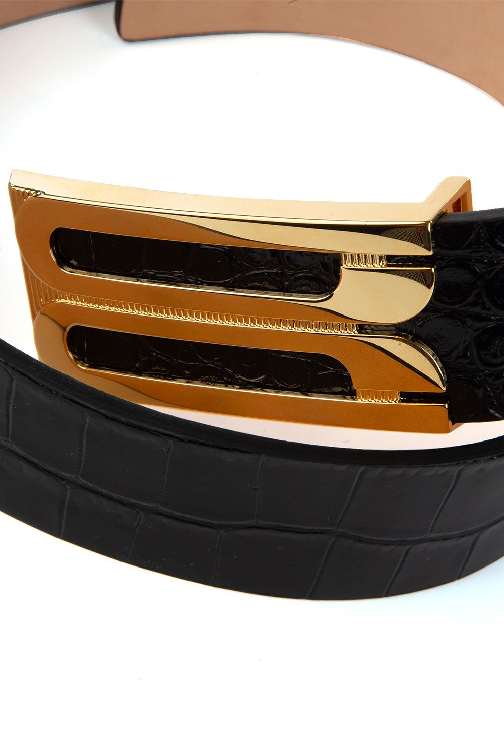 Cintura in pelle effetto coccodrillo nera, fibbia logo in metallo dorato frontale e regolabile, altezza 2.5 cm