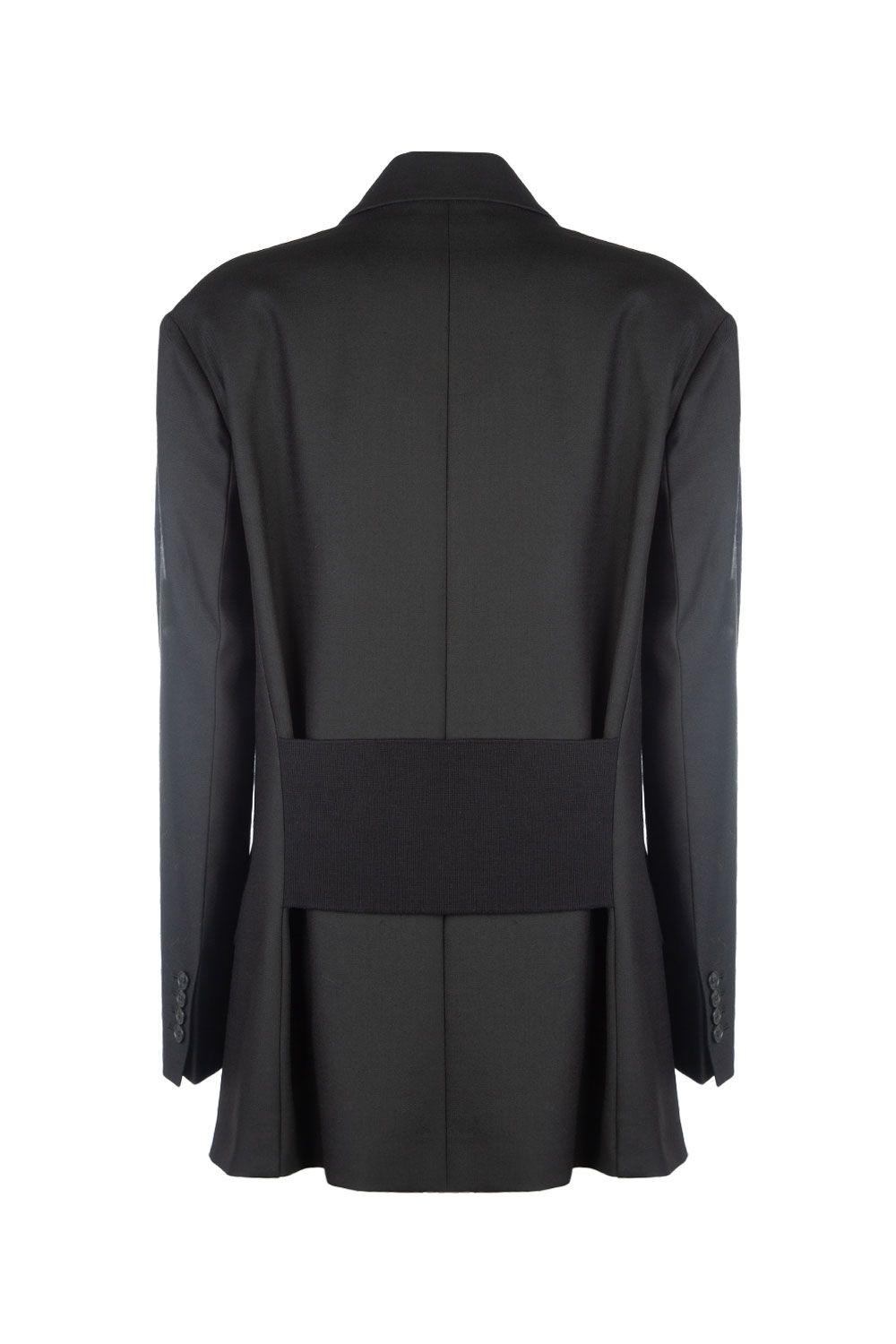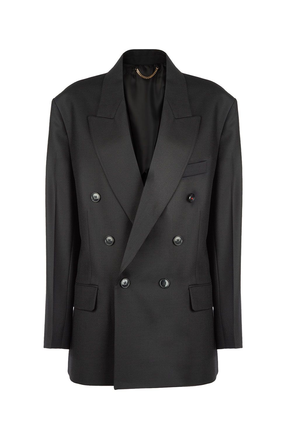 Giacca doppiopetto oversize in misto lana nera, tasche ad aletta, bottoni neri, tasca a filetto sul petto e martingala sul retro