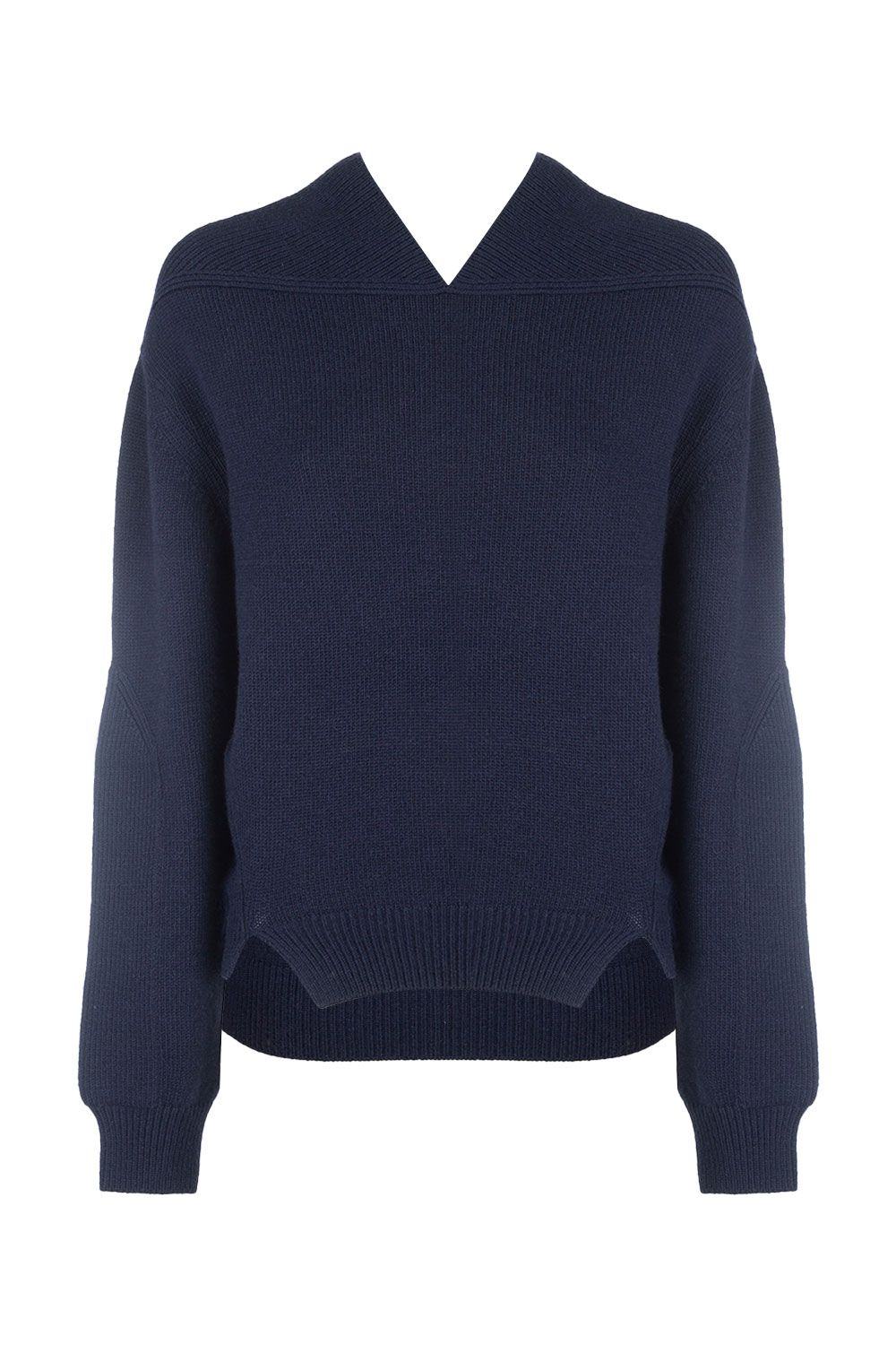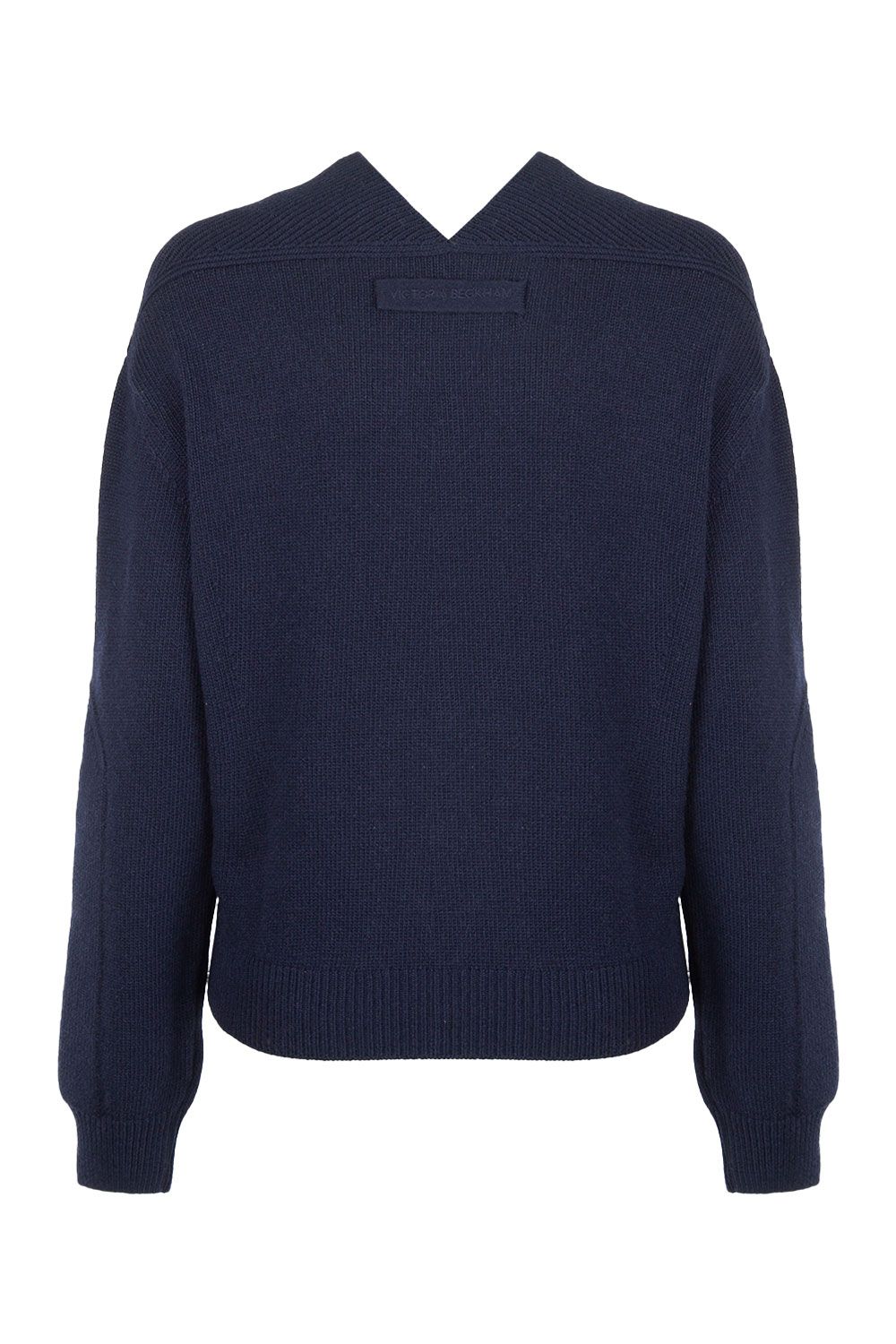 Maglia in misto lana e cashmere blu, spacchetti laterali, scollo a V a coste davanti e dietro, polsini e fondo a coste